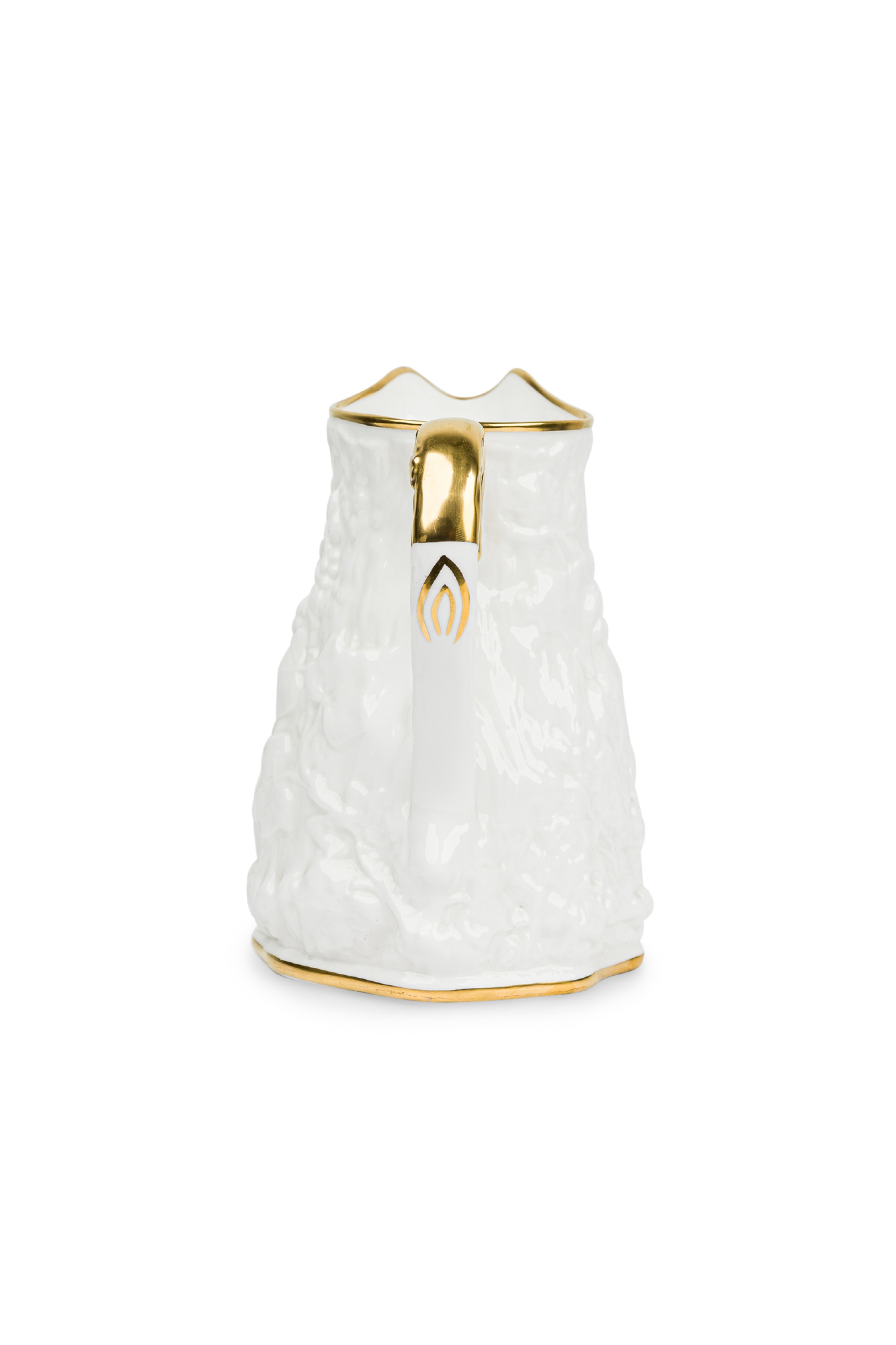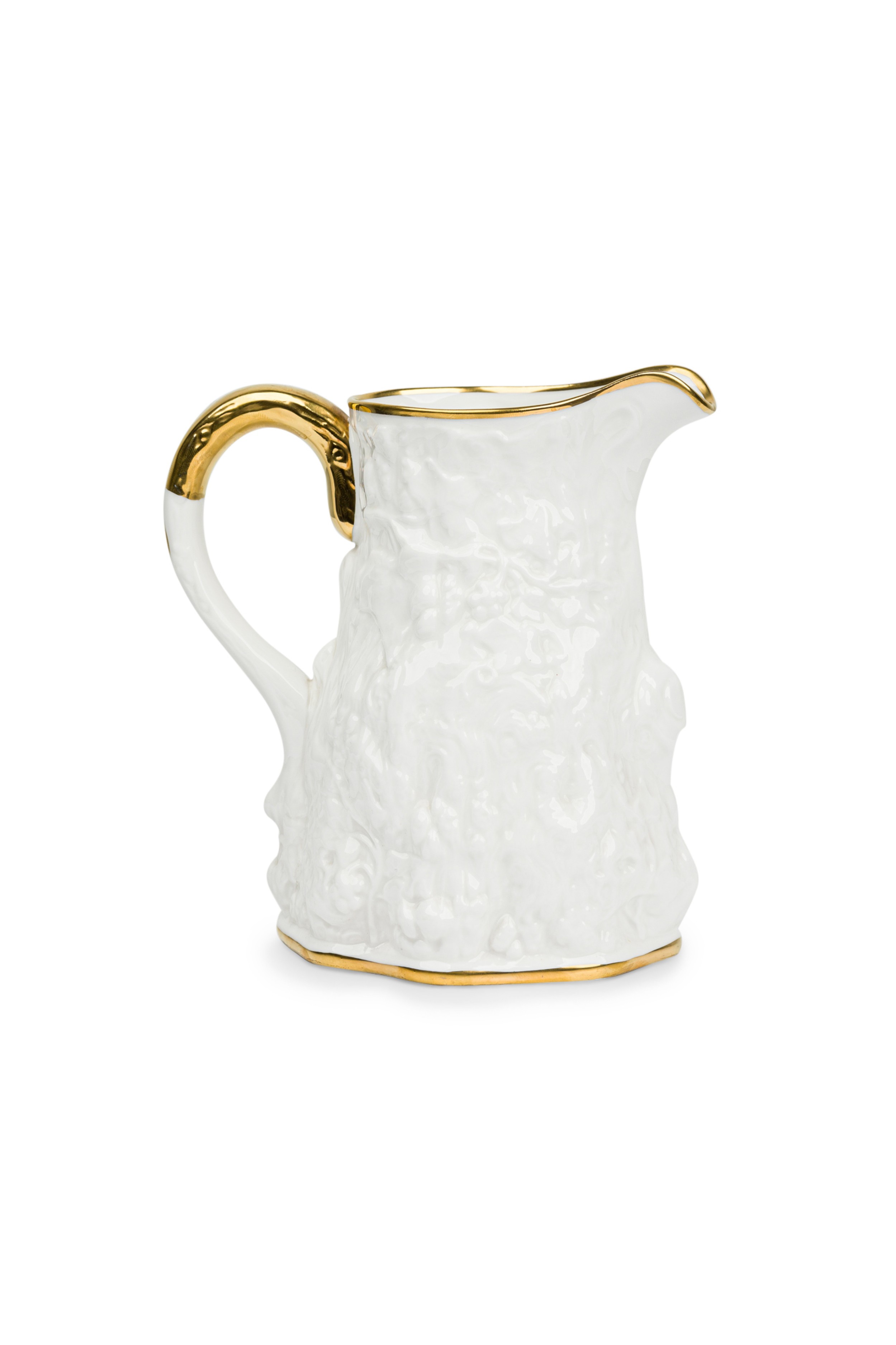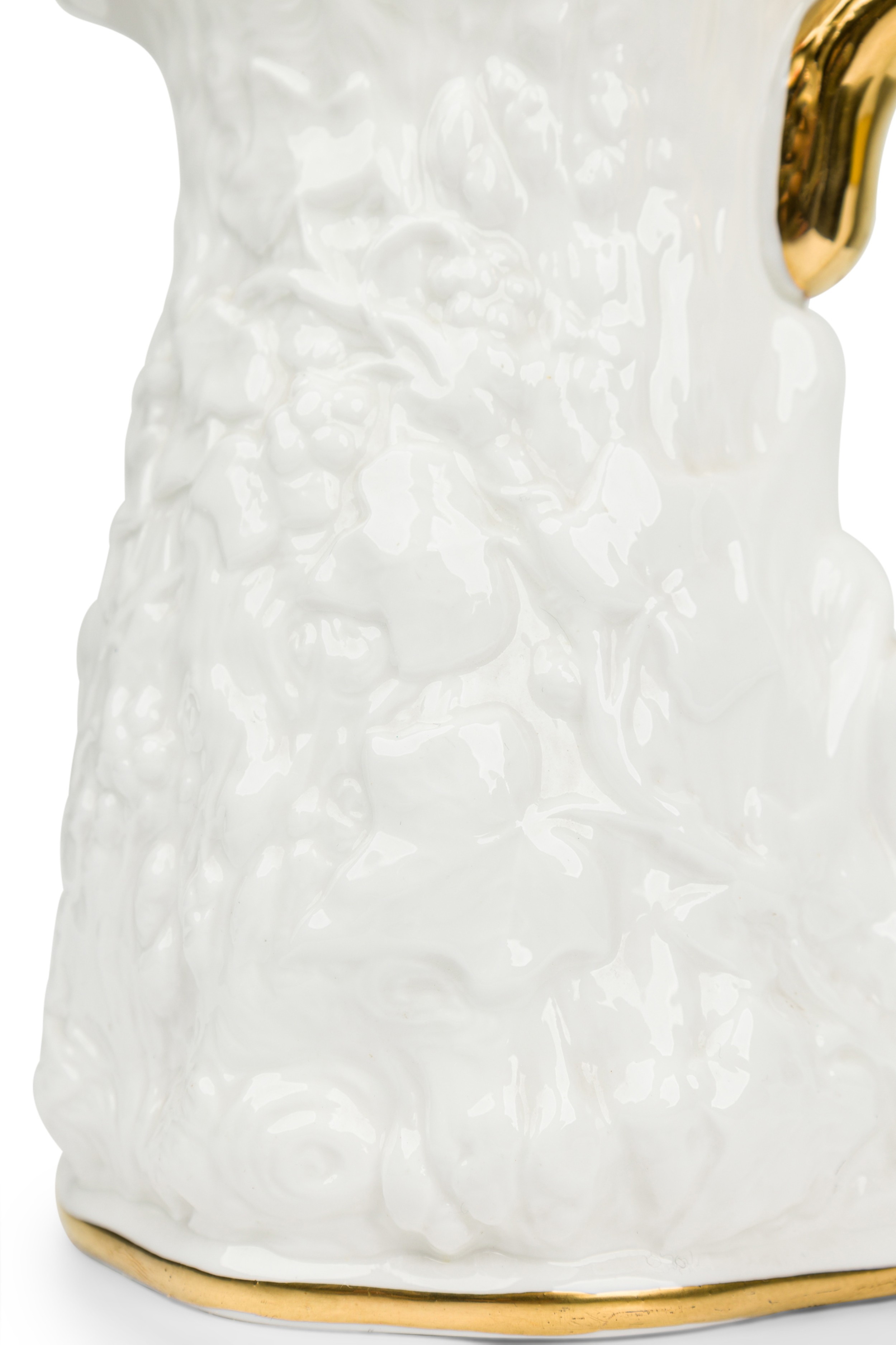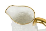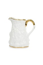 English Mid-Century white bone china porcelain water pitcher with a relief pattern having a gilt rim, base, and handle (ROYAL STAFFORD-"OLD ENGLISH OAK", Reg: #764261)