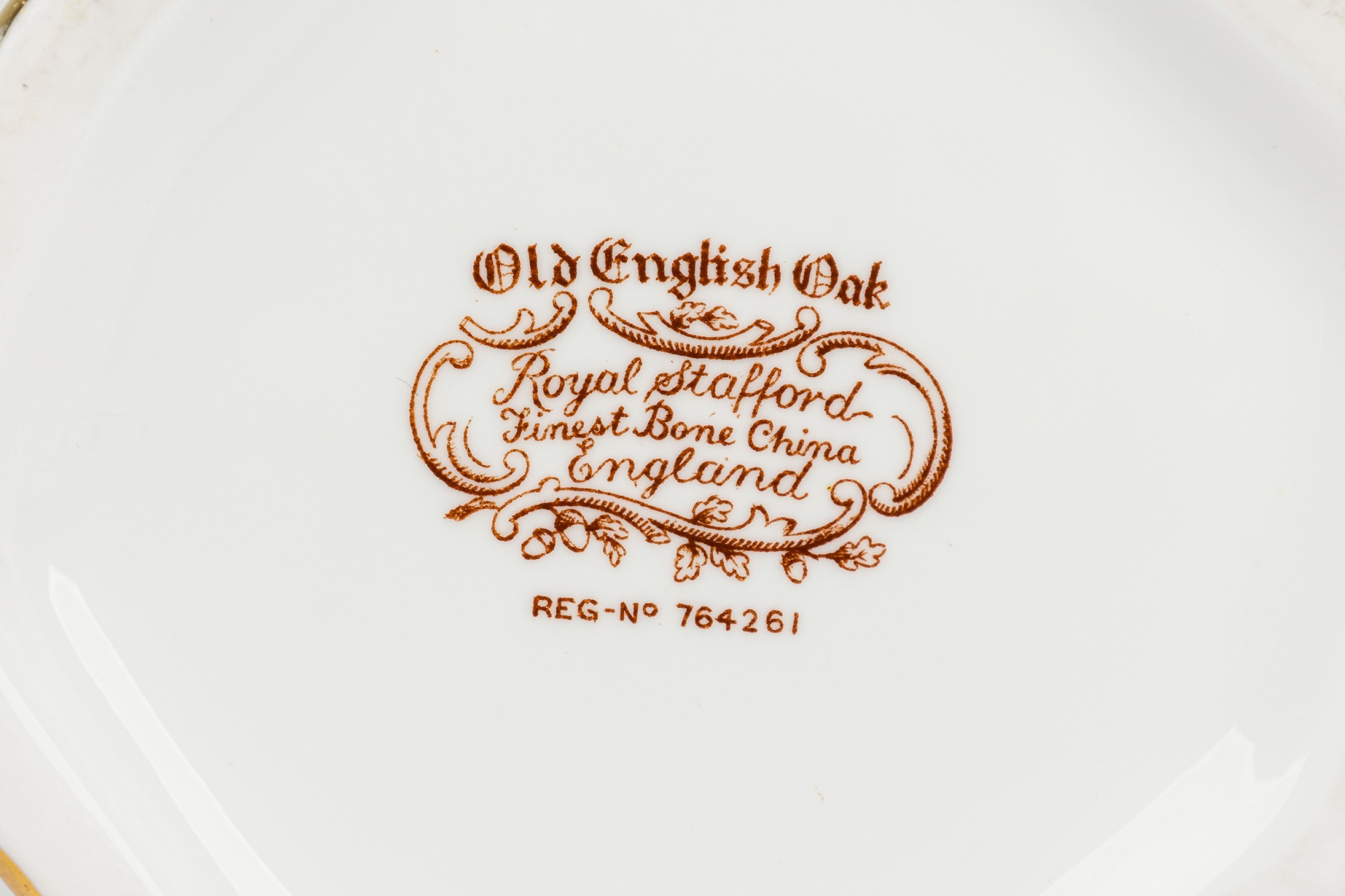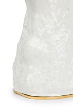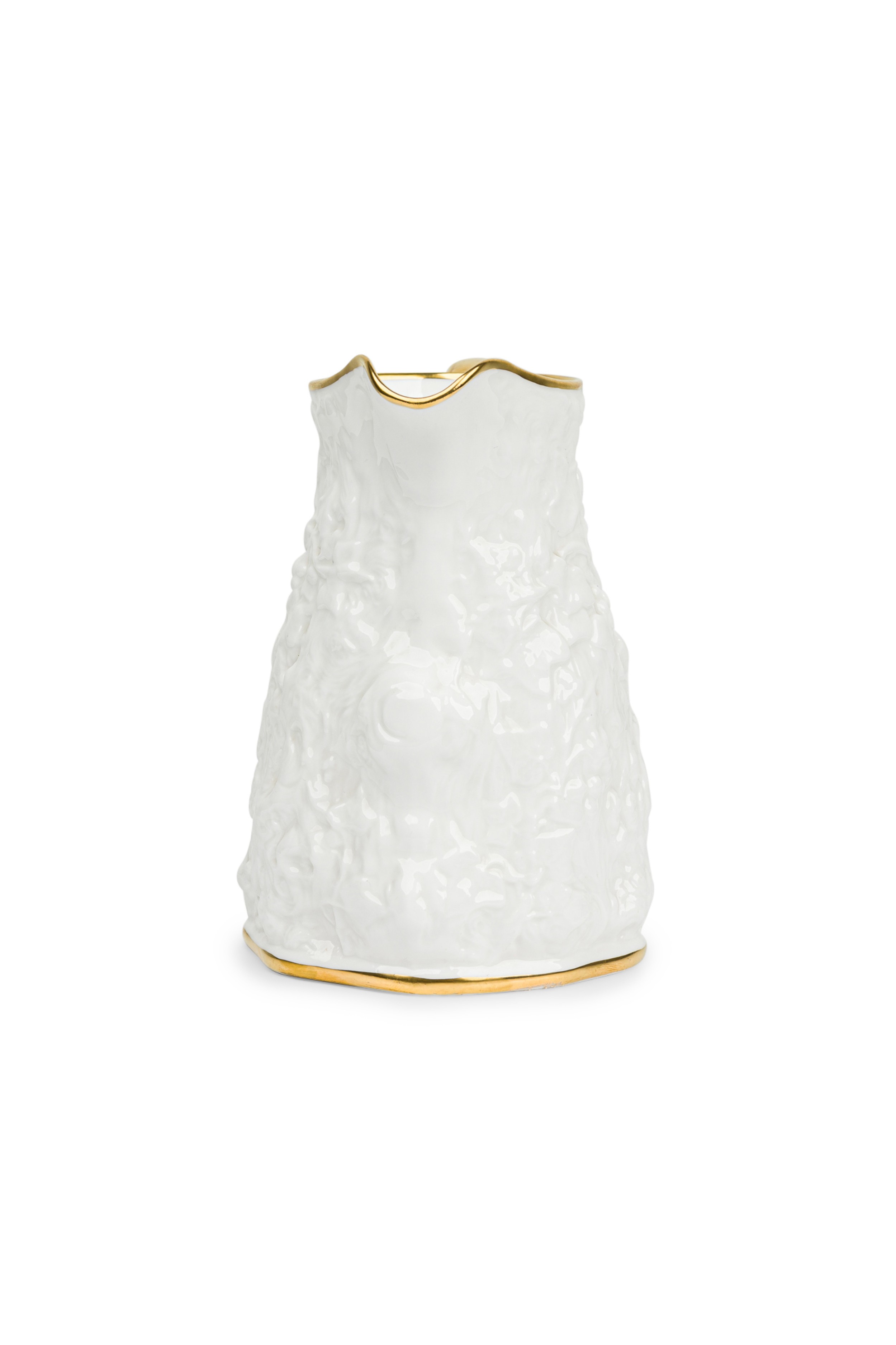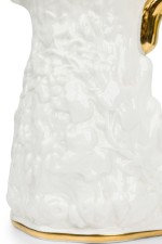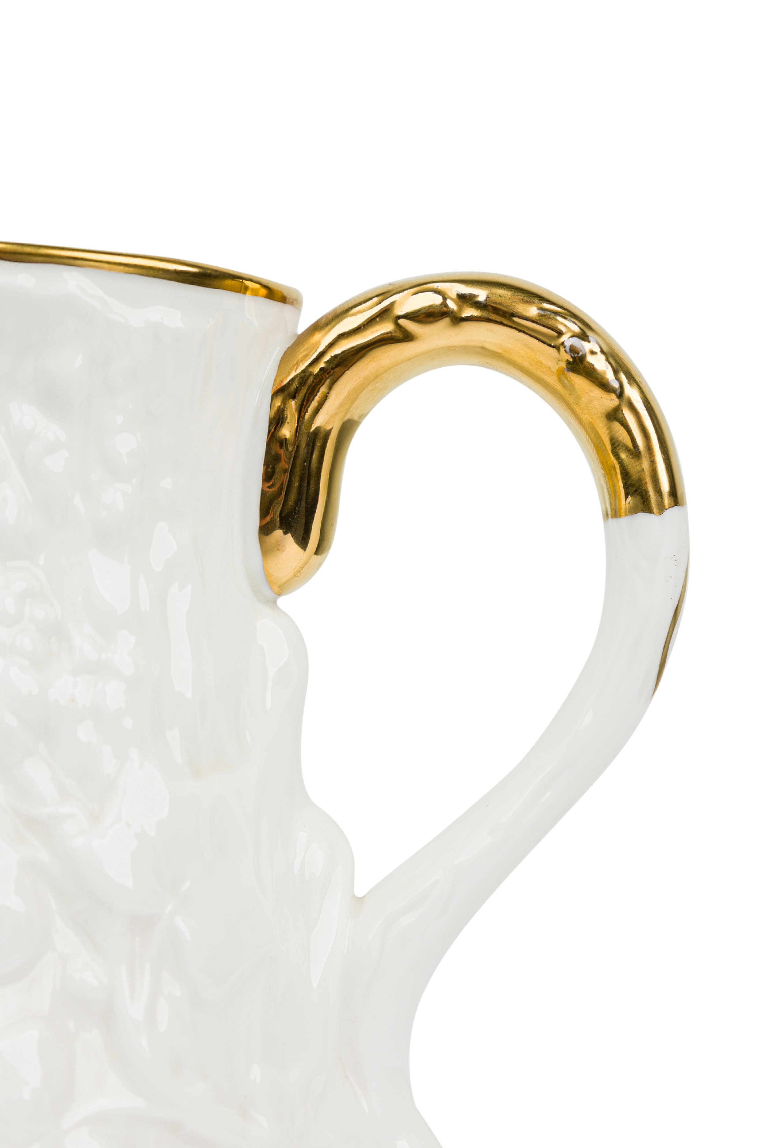 English Mid-Century white bone china porcelain water pitcher with a relief pattern having a gilt rim, base, and handle (ROYAL STAFFORD-"OLD ENGLISH OAK", Reg: #764261)