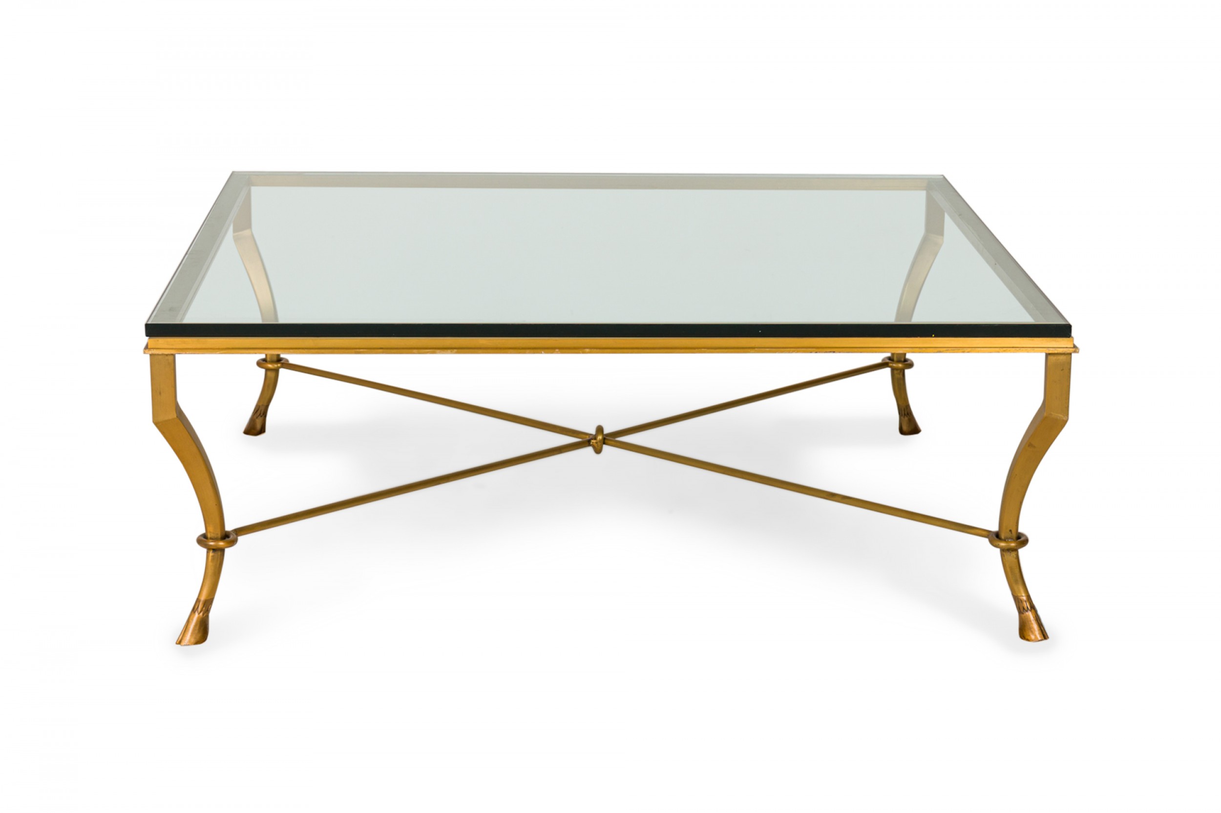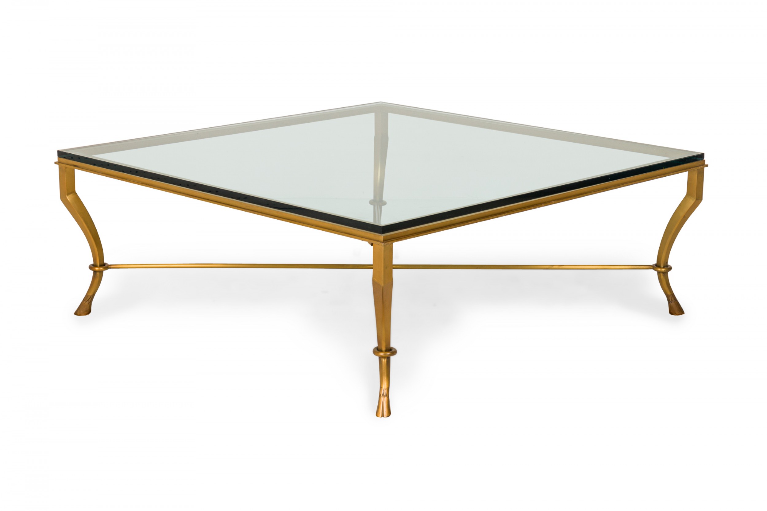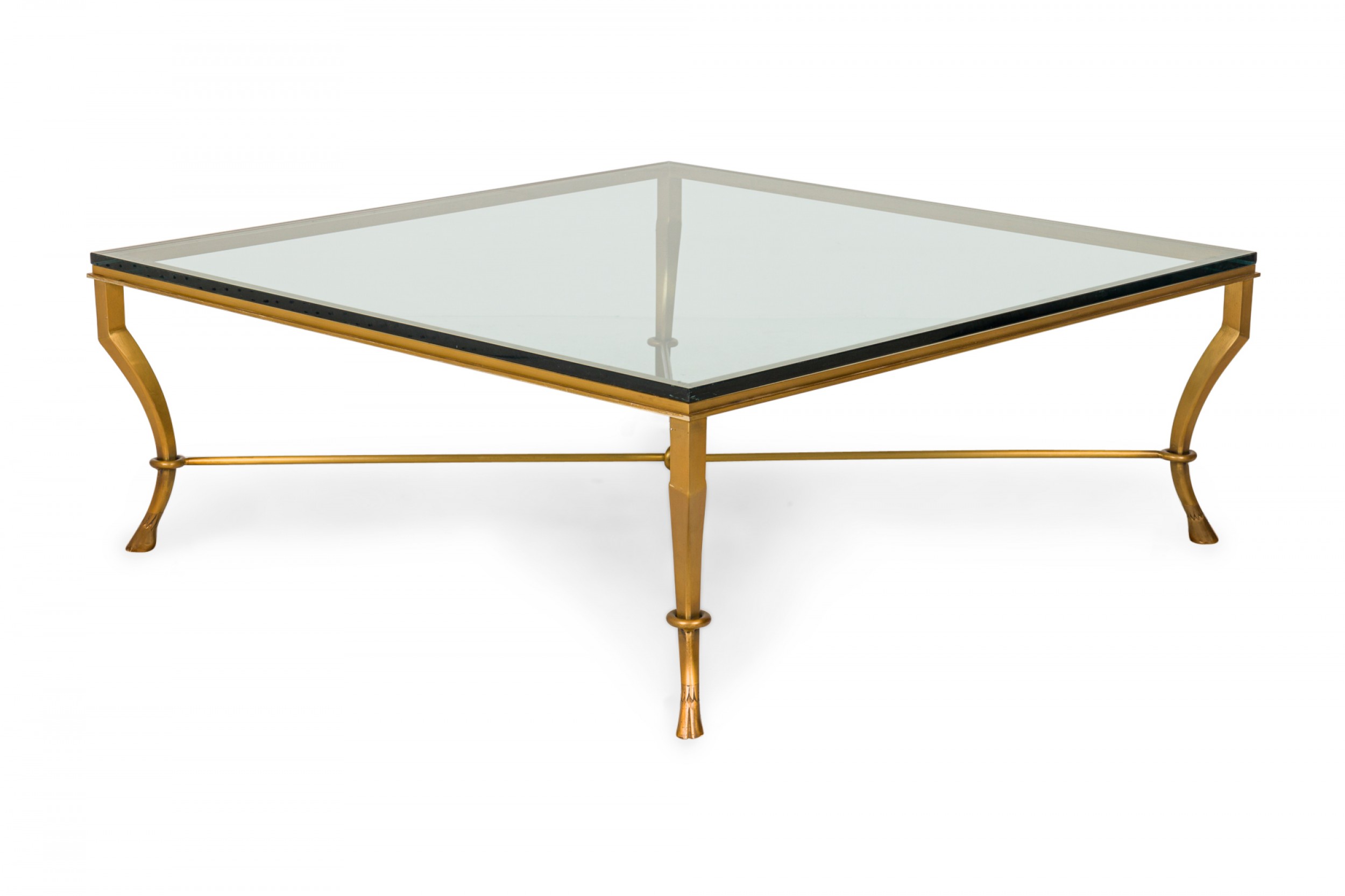 Mid-Century square coffee / cocktail table with a bronze frame with curved legs ending in hoof feet and an X-stretcher base, supporting a thick clear glass tabletop.