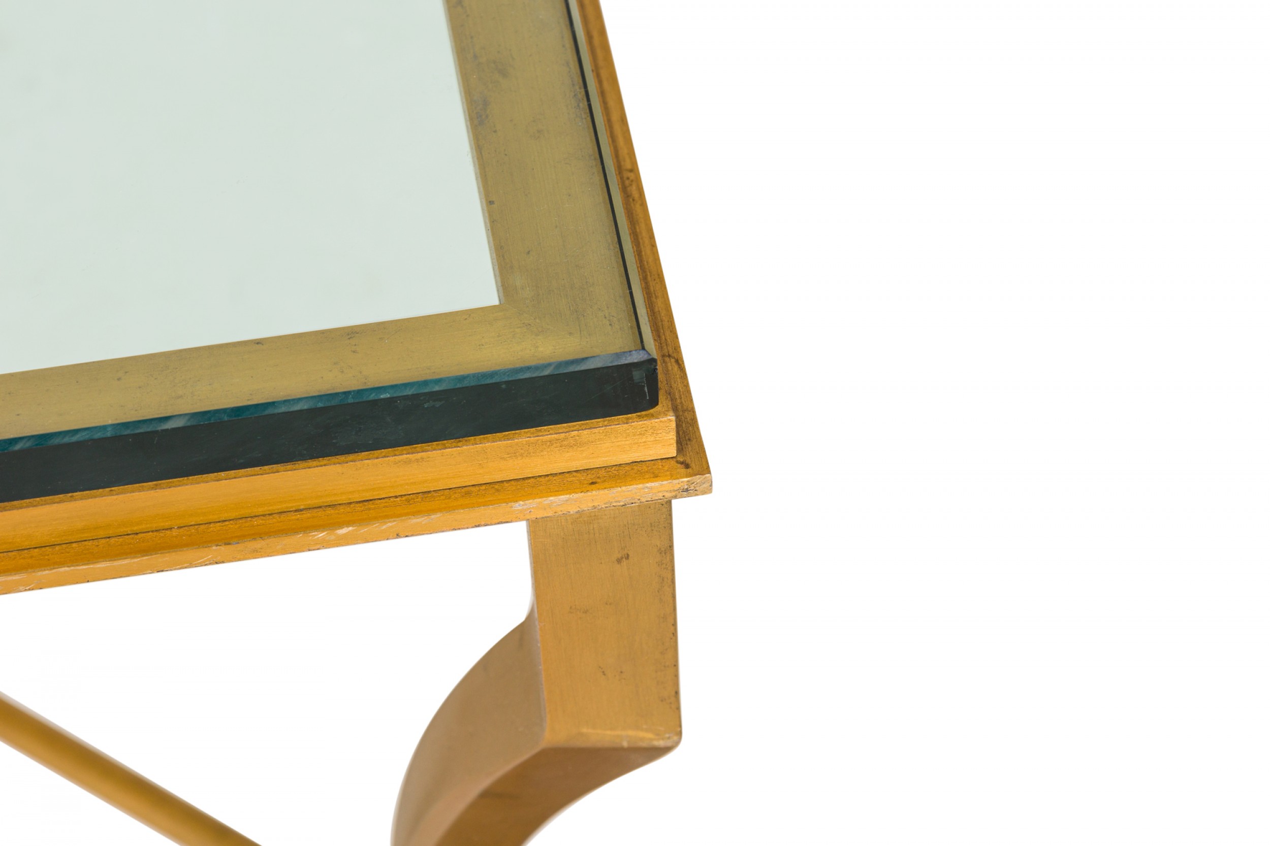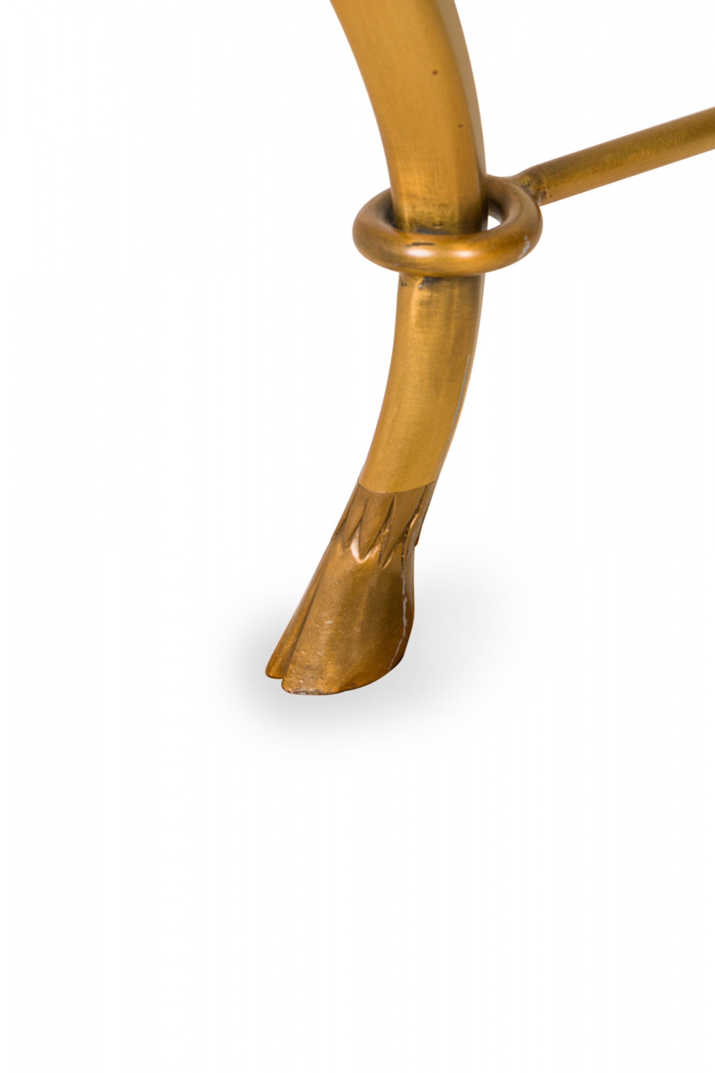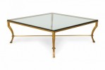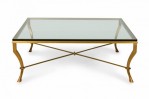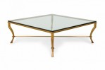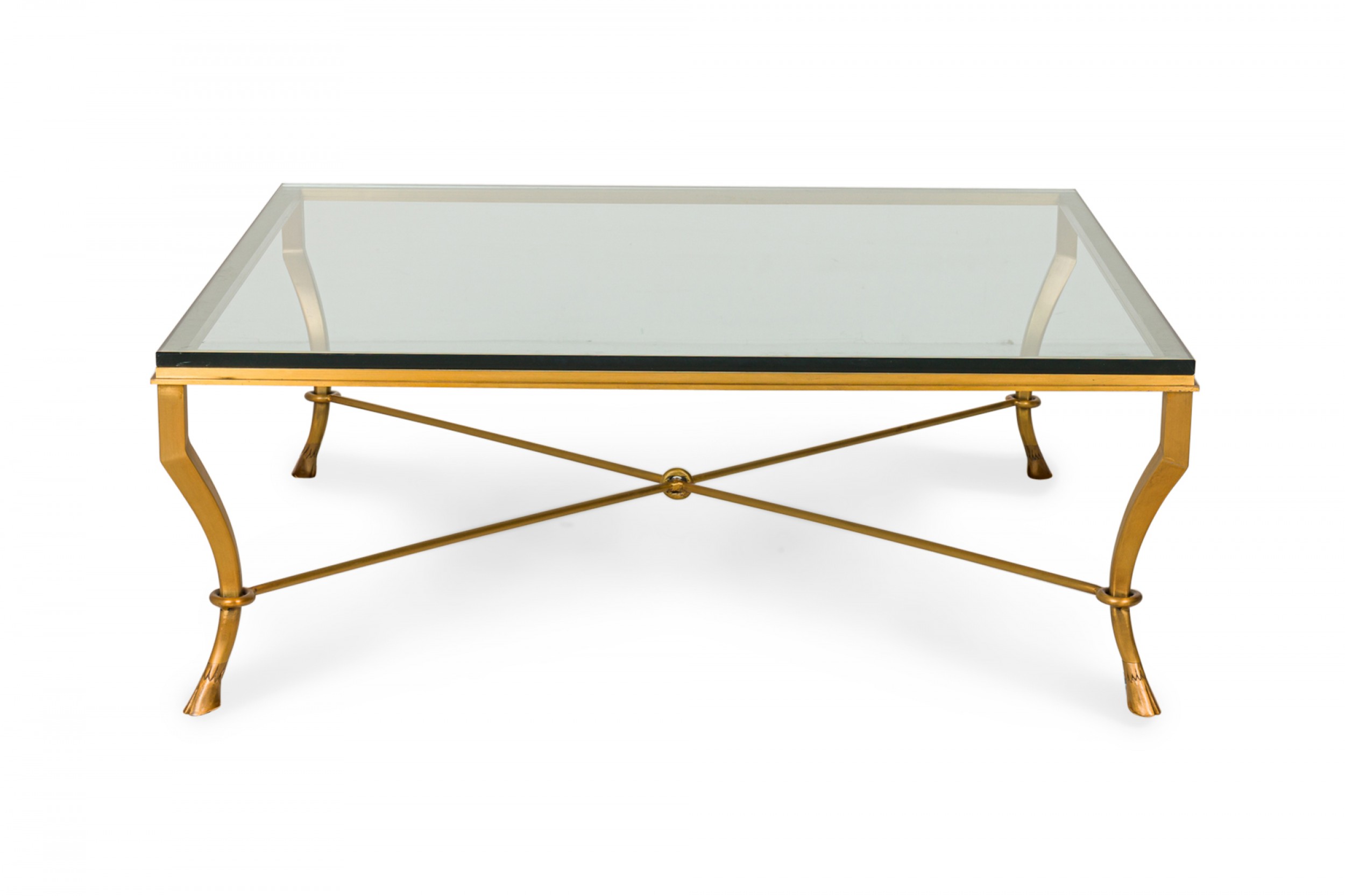 Mid-Century square coffee / cocktail table with a bronze frame with curved legs ending in hoof feet and an X-stretcher base, supporting a thick clear glass tabletop.