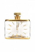 Mid-Century rectangular clear glass perfume bottle gilded on top and bottom, with a gilded raised clock face on front and a gilded stopper (possible by Five Past Midnight).