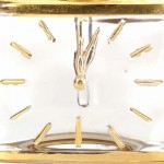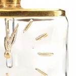 Mid-Century rectangular clear glass perfume bottle gilded on top and bottom, with a gilded raised clock face on front and a gilded stopper (possible by Five Past Midnight)
