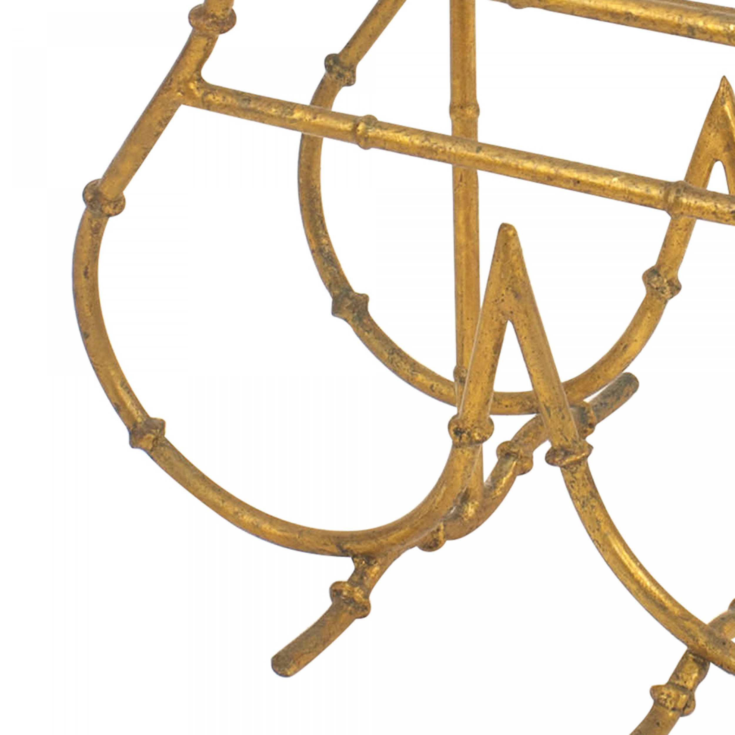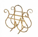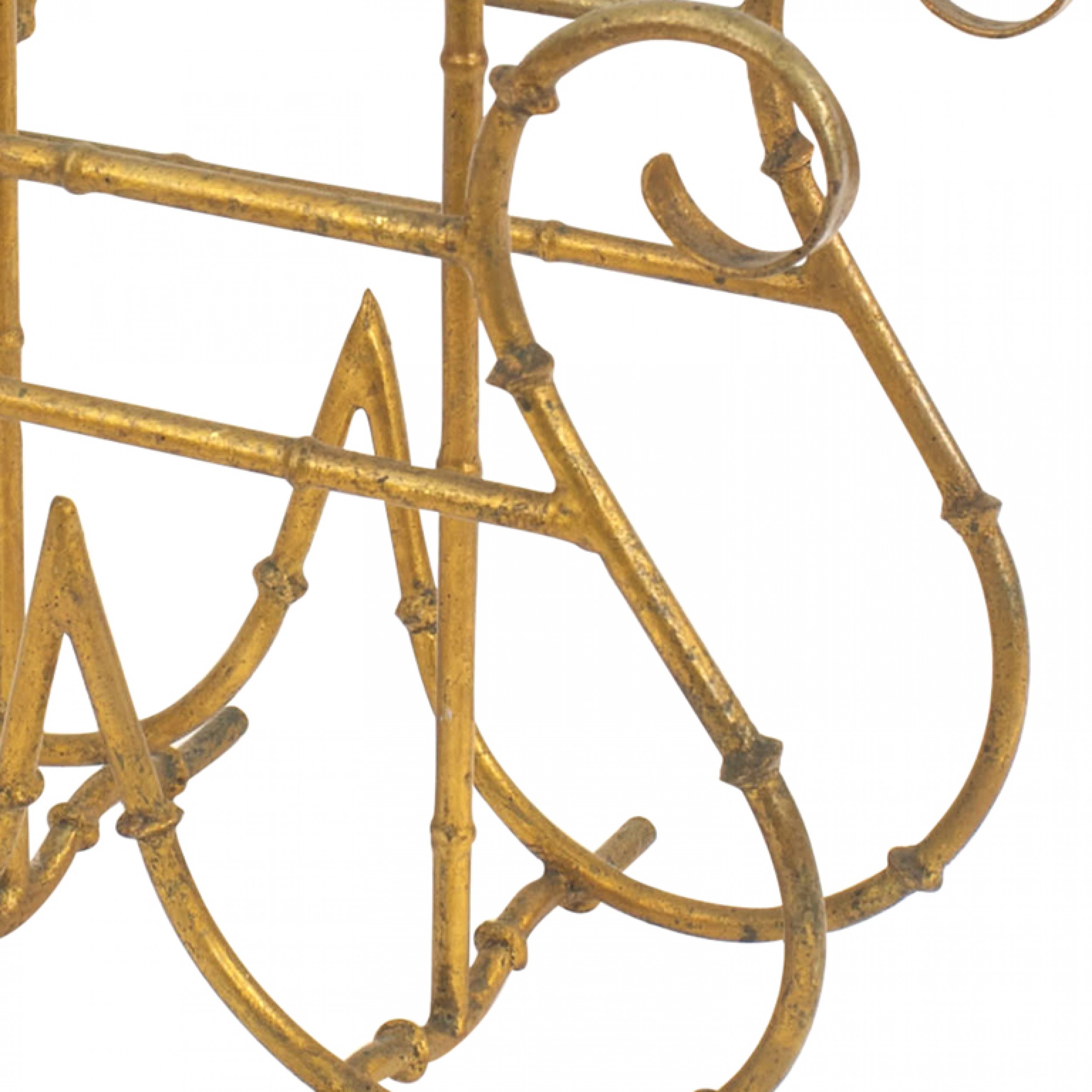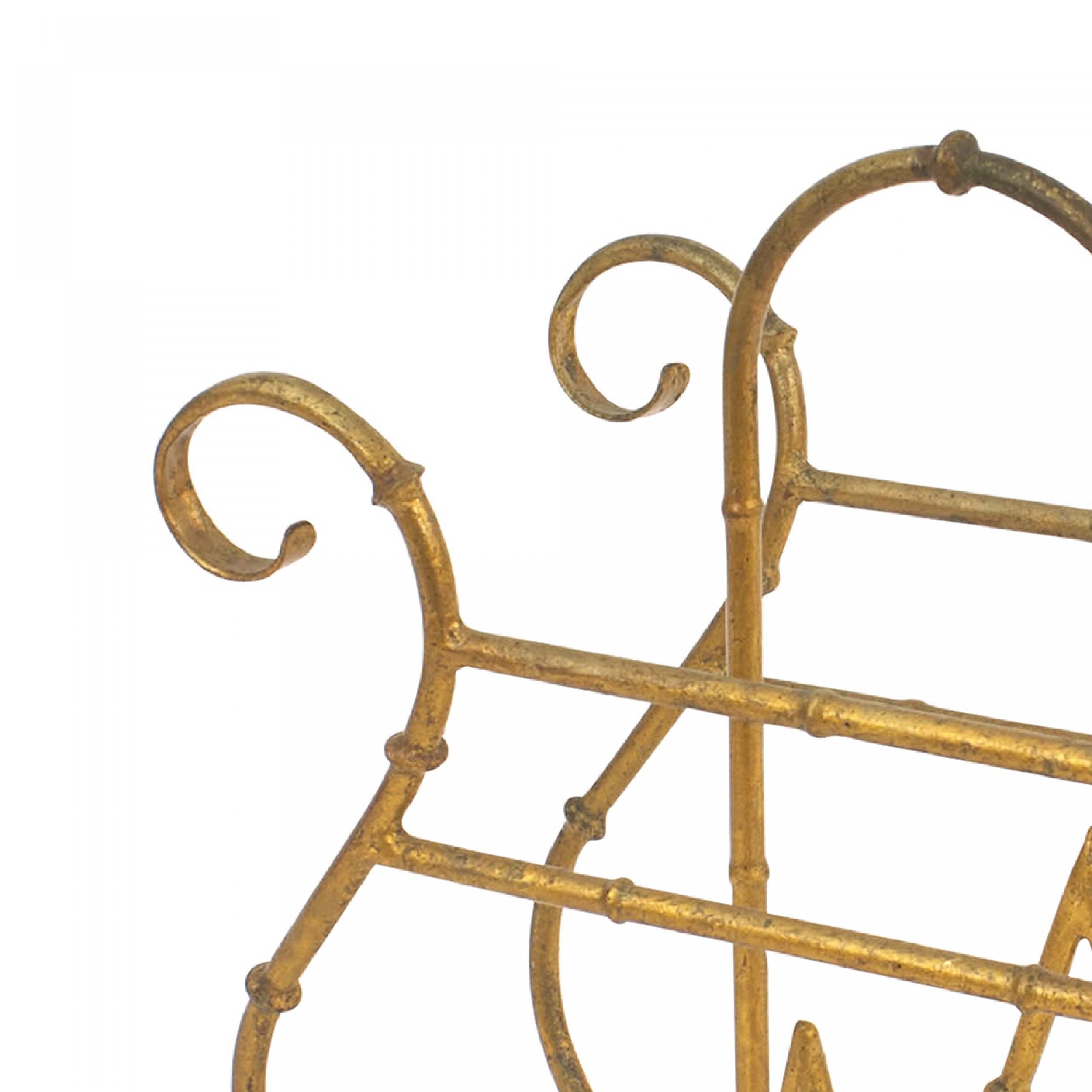 American Mid-Century "Hollywood Regency" (1950s) gilt metal faux bamboo magazine rack with lyre design.