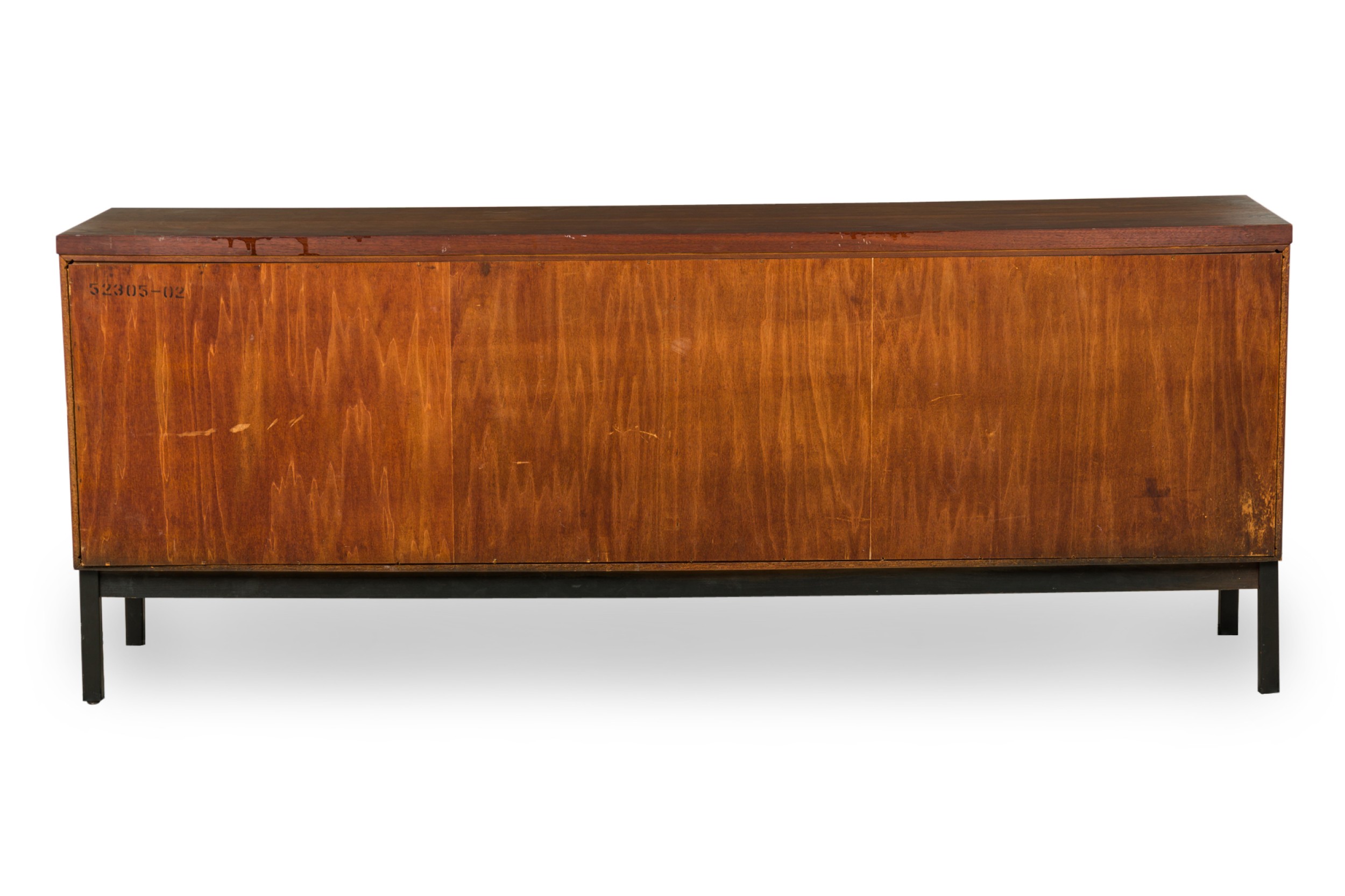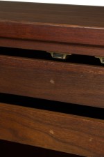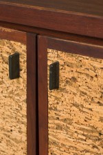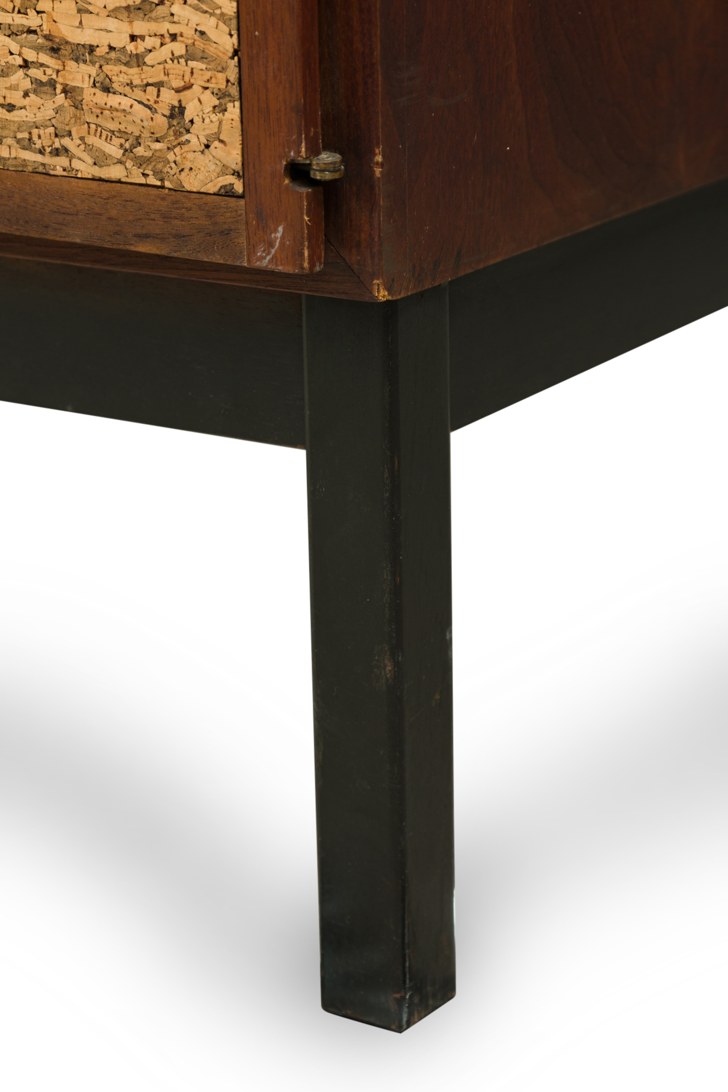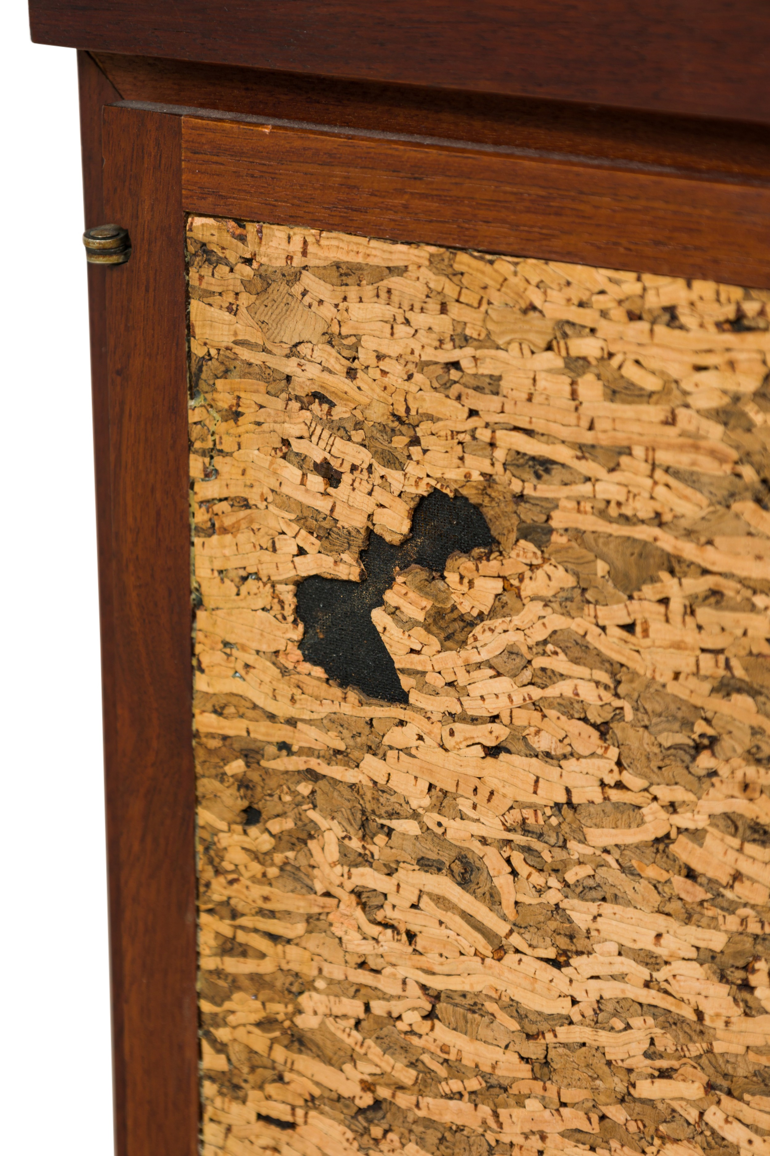 Style: Mid-Century Materials & Techniques: Bronze, cork, mahogany, metal, wood Category: Dining Room Condition: Wear to finish: wear and scratches to wood finish, one door has small loss to cork front. Good; Wear consistent with age and use