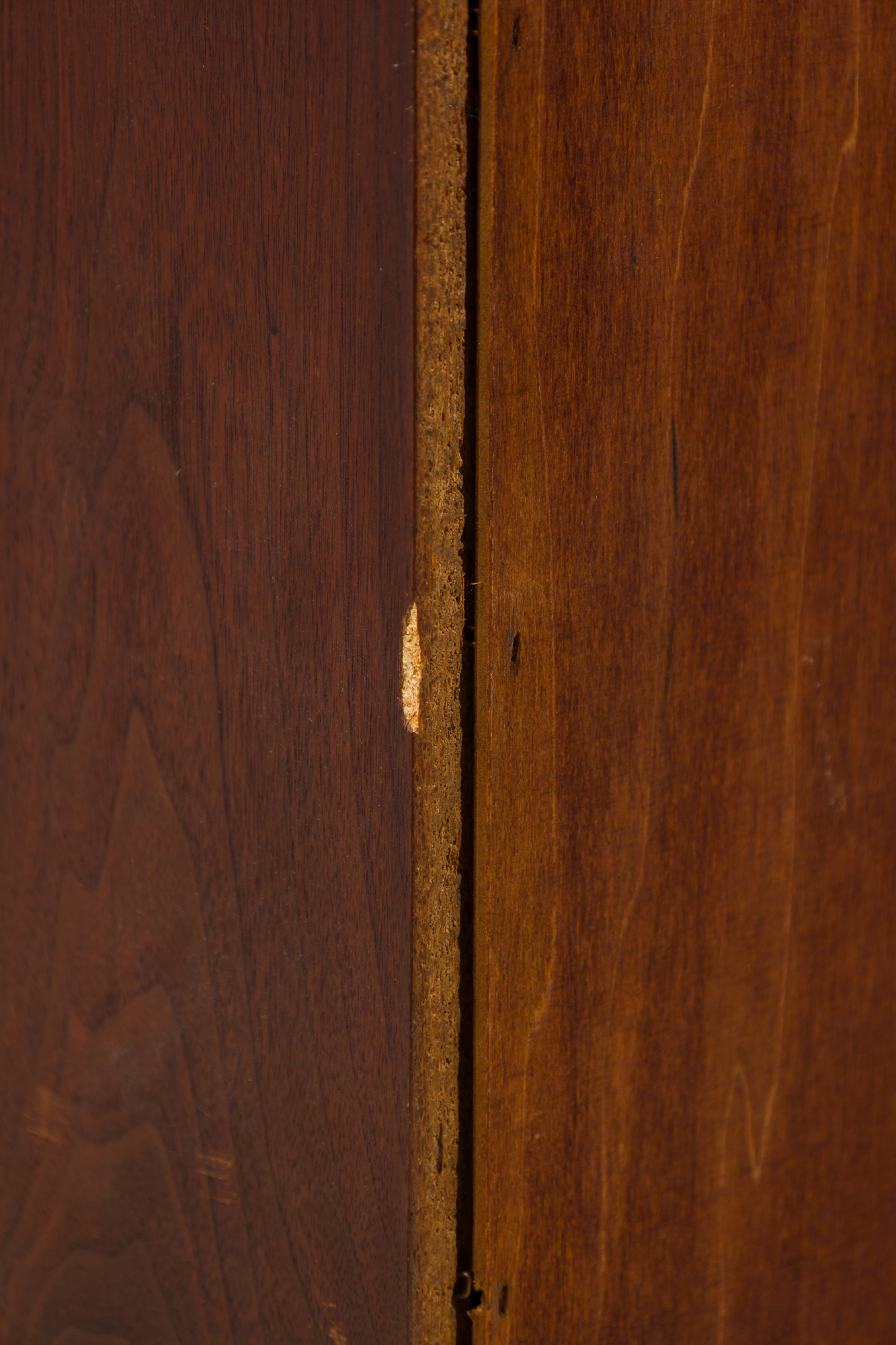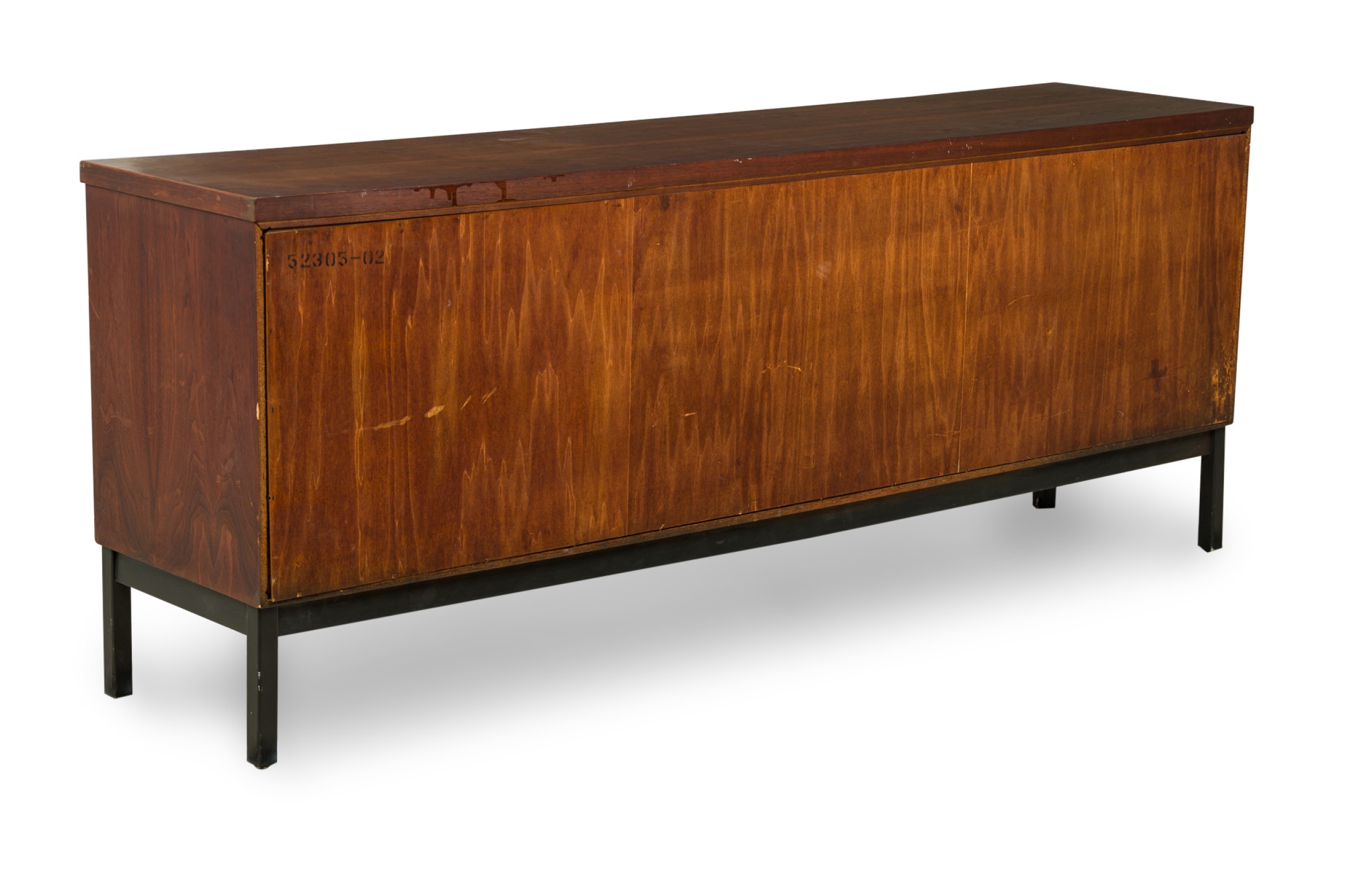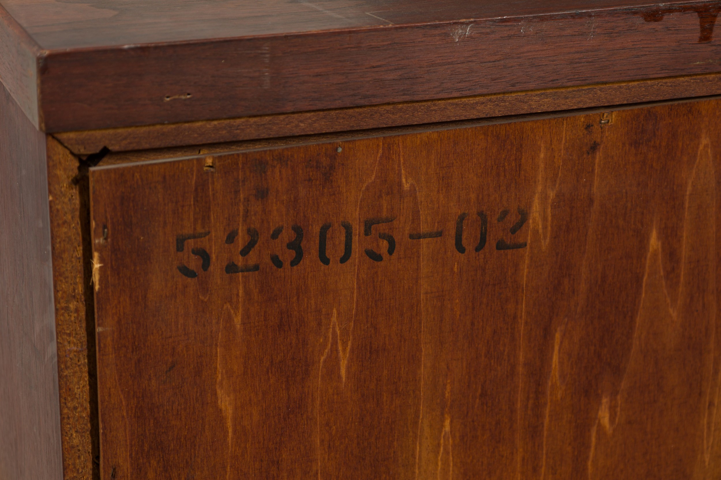 Style: Mid-Century Materials & Techniques: Bronze, cork, mahogany, metal, wood Category: Dining Room Condition: Wear to finish: wear and scratches to wood finish, one door has small loss to cork front. Good; Wear consistent with age and use