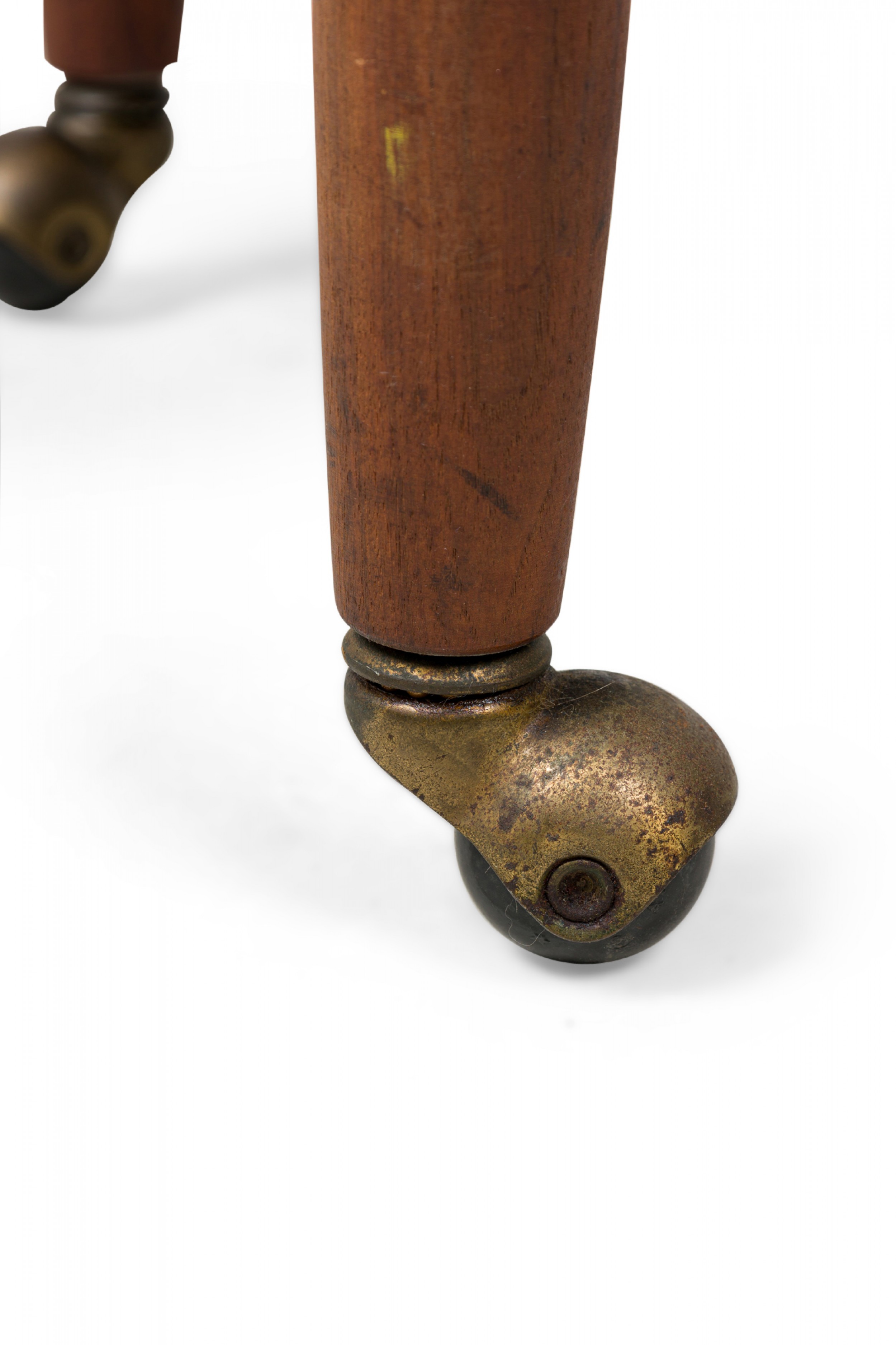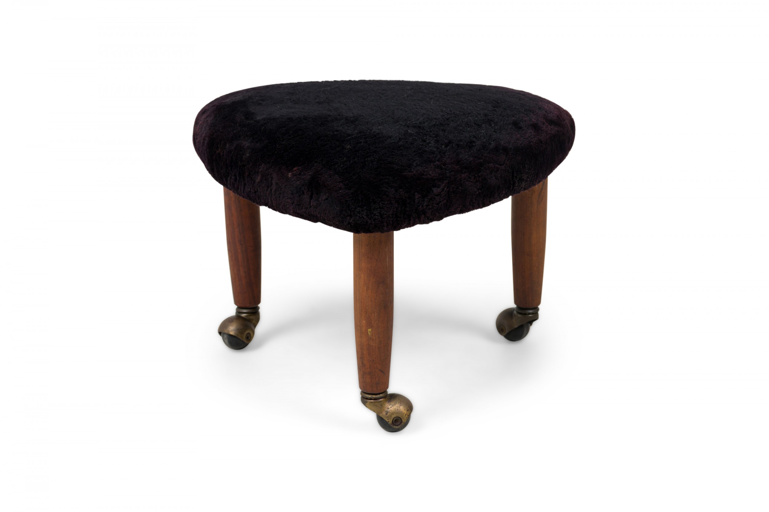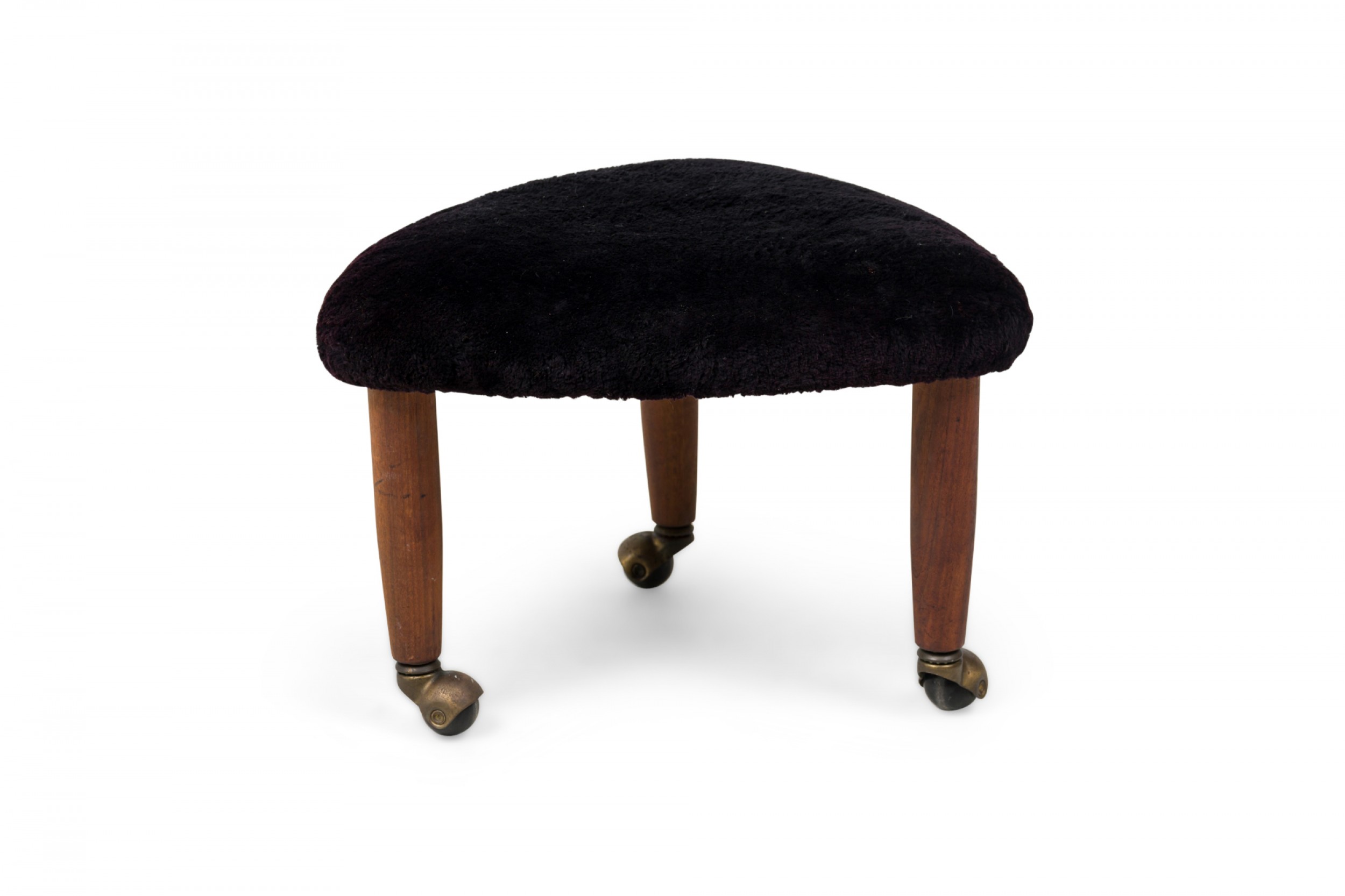 Mid-Century Italian Modern triangular footstool, upholstered in plush black velour, standing on 3 legs with brass casters. (manner of GIO PONTI)(Available in orange: REG4086 as a PAIR).
