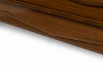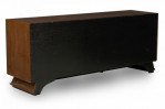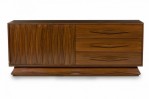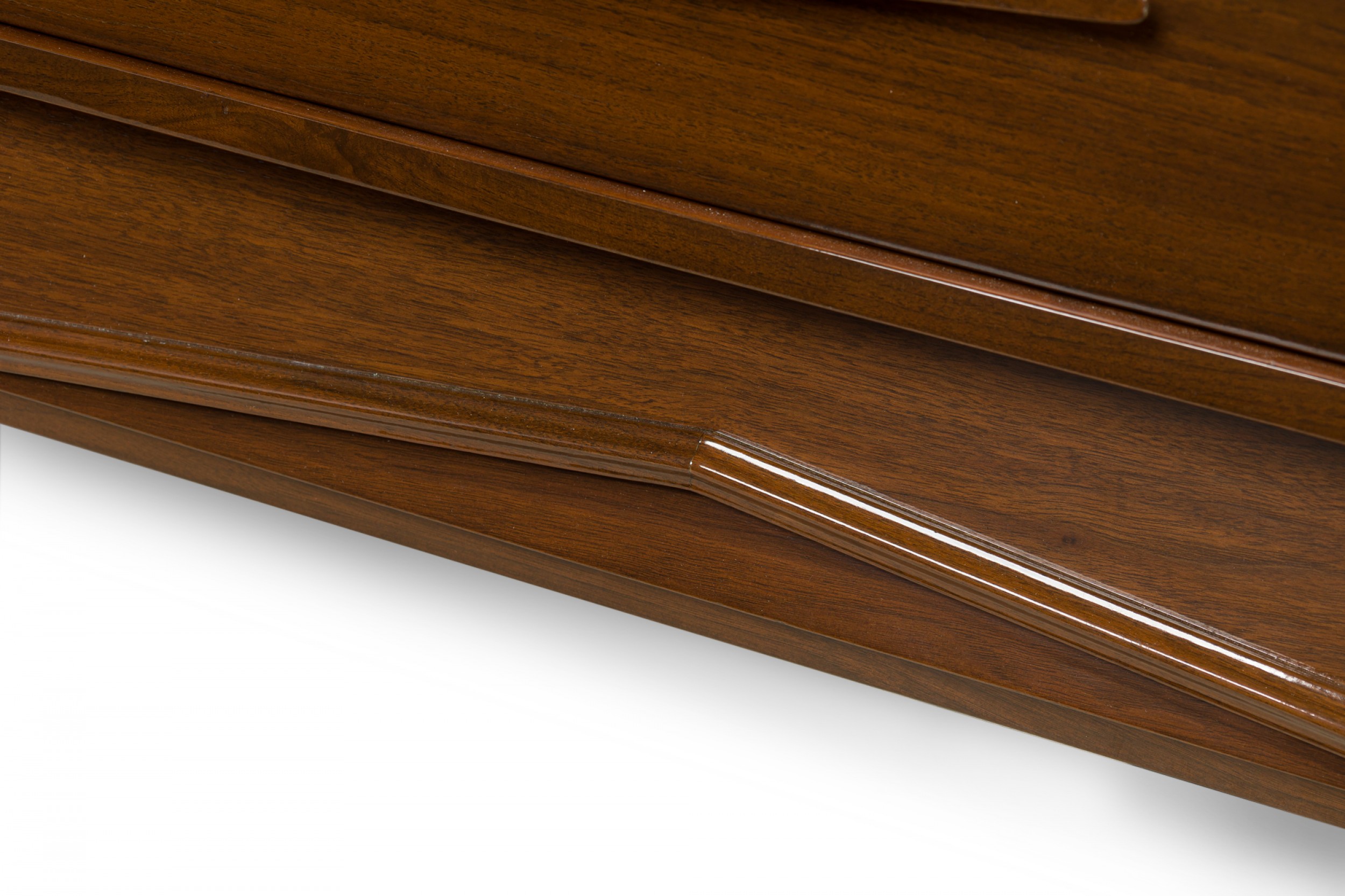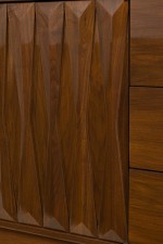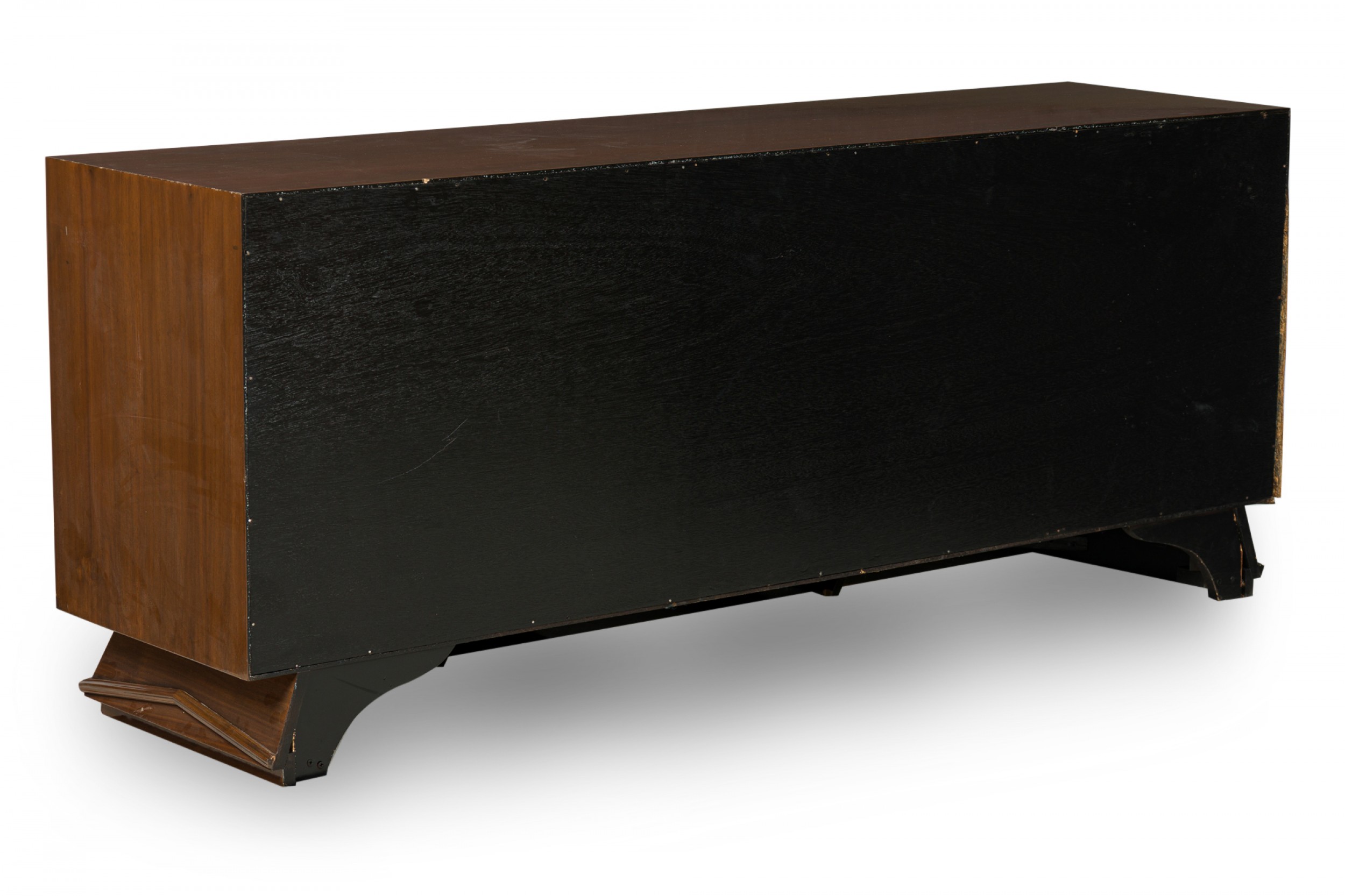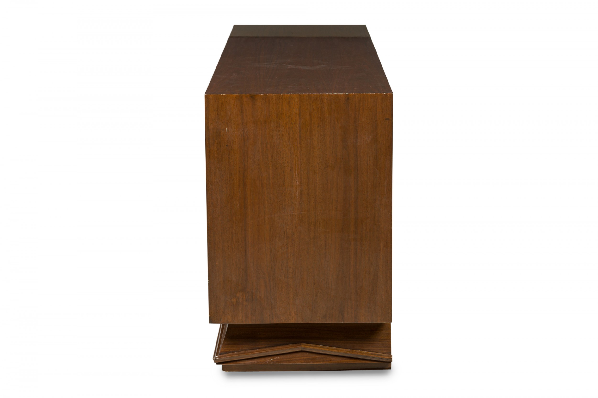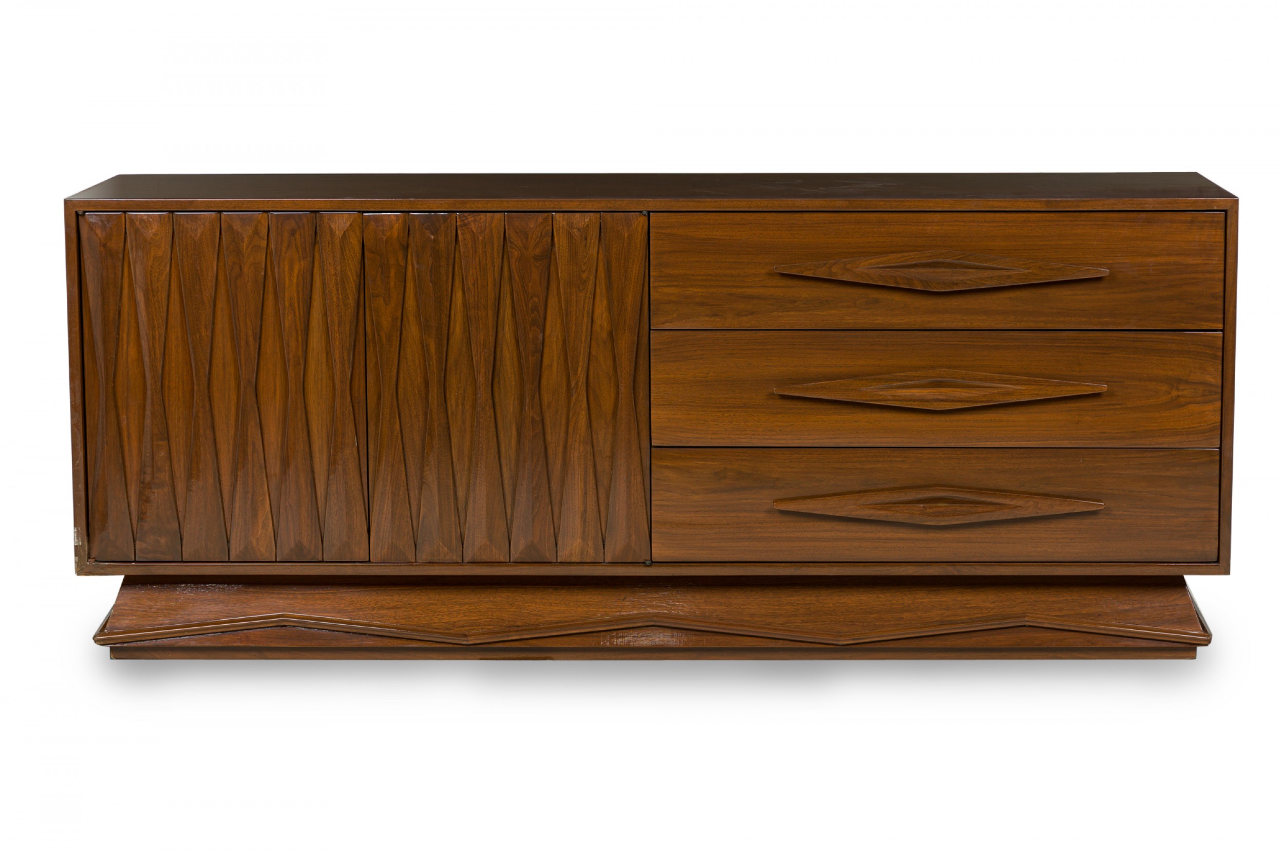 Italian Mid-Century Modern lacquered walnut sideboard with two geometric carved front breakfront cabinet doors to the left and three wide drawers with carved elongated diamond drawer pulls on the right resting on a trapezoidal base with a carved geometric design. (in the style of GIO PONTI).