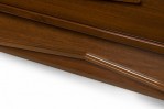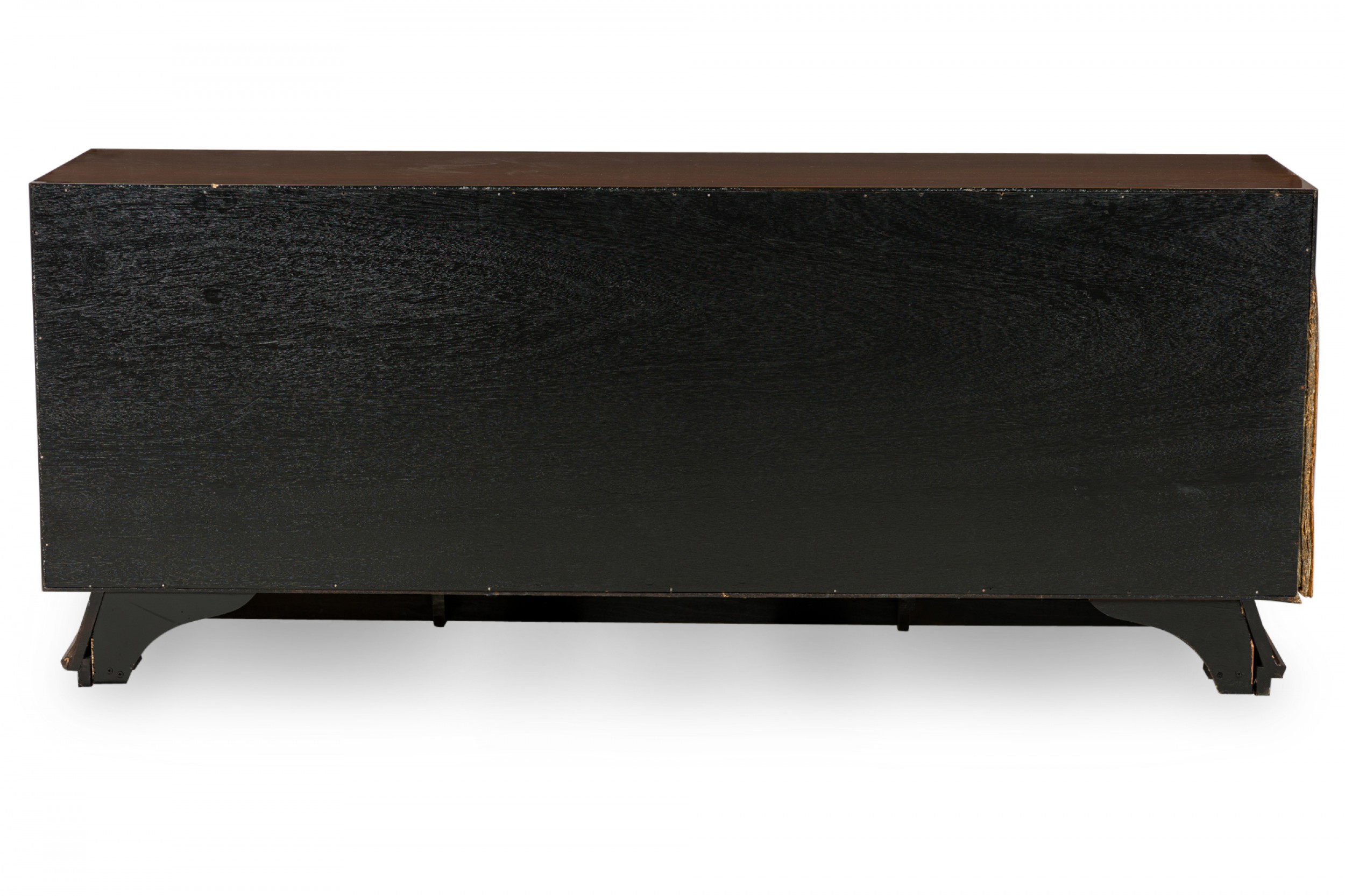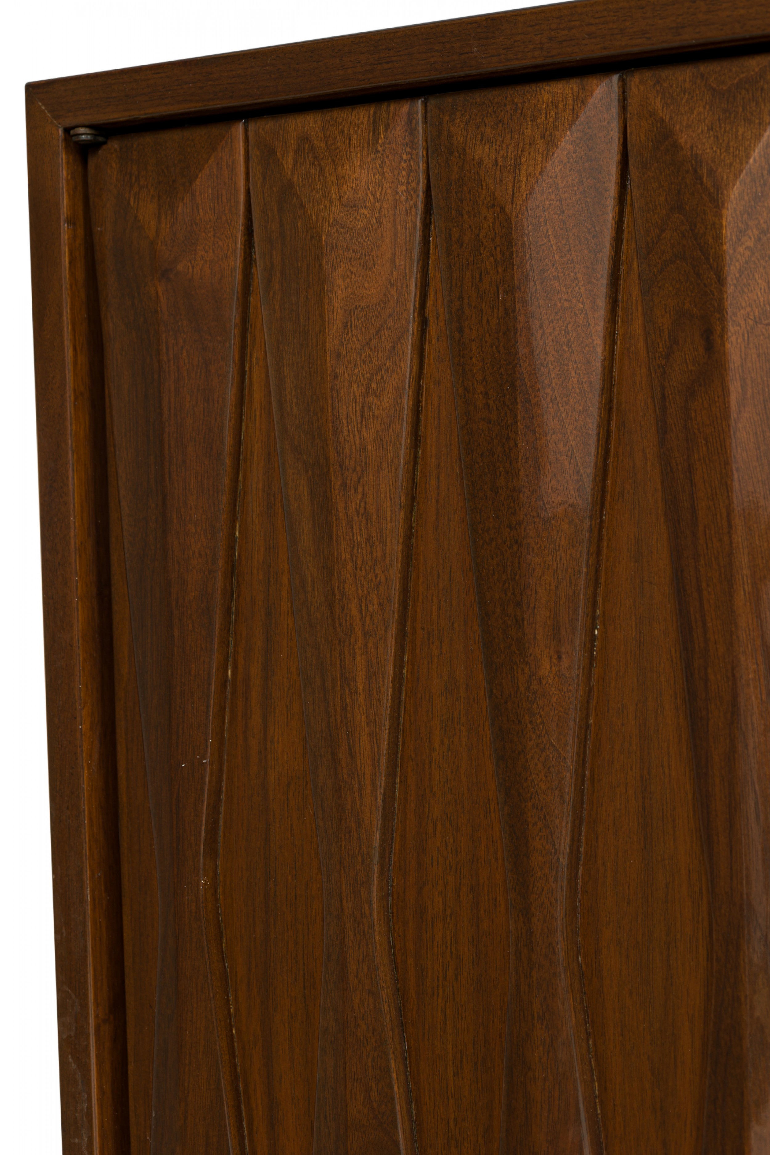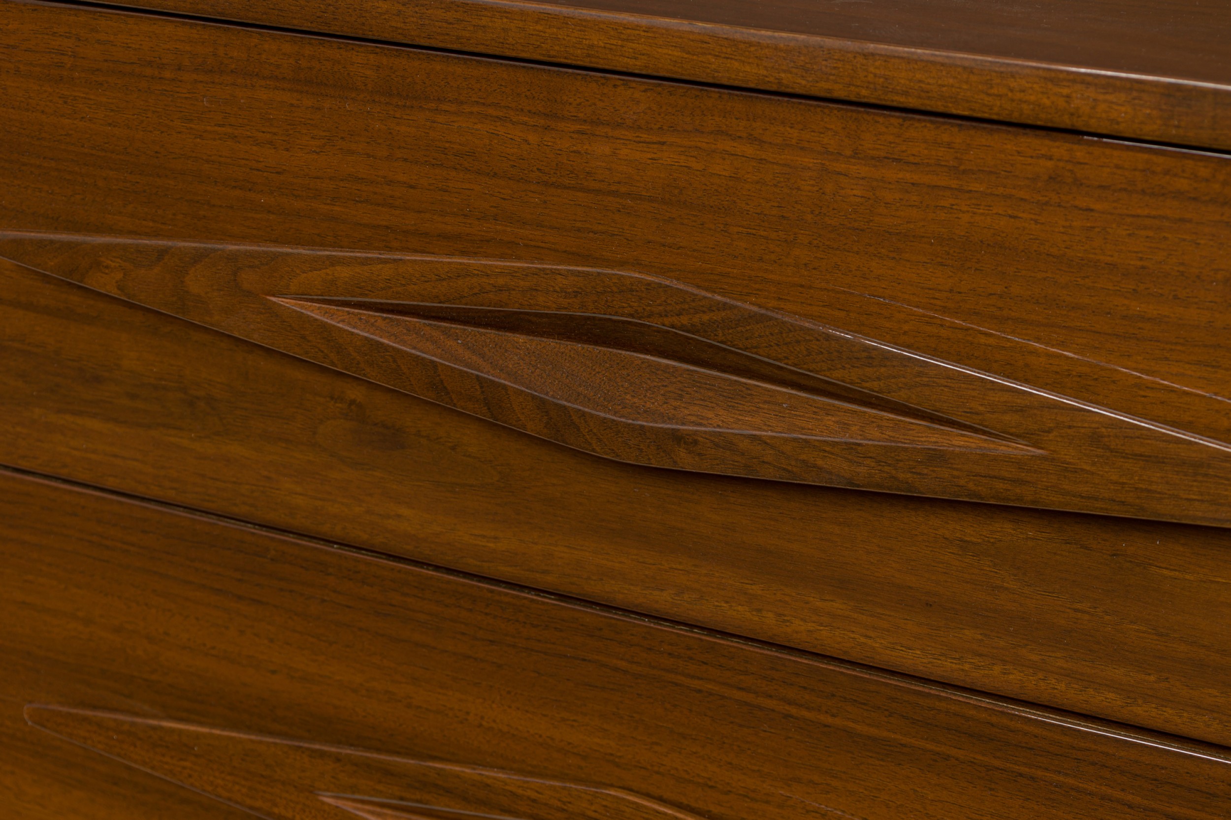 Italian Mid-Century Modern lacquered walnut sideboard with two geometric carved front breakfront cabinet doors to the left and three wide drawers with carved elongated diamond drawer pulls on the right resting on a trapezoidal base with a carved geometric design. (in the style of GIO PONTI)