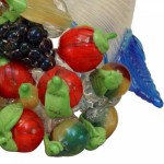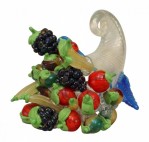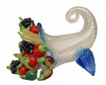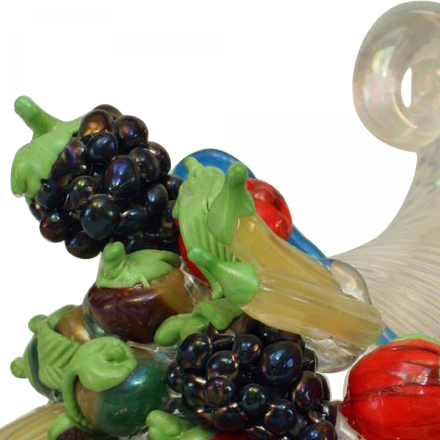 Italian 1930/40s Venetian Murano clear swirl design glass cornucopia ornament with multicolored glass fruit and vegetables with 2 blue leaves (as is-repair).