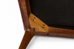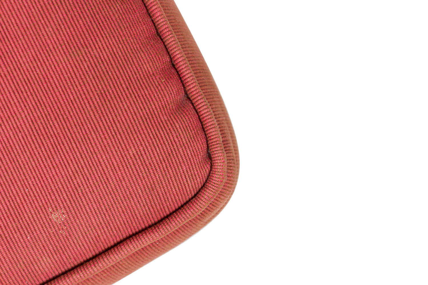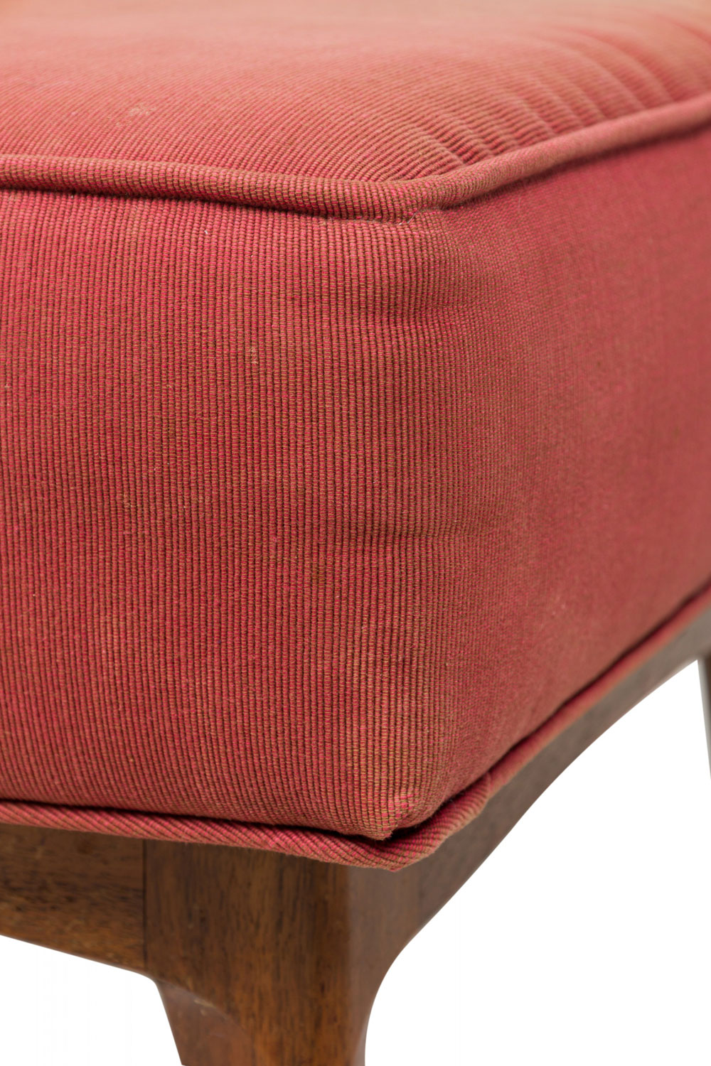 Mid-Century Italian walnut rectangular ottoman with muted red fabric upholstered seat and piping, standing on four tapered legs.