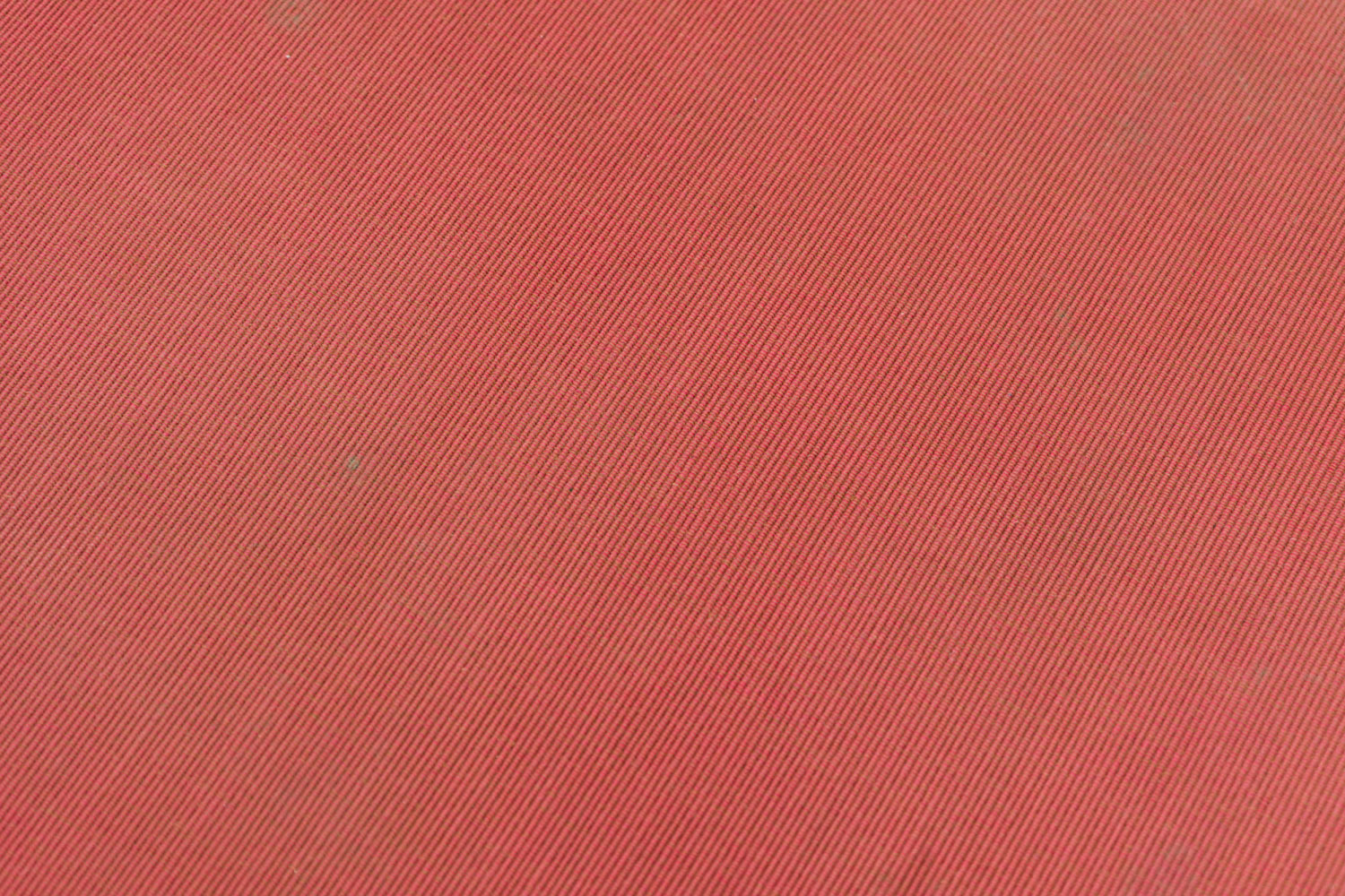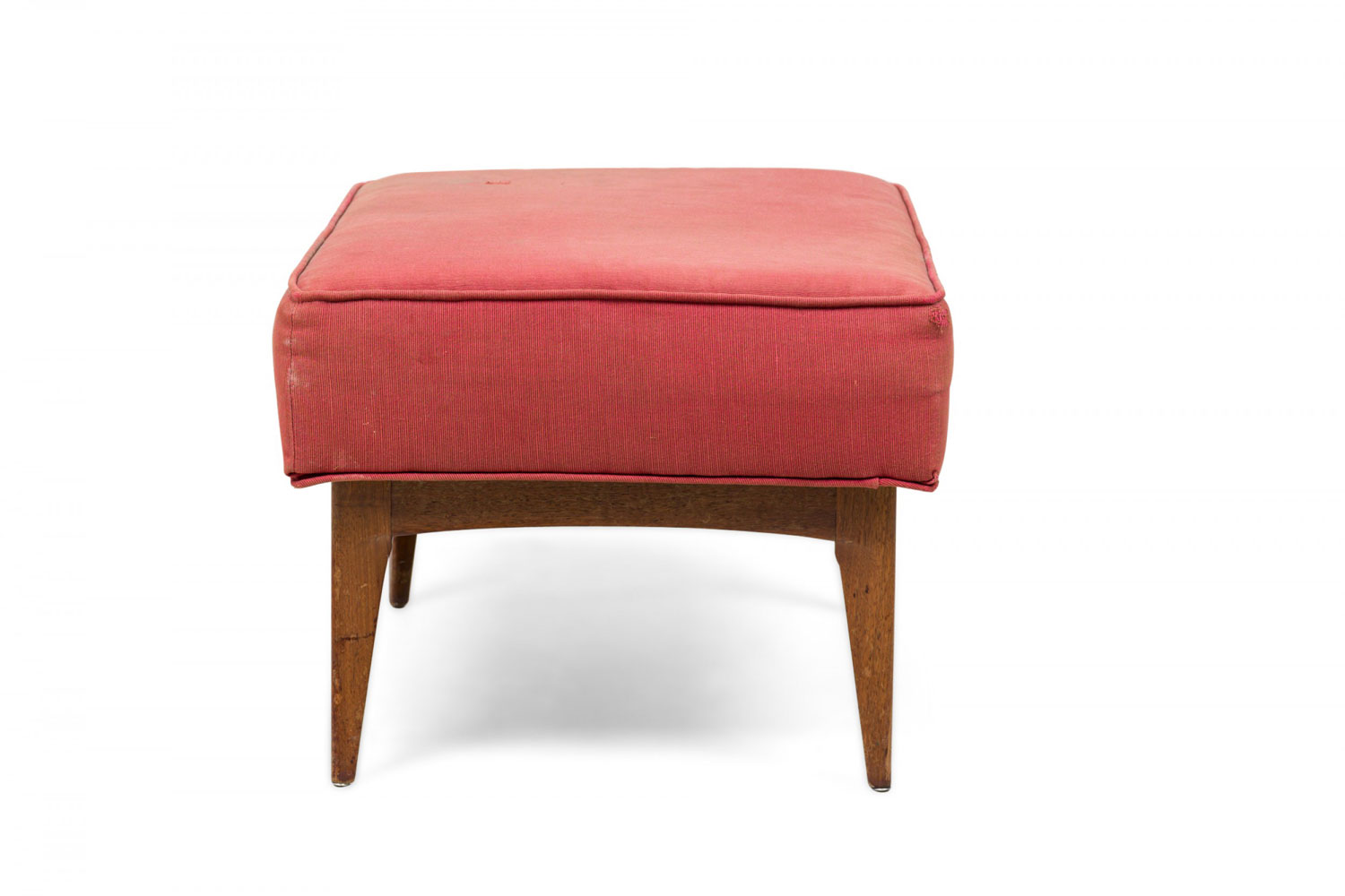 Mid-Century Italian walnut rectangular ottoman with muted red fabric upholstered seat and piping, standing on four tapered legs..