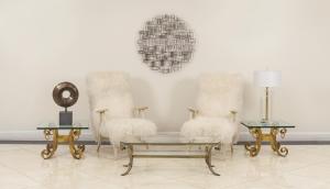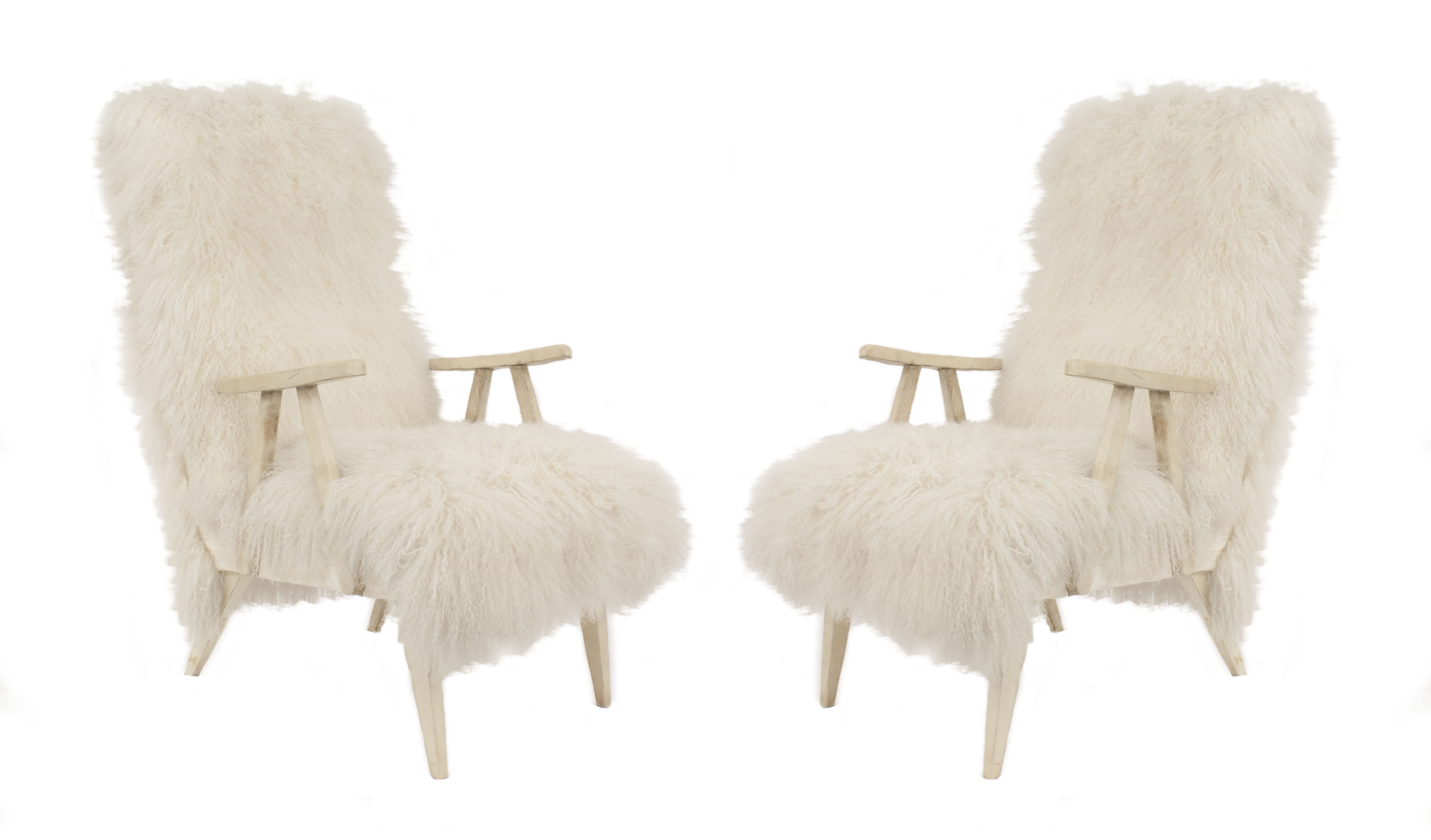 PAIR of Mid-Century (possibly Italian) 1950s white shag lambs wool upholstered high back Armchairs with trim frame (PRICED AS PAIR).