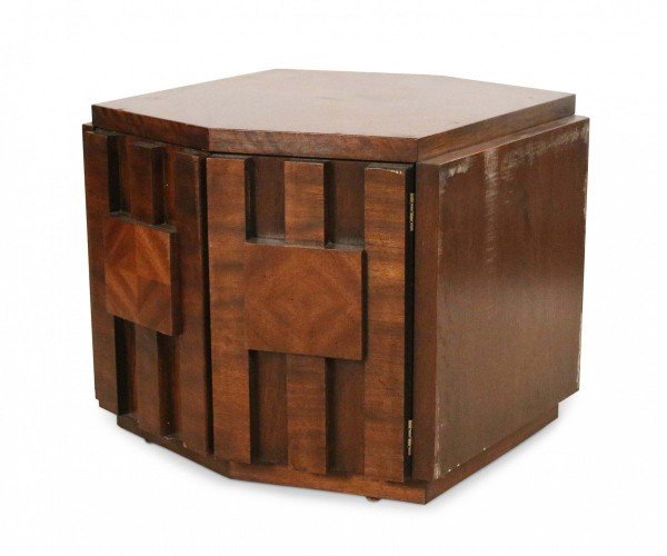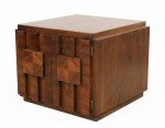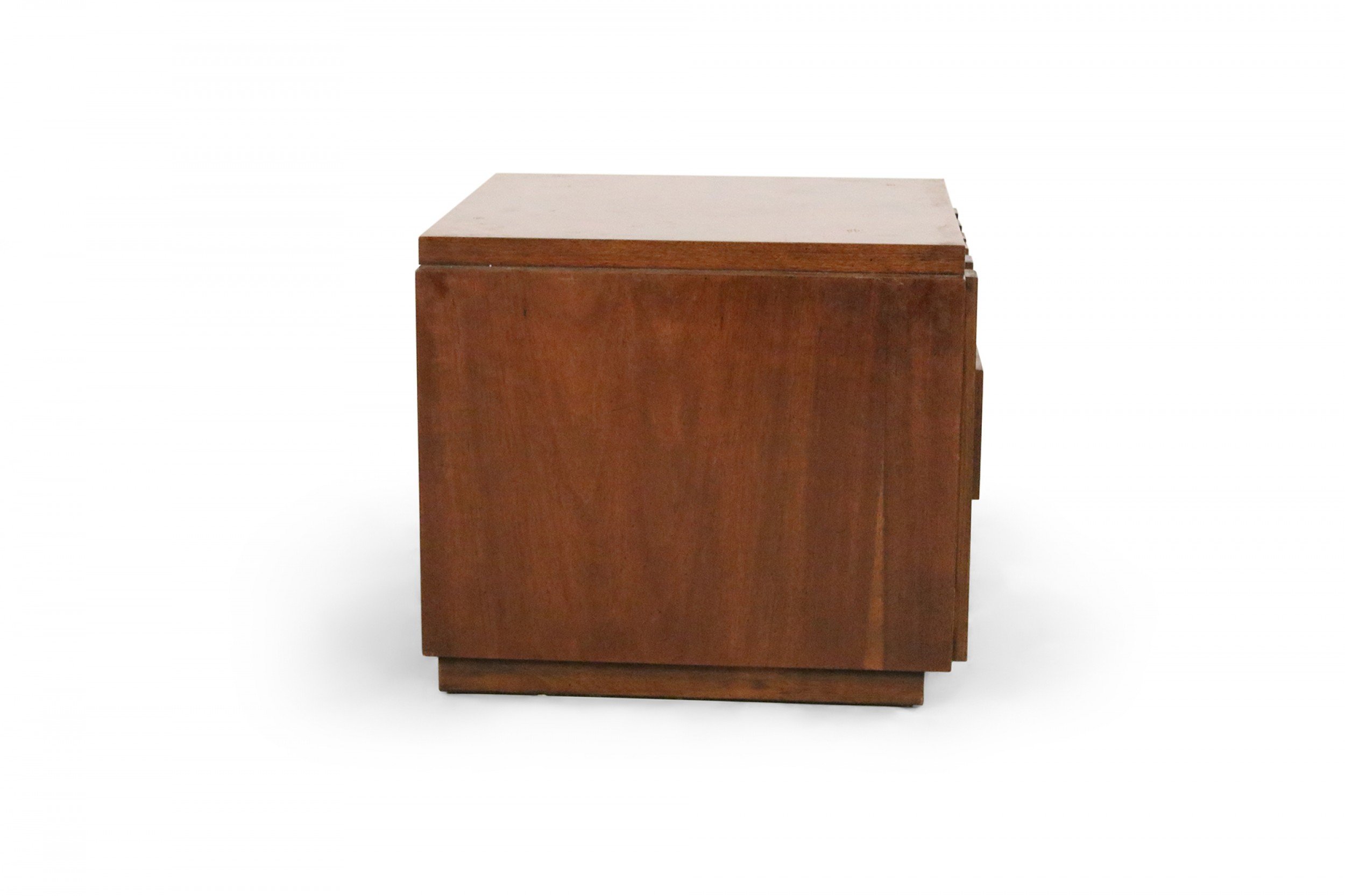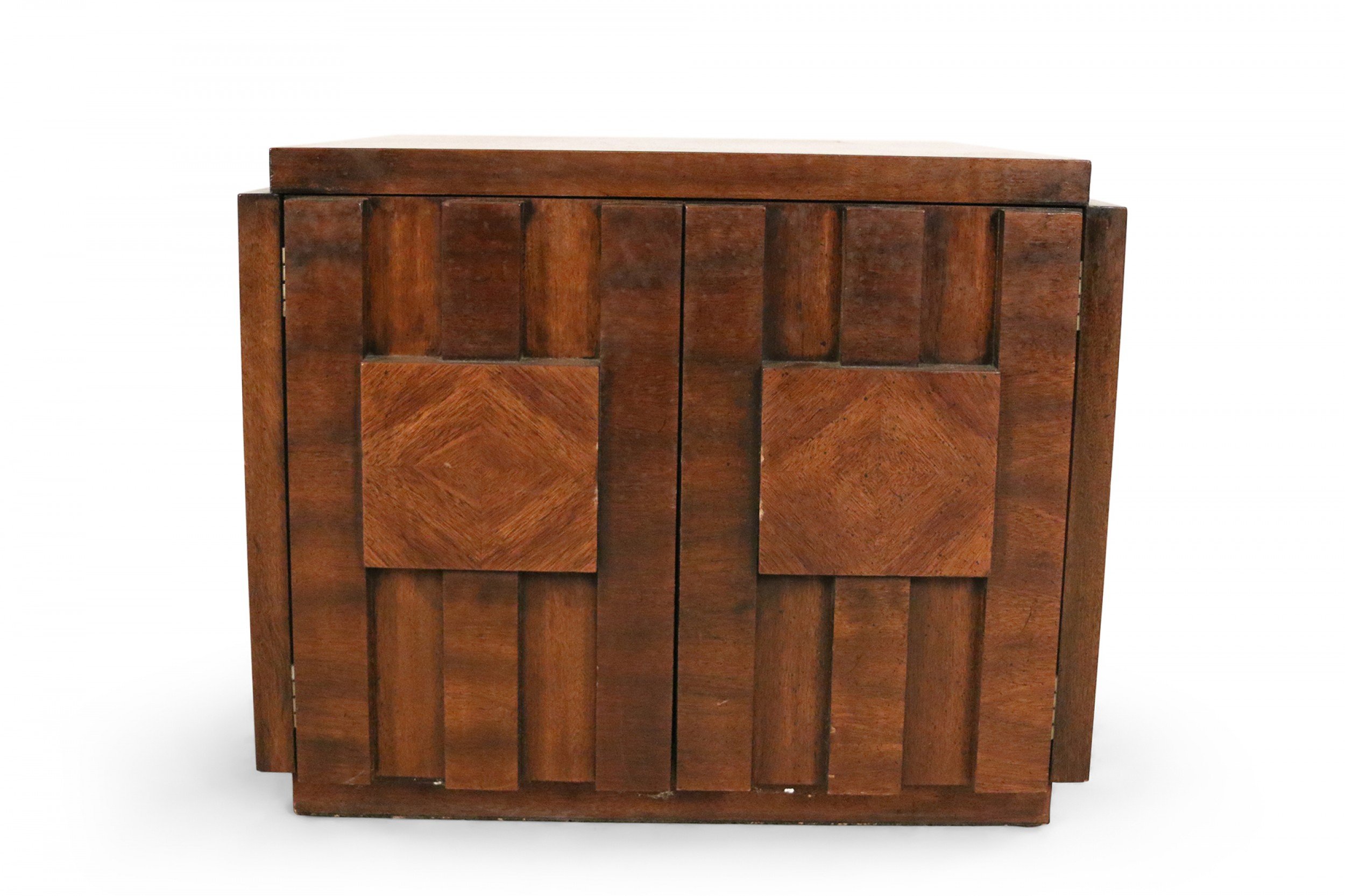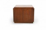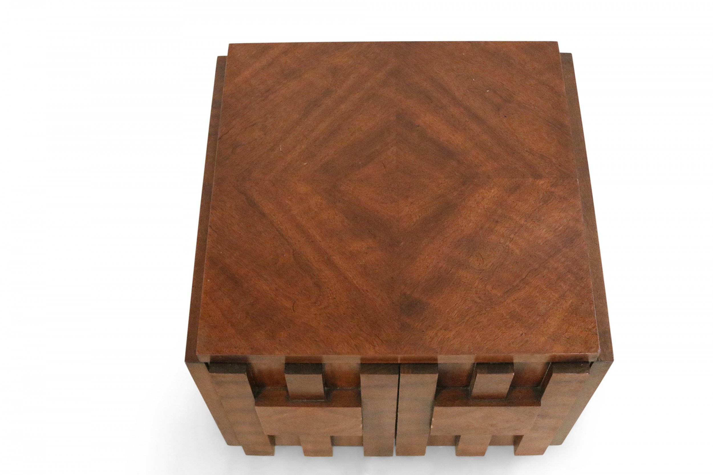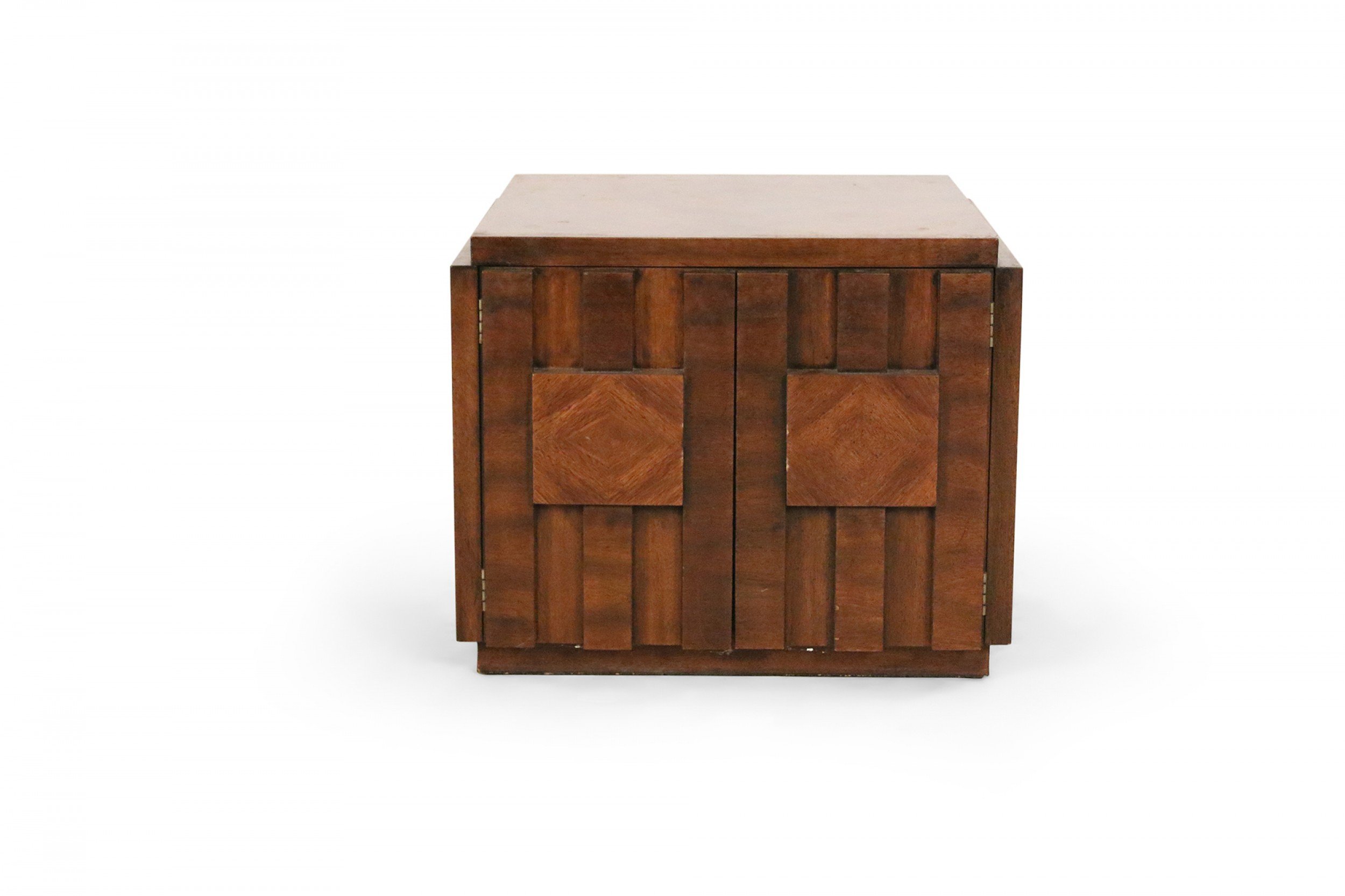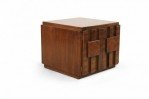 Mid-Century Brutalist square walnut side table cabinet with geometric front panel design (LANE) (Related item: NWL115).