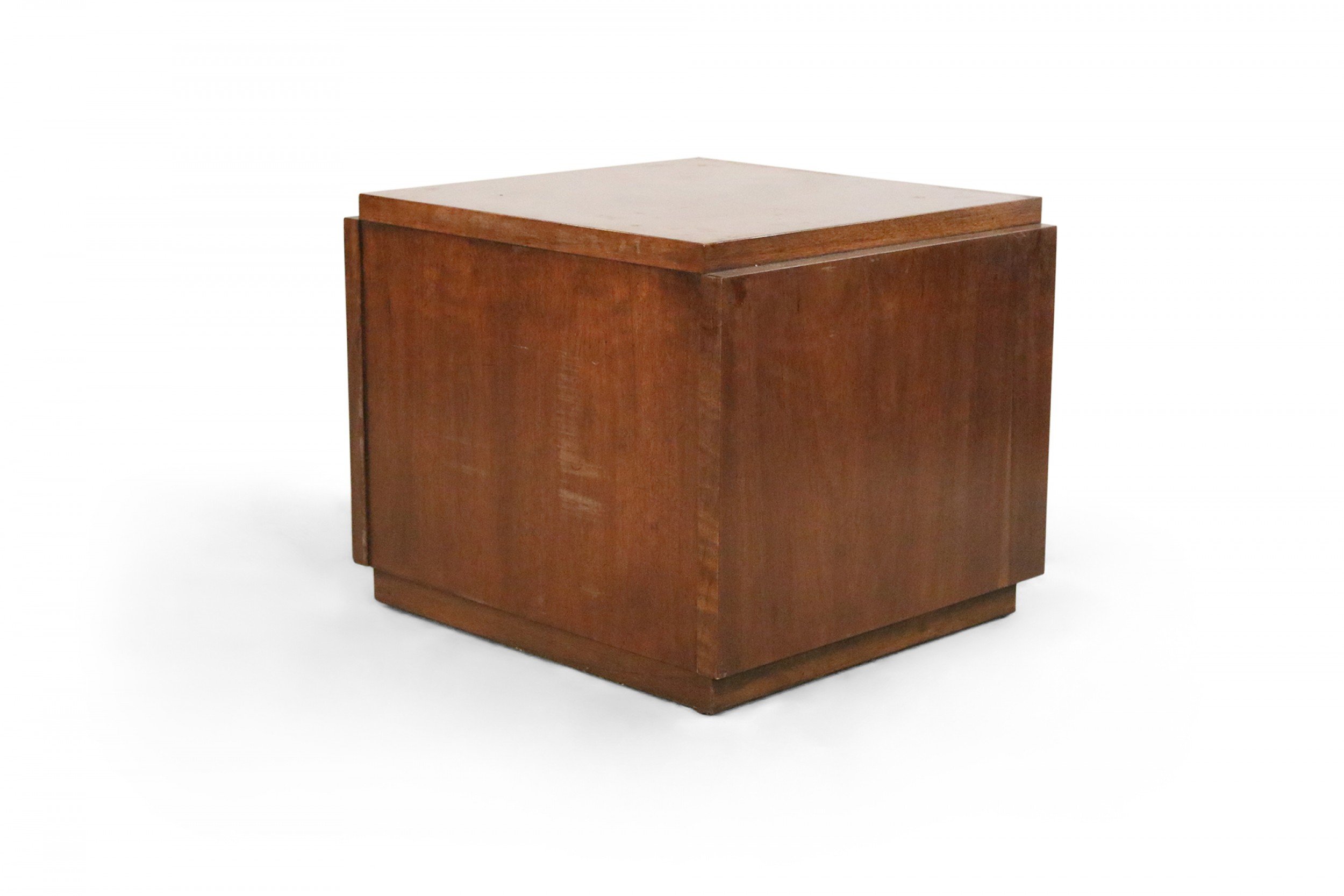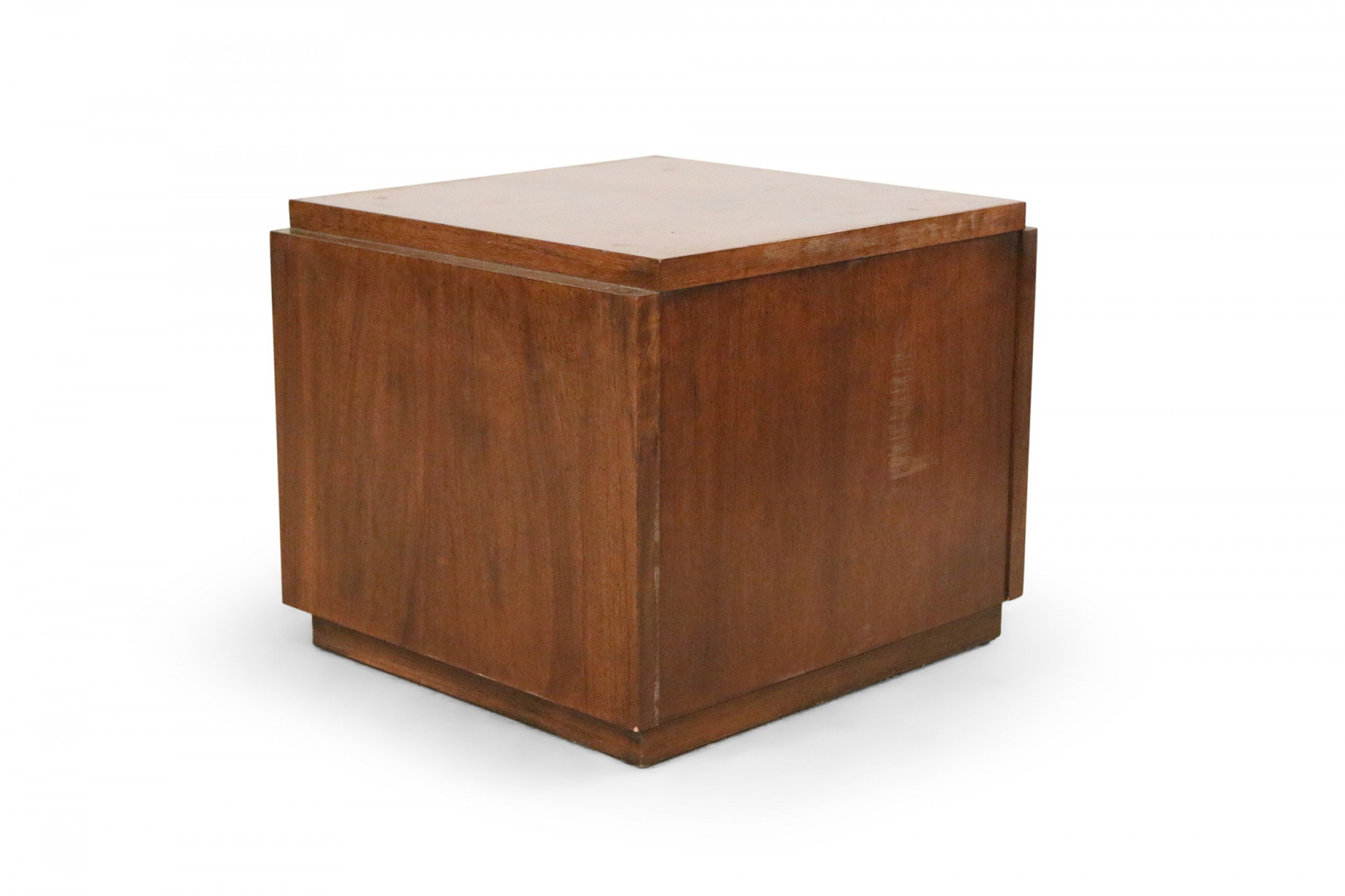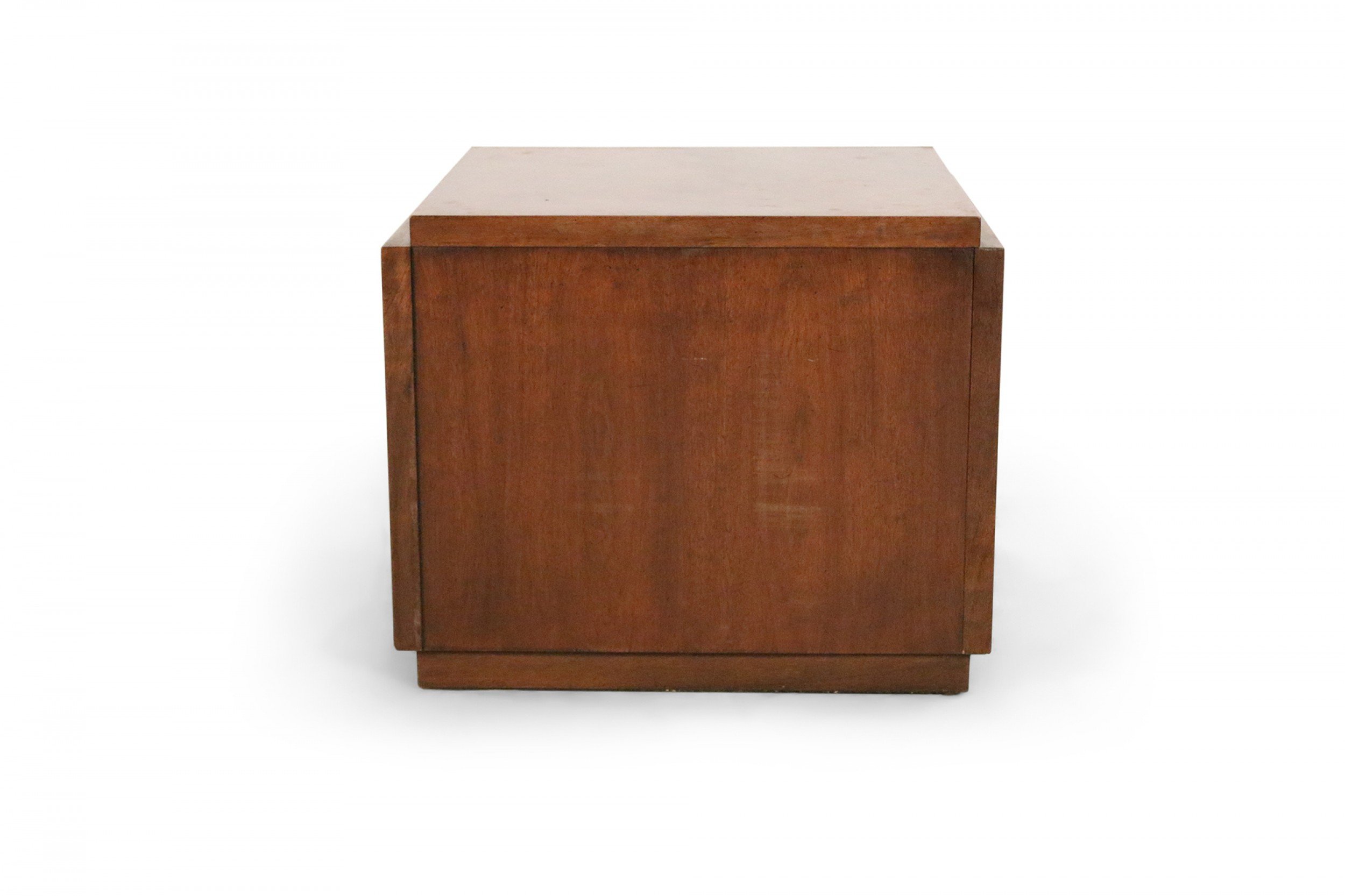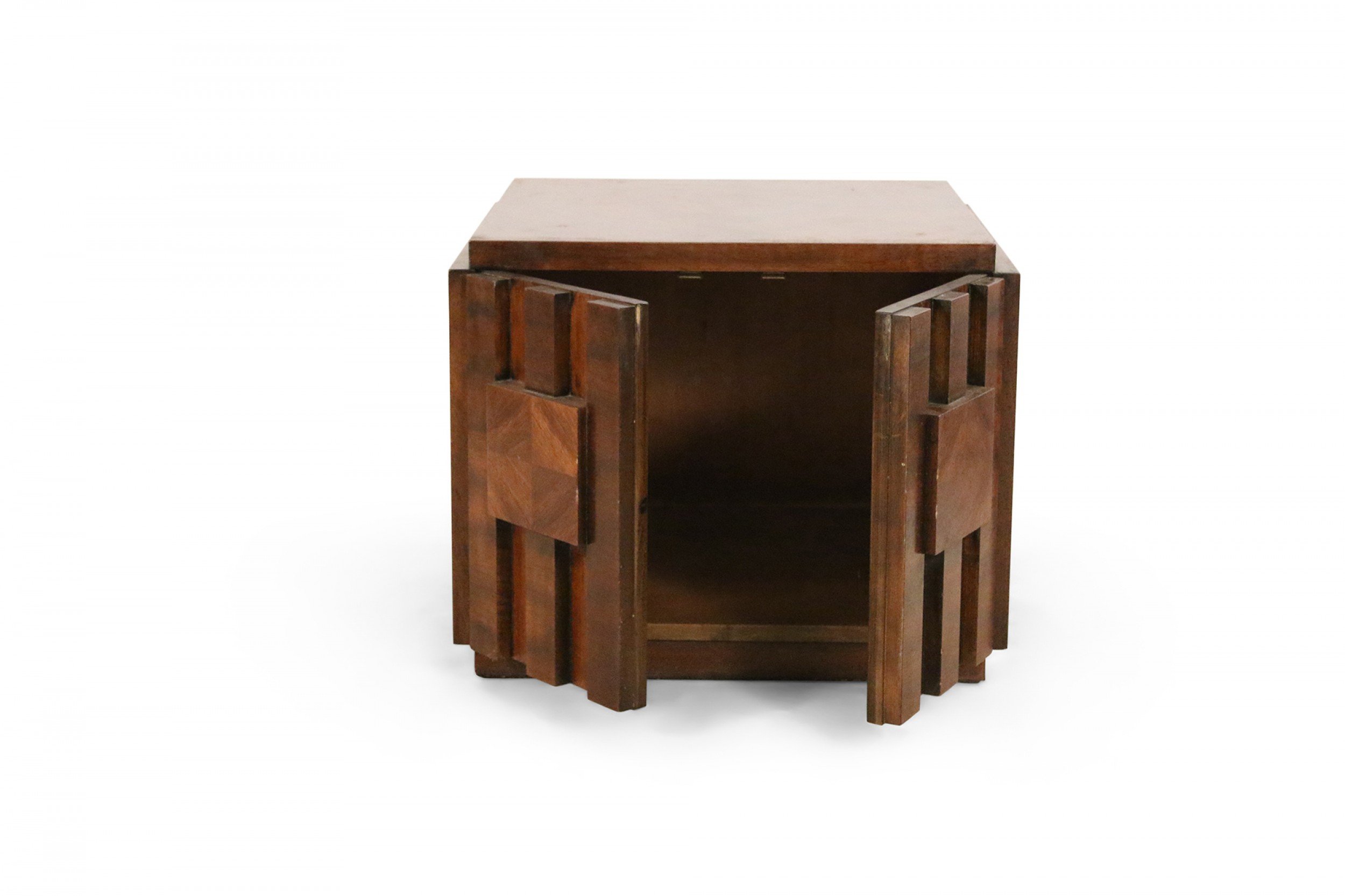 Mid-Century Brutalist square walnut side table cabinet with geometric front panel design (LANE) (Related item: NWL115)