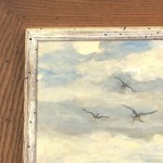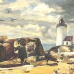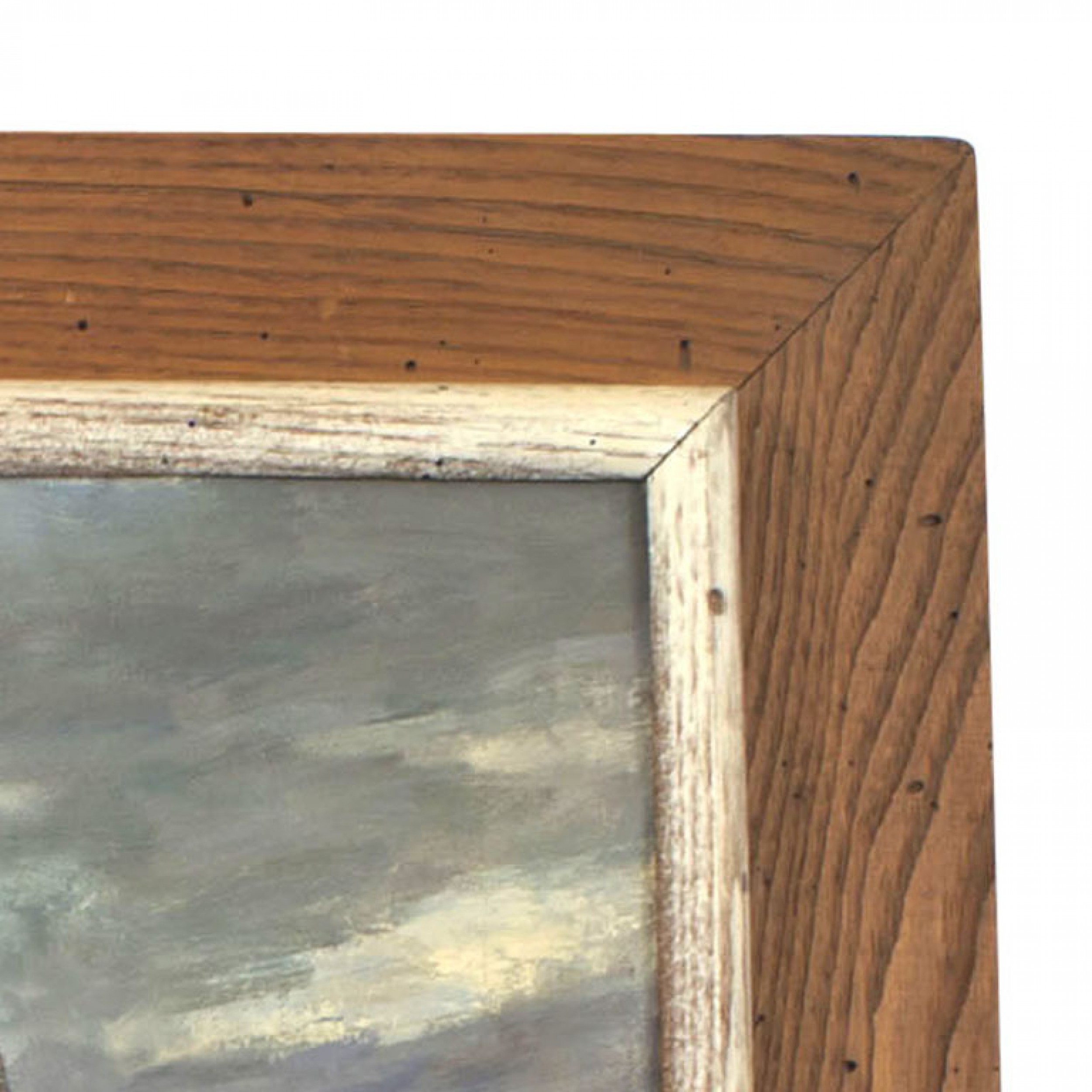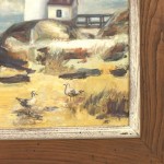 Mid-Century modern oil painting of a light house in a driftwood frame.