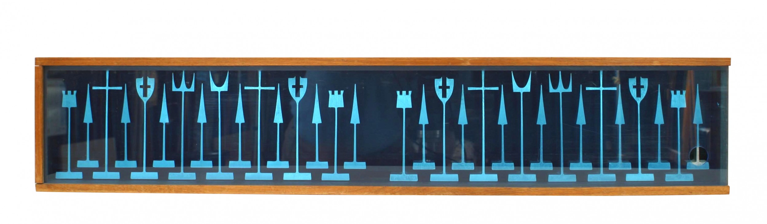 American Mid-Century Modern extruded aluminum chess set with 32 stylized figures in the original presentation box. (Stamped: Austin Enterprises 1962, made by ALCOA) Case measurements: (30.75"w x 2"d x 6"h)