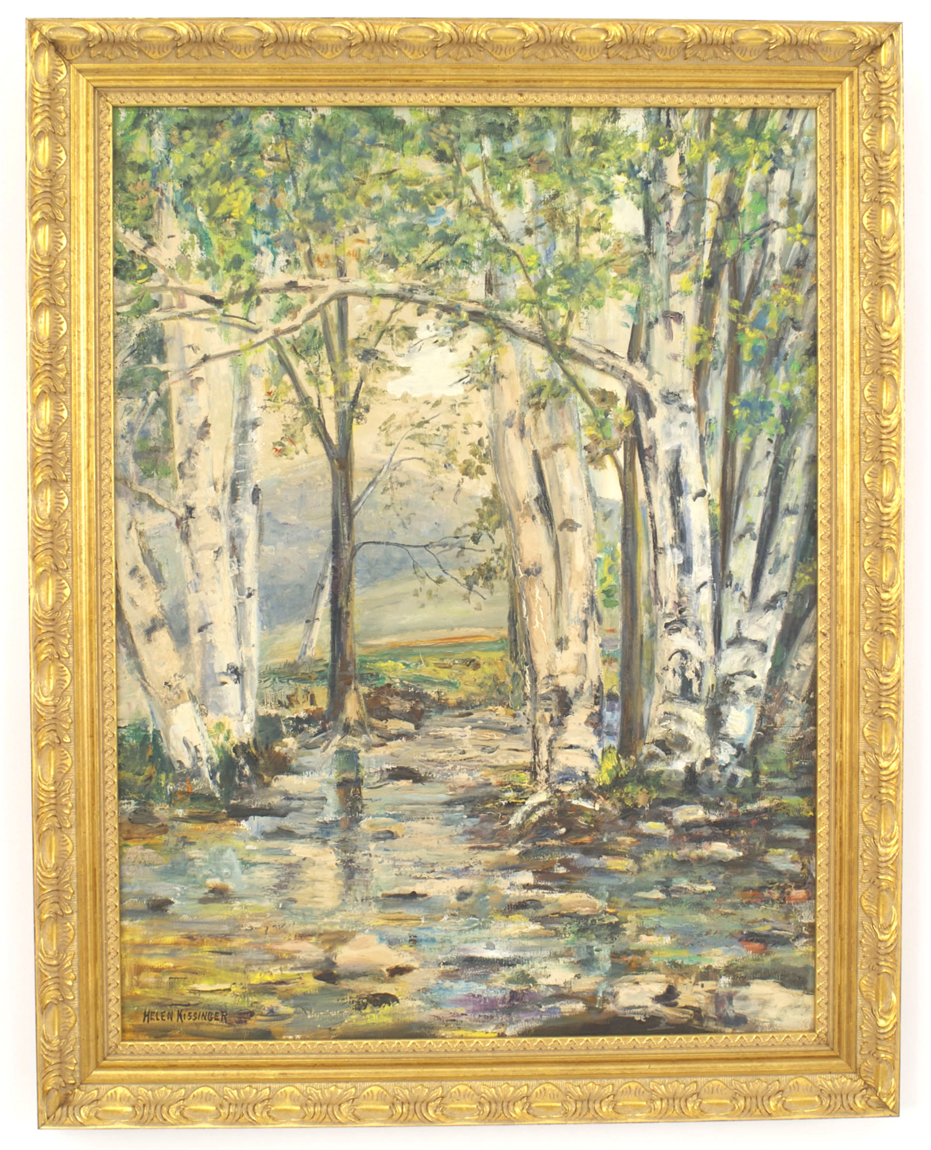 Mid-Century modern oil on canvas painting of birch trees and stream in gold frame.