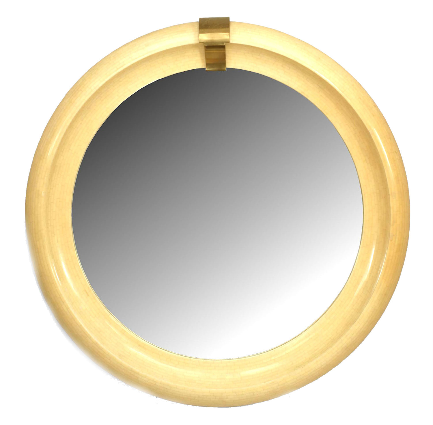 American Mid-Century Modern round mirror wall mirror with small brick / tessellated design veneer and large bevelled form frame with a brass keystone top. (attributed to KARL SPRINGER).