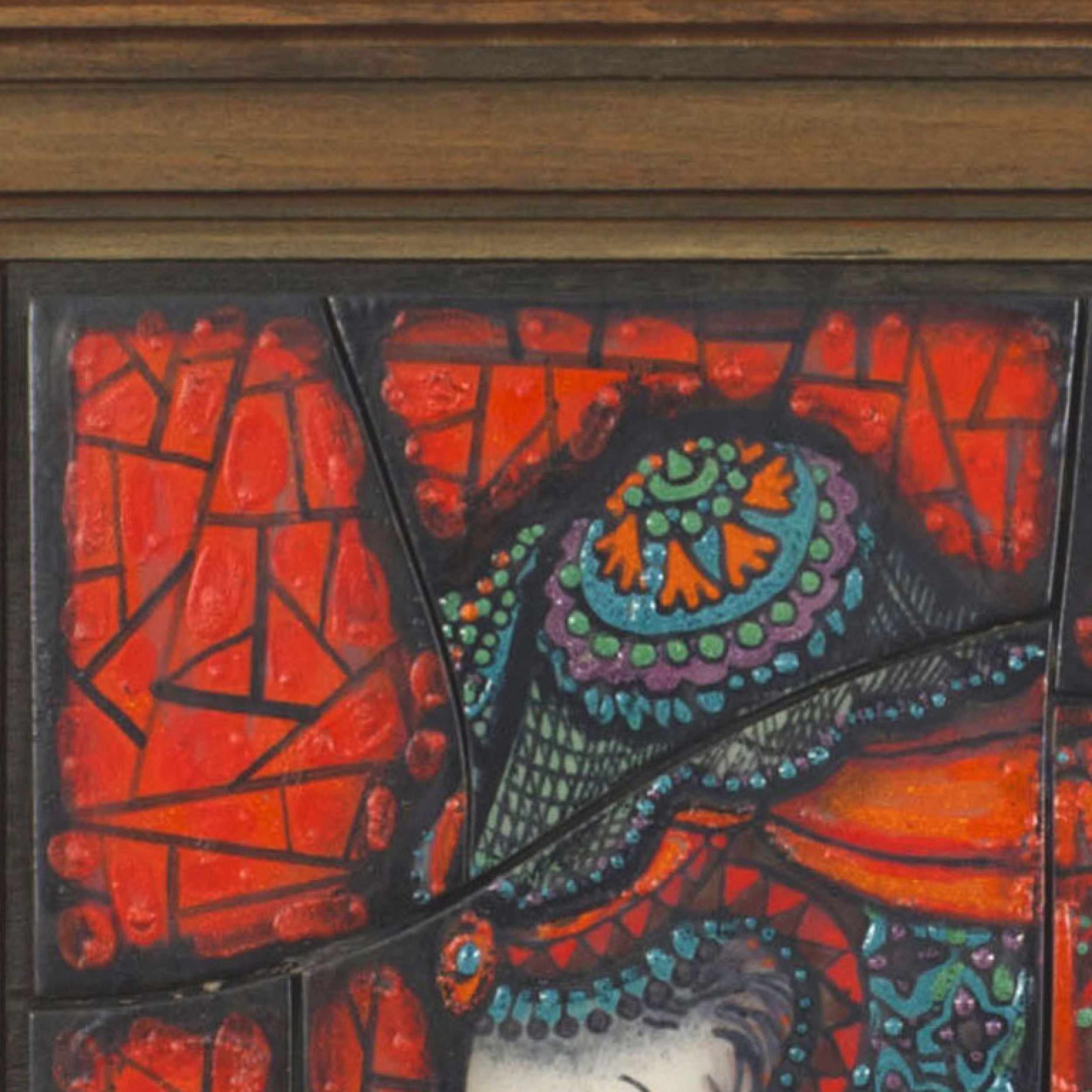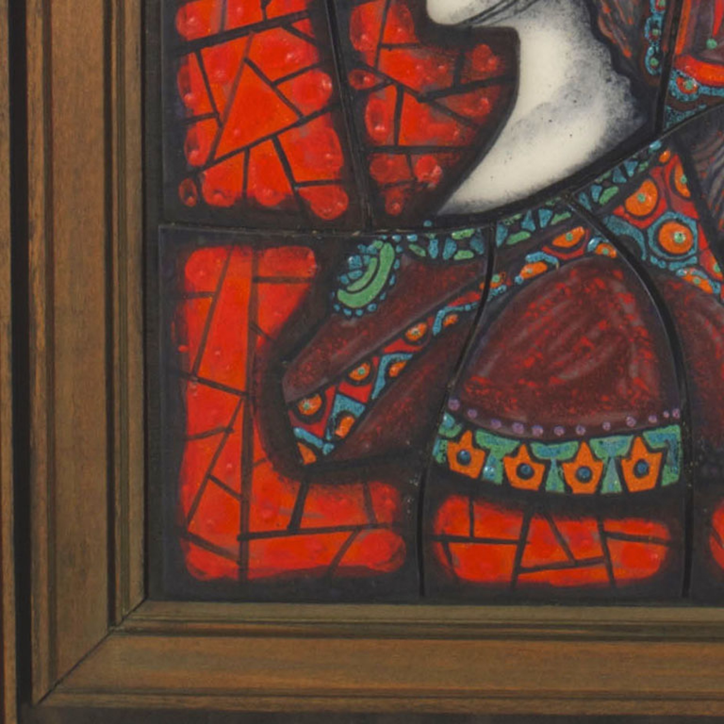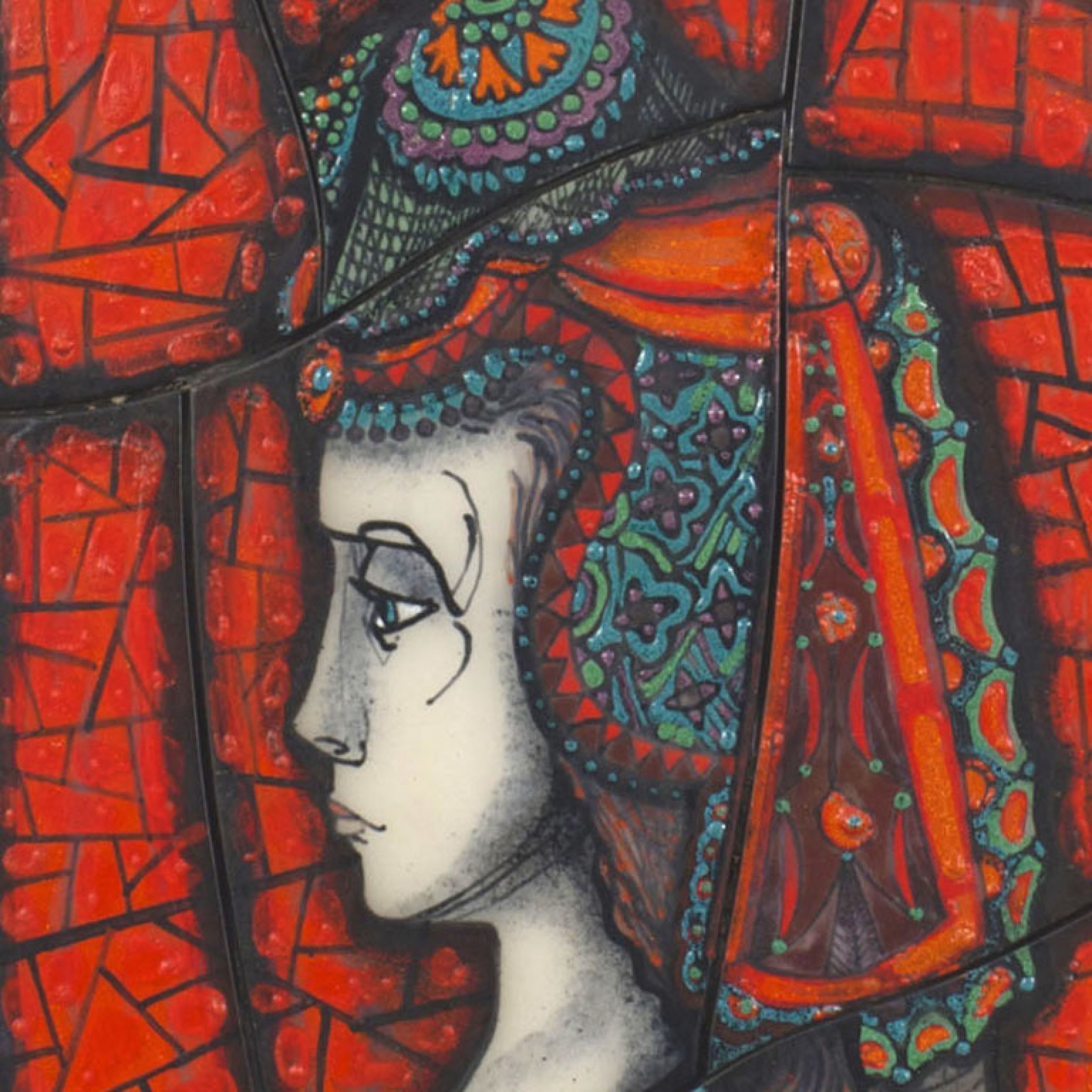 Mid-Century modern orange glass ceramic profile portrait of a young Dutch woman.