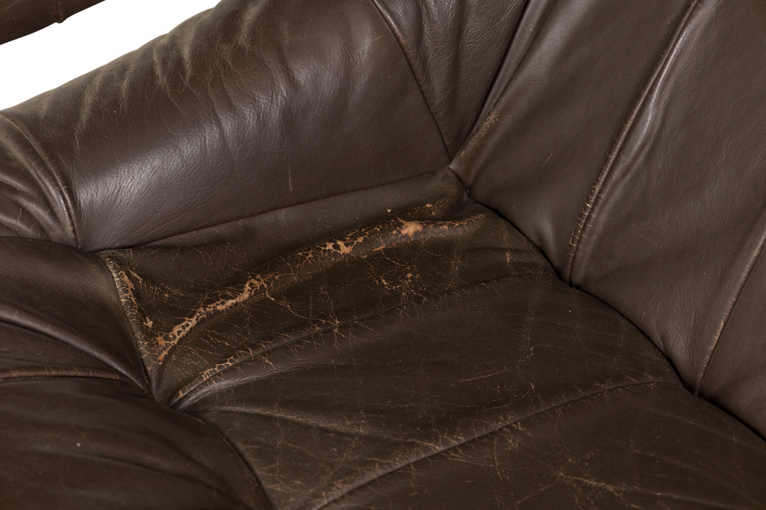 Style: Contemporary/Post-War Design Materials & Techniques: Leather, mahogany, tufted, veneer, wood Category: Seating Condition: Wear & losses on the leather due to age and use. Good; Minor losses