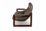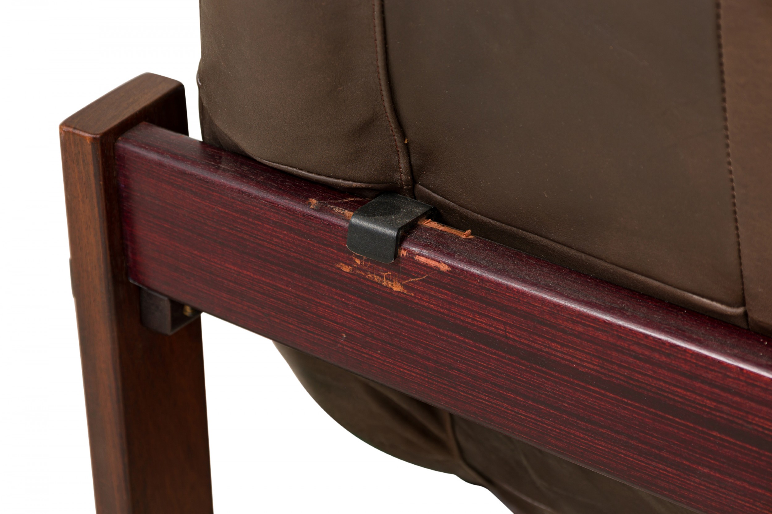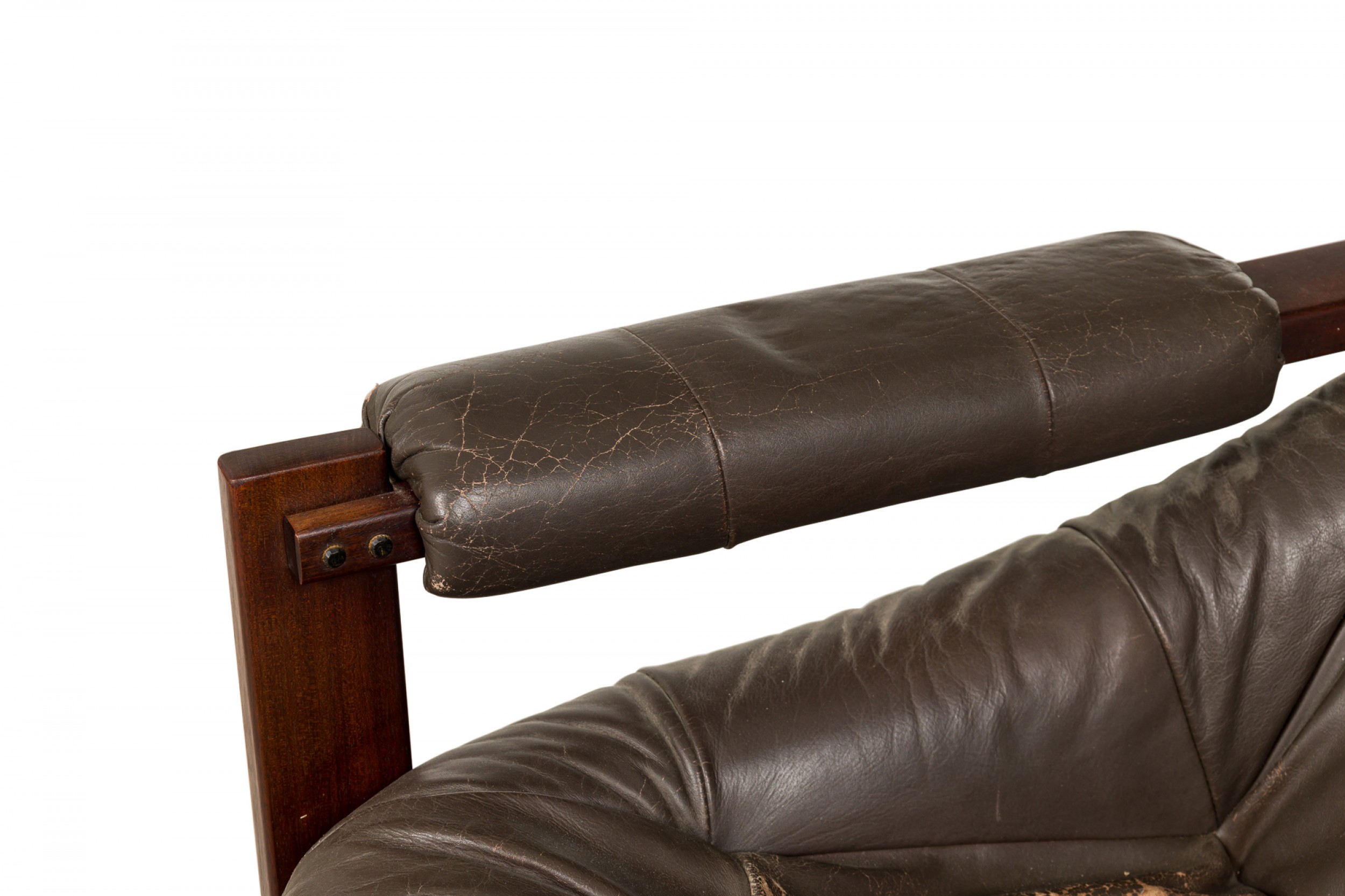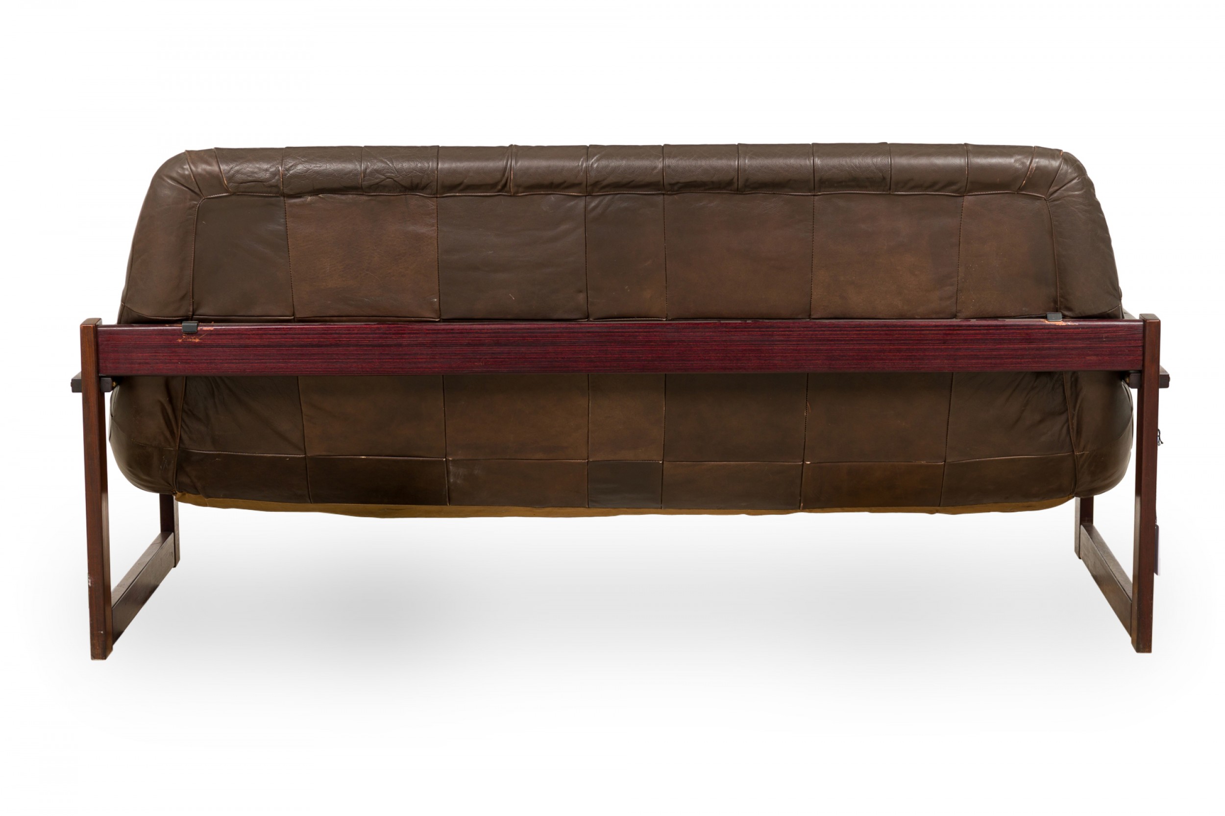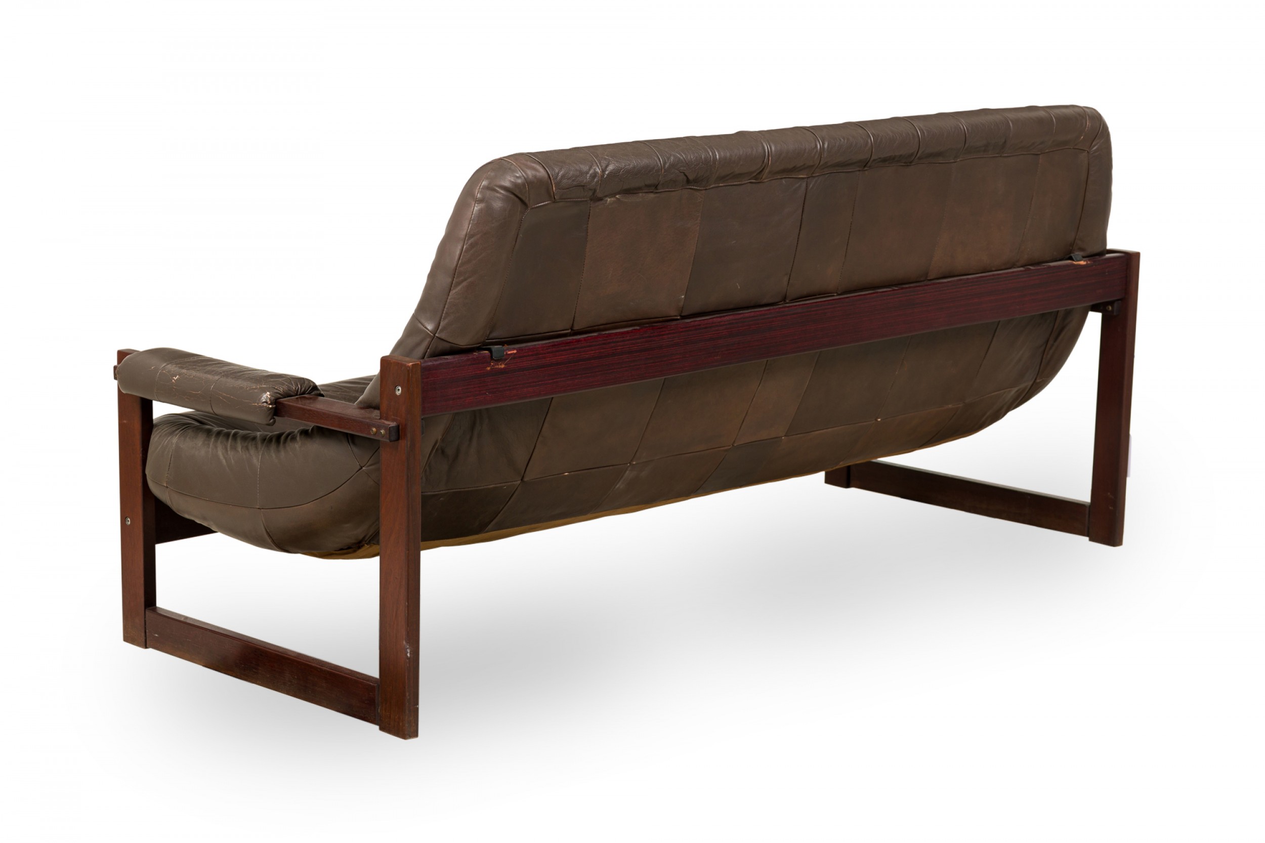 Mid-Century Scandinavian style tufted brown leather upholstered sofa featuring a single curved scoop cushion functioning as both back and seat on a rosewood frame having front and back horizontal stretchers with tufted leather upholstered arm pads..