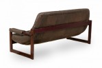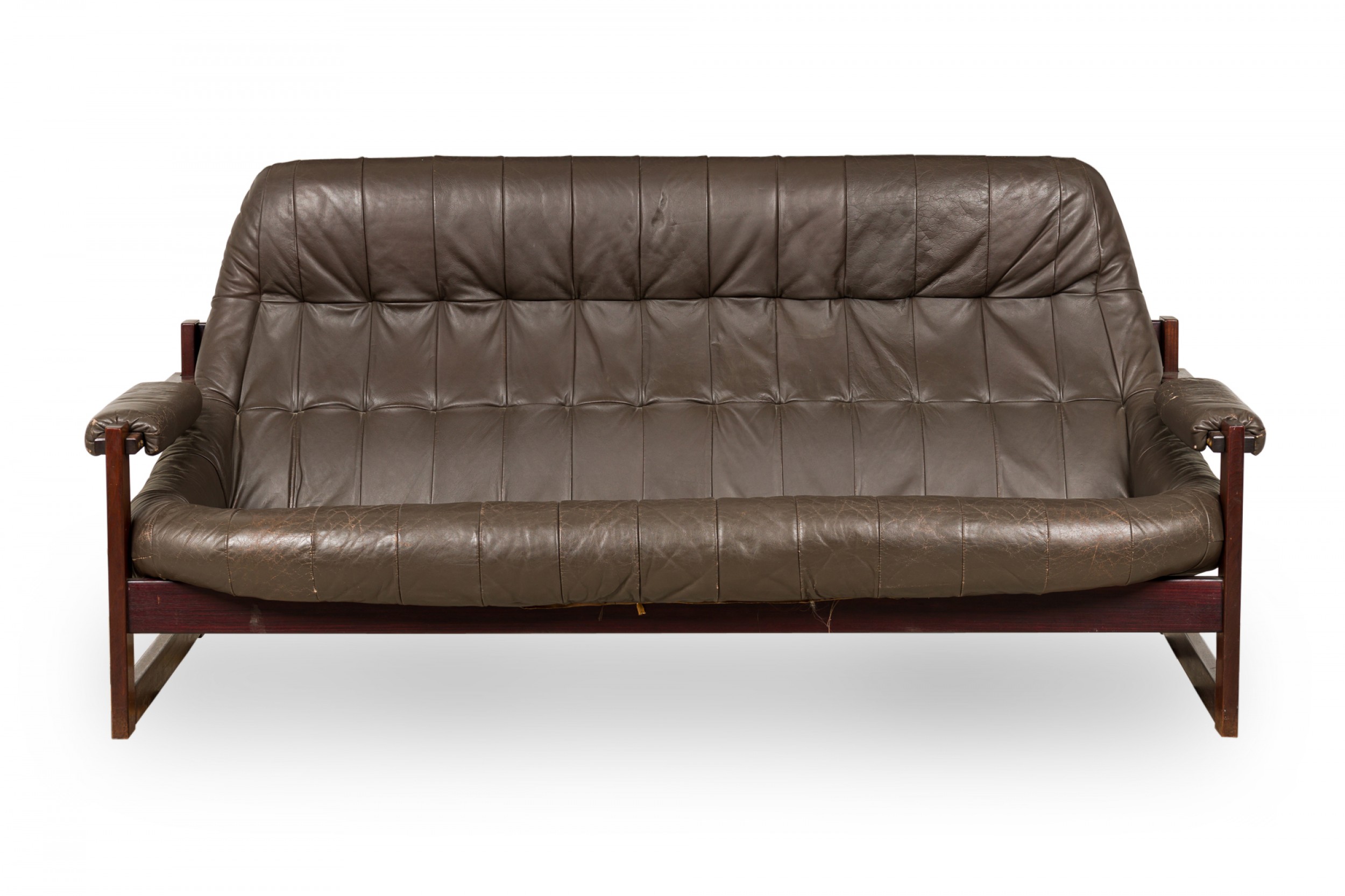 Mid-Century Scandinavian style tufted brown leather upholstered sofa featuring a single curved scoop cushion functioning as both back and seat on a rosewood frame having front and back horizontal stretchers with tufted leather upholstered arm pads.