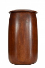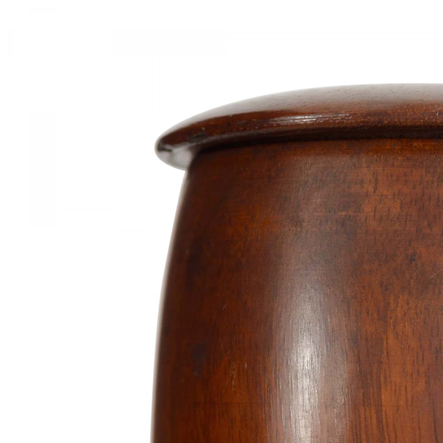 Mid-Century Scandinavian cylindrical wood box with a gold trim and a lift-off cover.