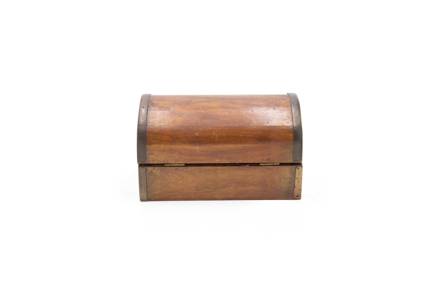 Mid-Century camel top chest shaped light wood box with a brass trim and a latch.