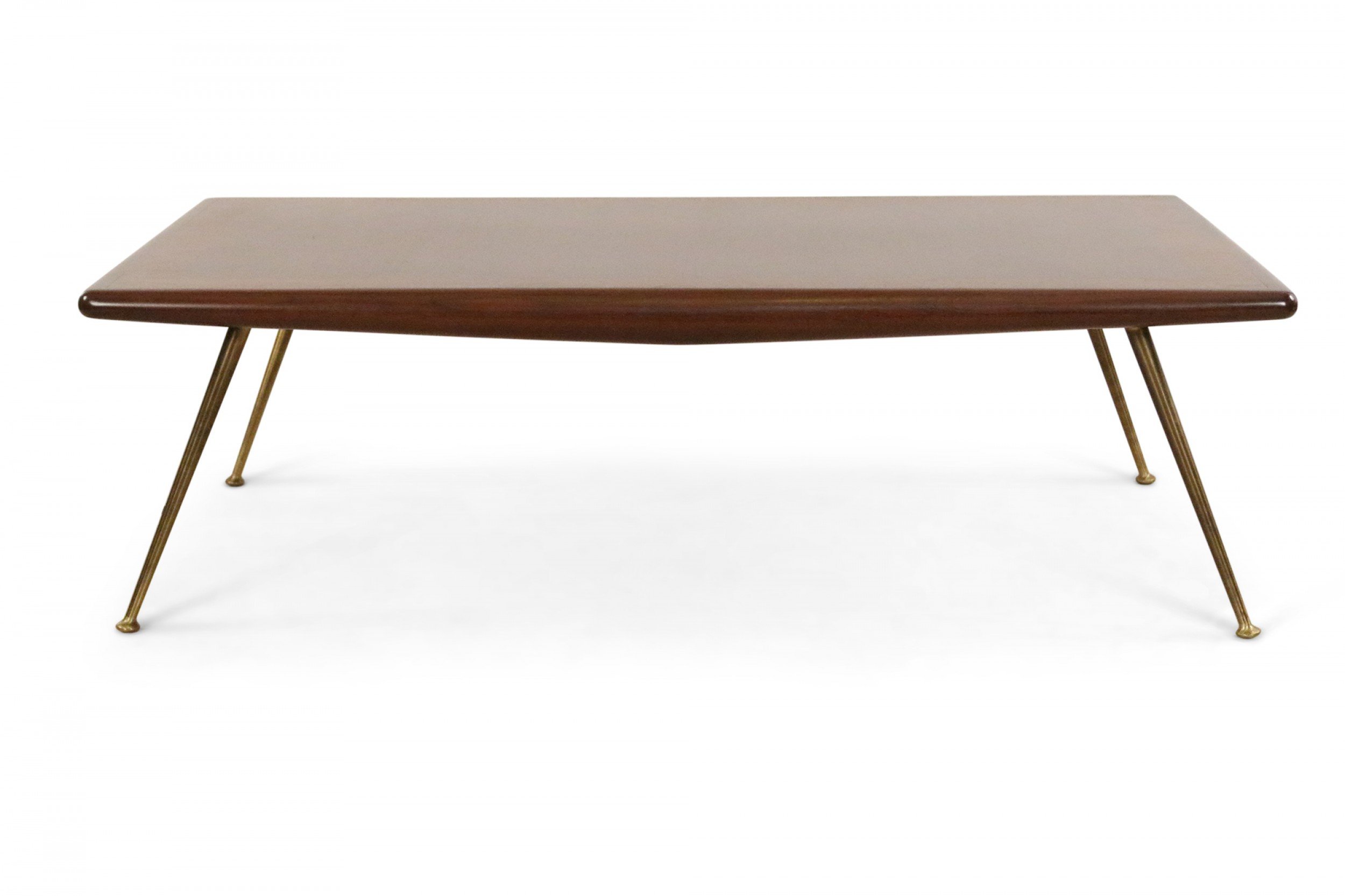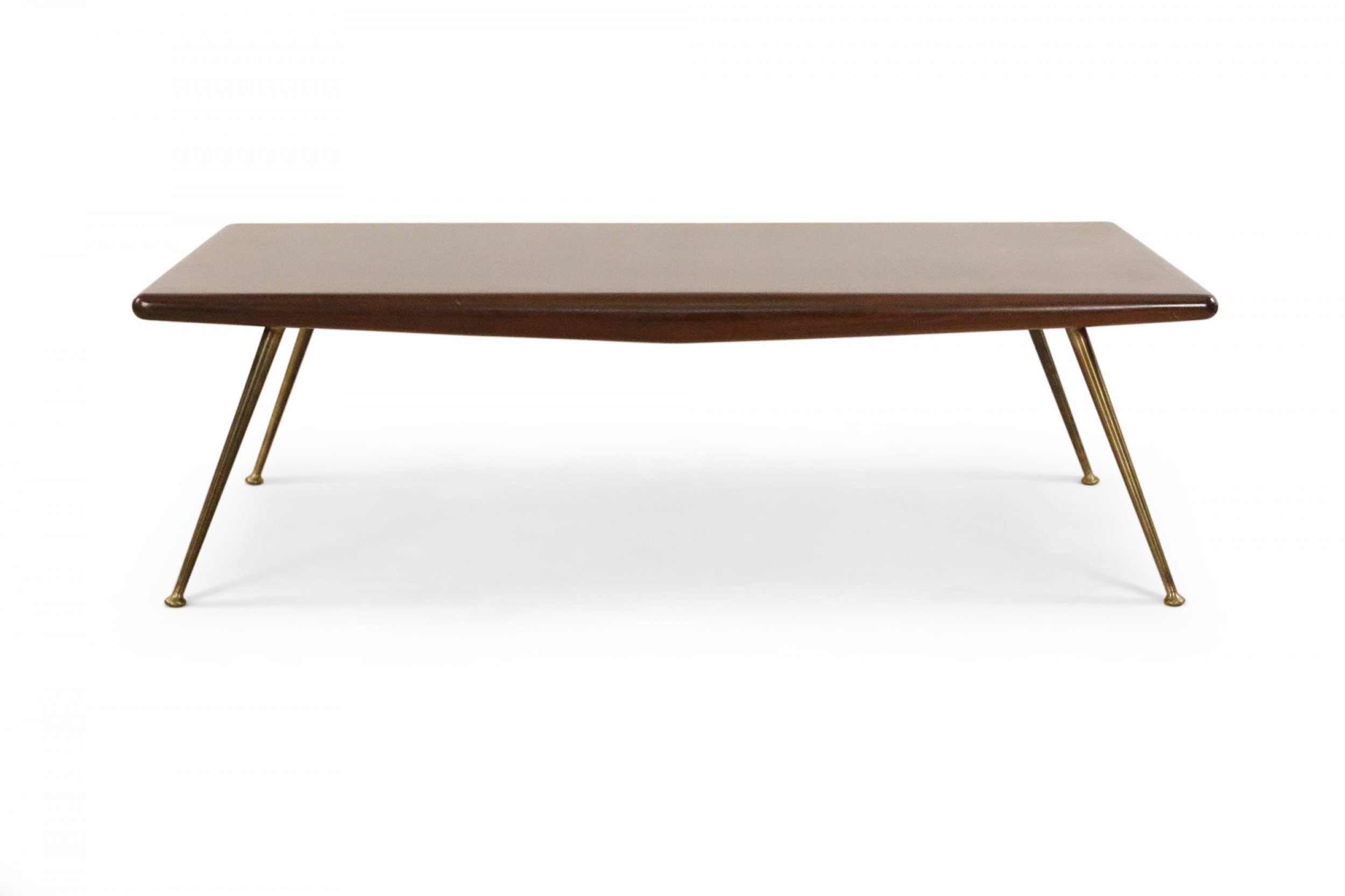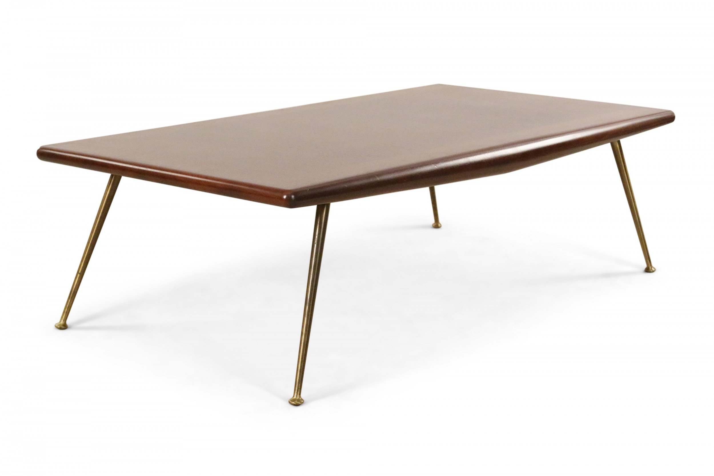American Mid-Century rectangular walnut coffee table with brass legs (T.H. ROBSJOHN-GIBBINGS, model 1786 for Widdicomb)..