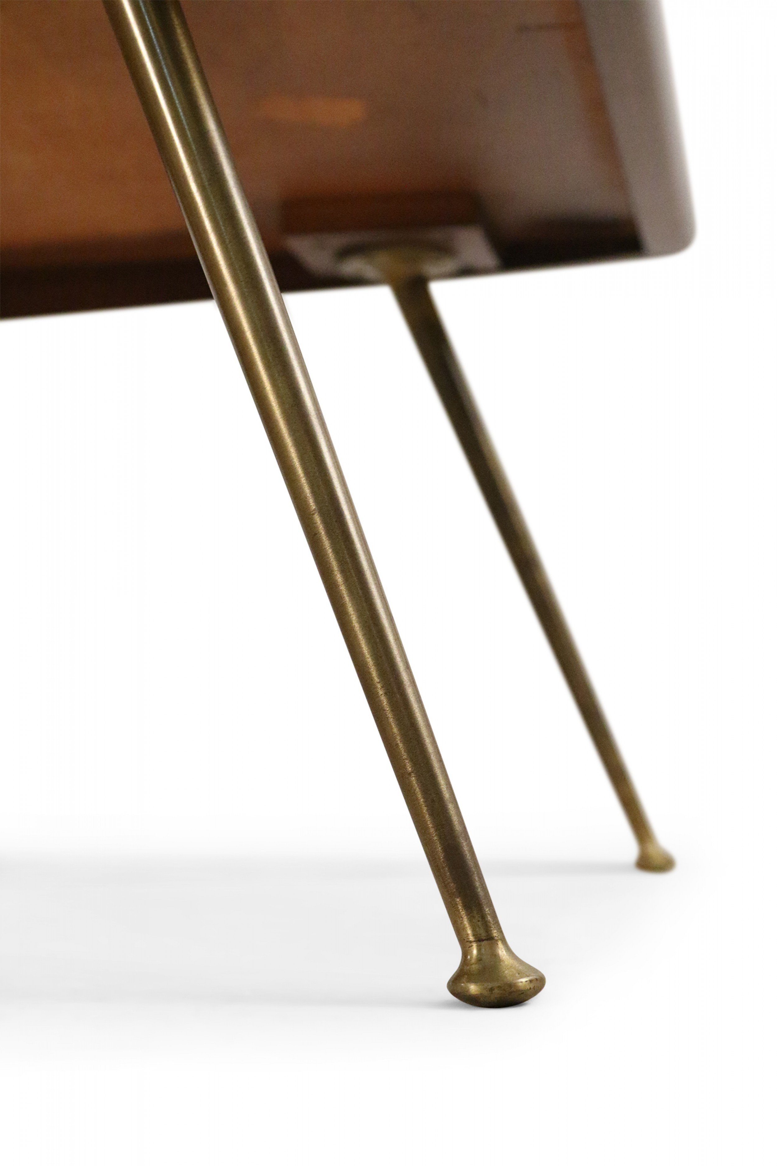 Style: Mid-Century Materials & Techniques: Brass, metal, walnut, wood Category: Tables Condition: Decal manufacturer's label 'Widdicomb Designed by T.H. Robsjohn-Gibbings' and stenciled manufacturer's mark to underside 'II/54 1786