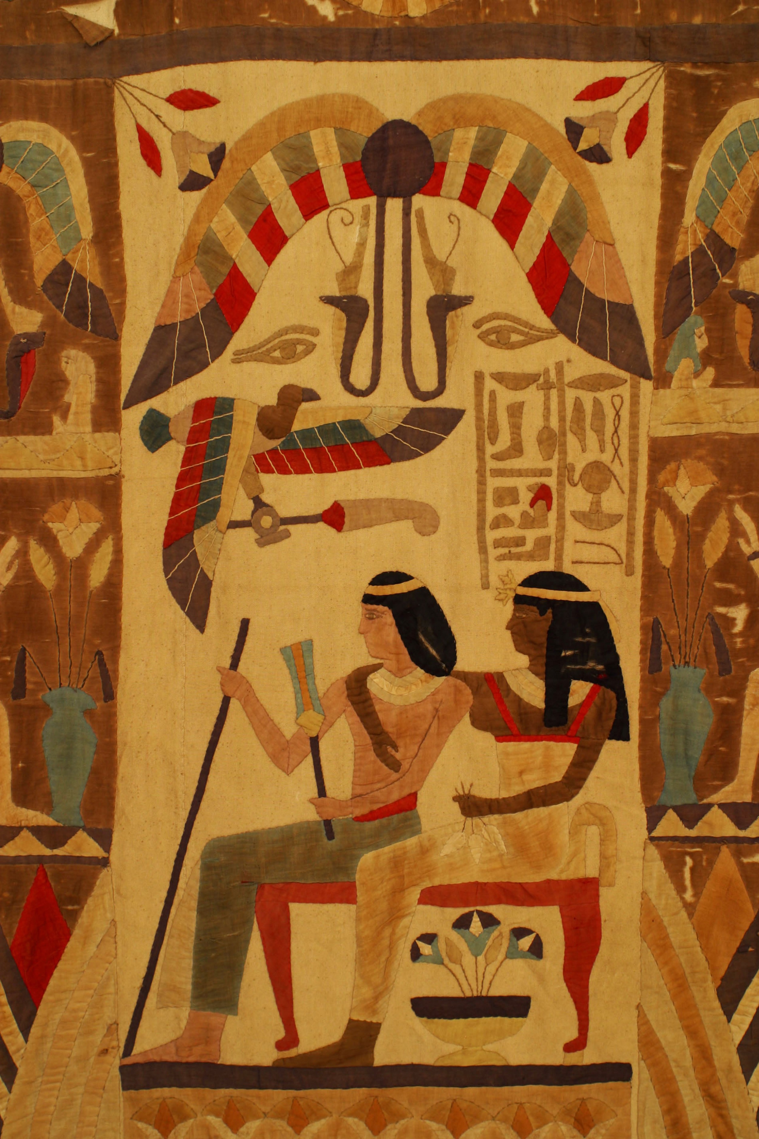 Middle Eastern Egyptian style (19th Century) vertical embroidered wall hanging with 2 figures under a winged bird figure with various symbols.