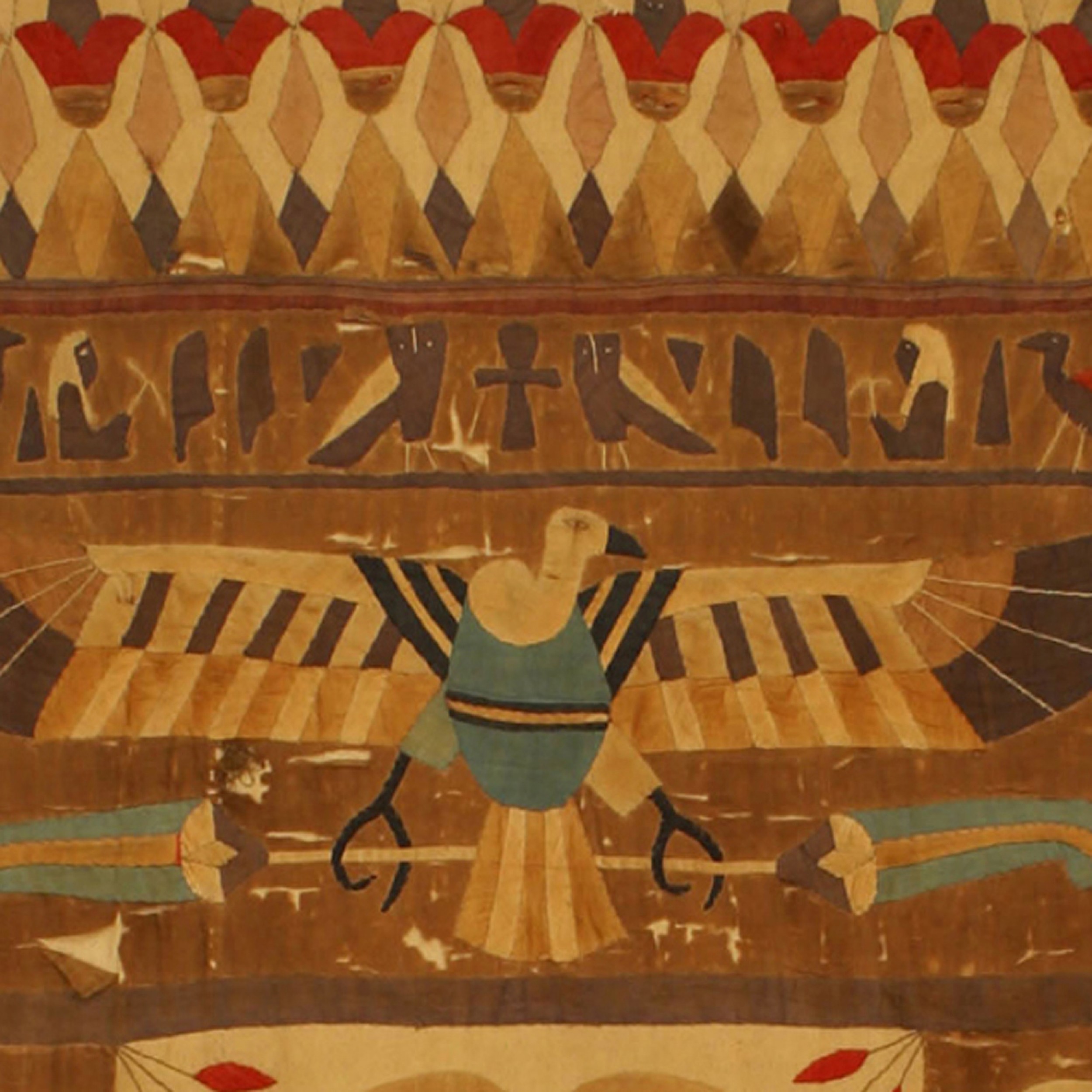 Middle Eastern Egyptian style (19th Century) vertical embroidered wall hanging with 2 figures under a winged bird figure with various symbols