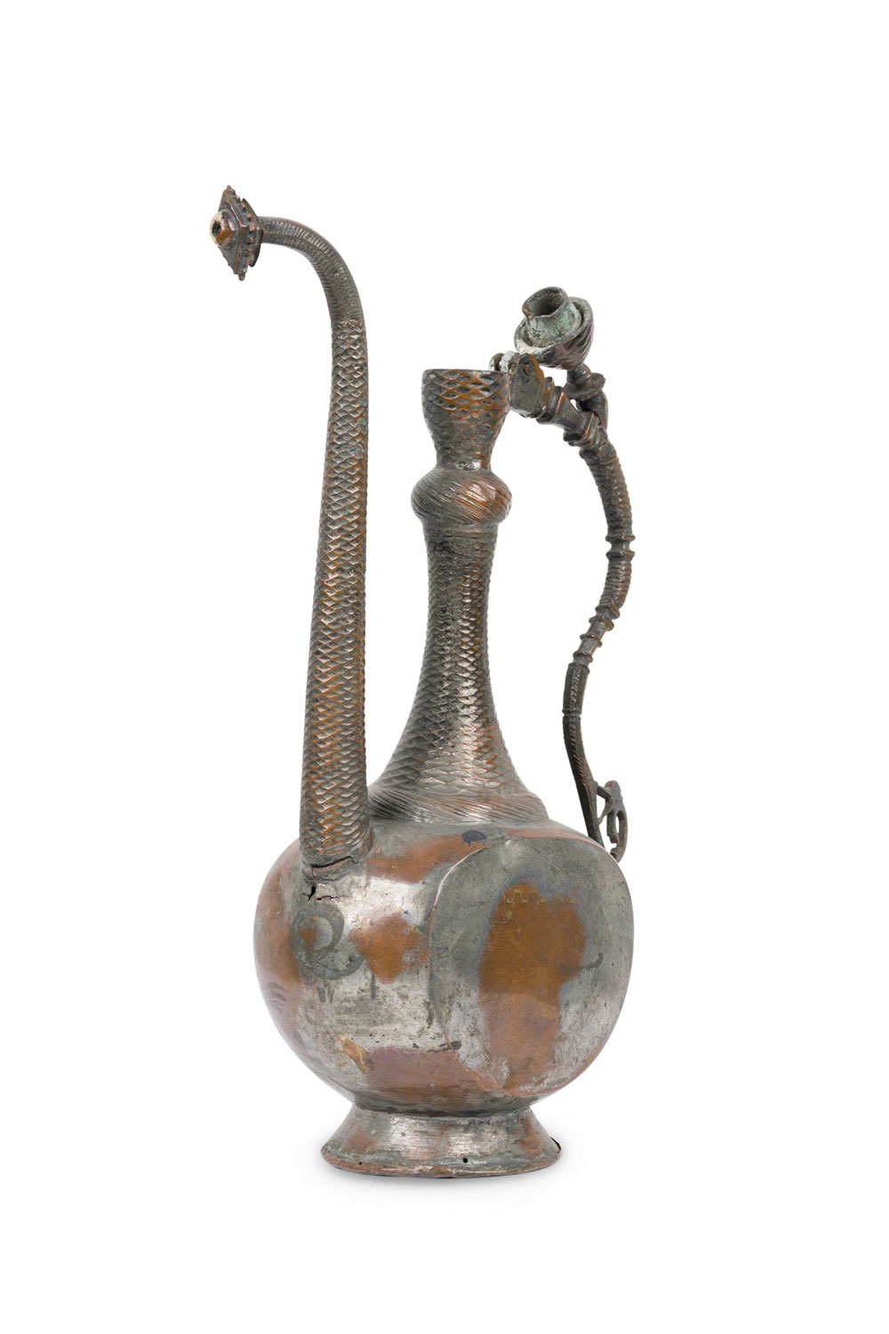 Middle Eastern Moorish-style (19/20th Century) silver plate on copper ewer (pitcher) with scale design spout.