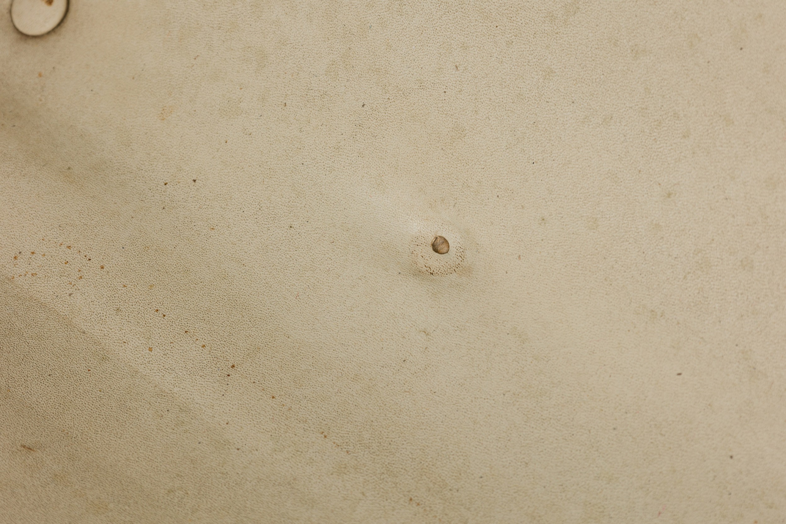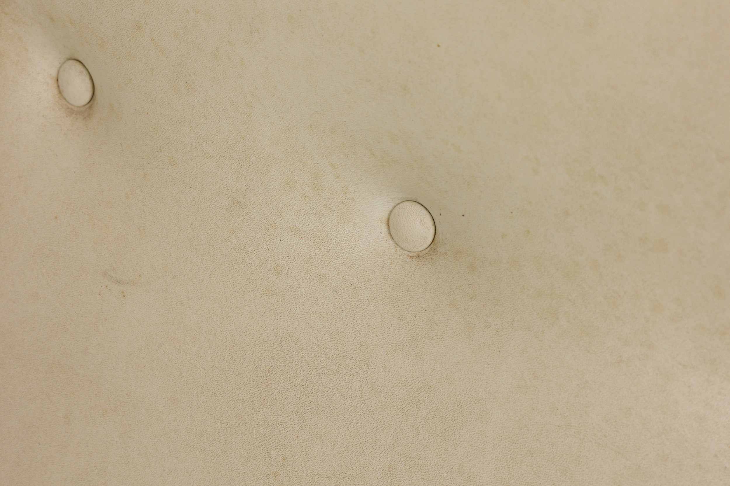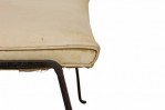 Style: Mid-Century Materials & Techniques: Iron / wrought iron, leather, metal, tufted, upholstered Category: Seating Condition: Footstool Dimensions: 27"w x 20"d x 15"h Wear and discoloration to upholstery and leg finish, missing a button. Good; Wear consistent with age and use