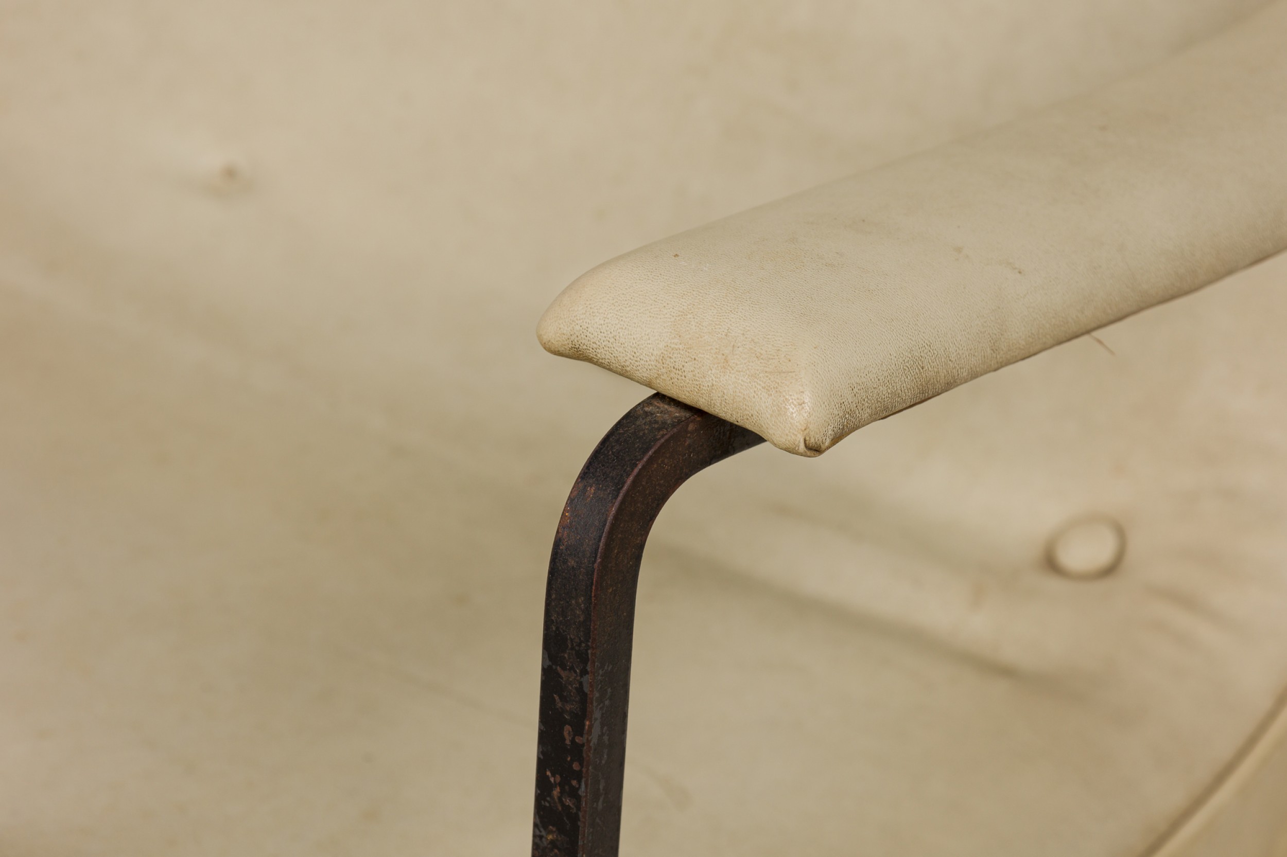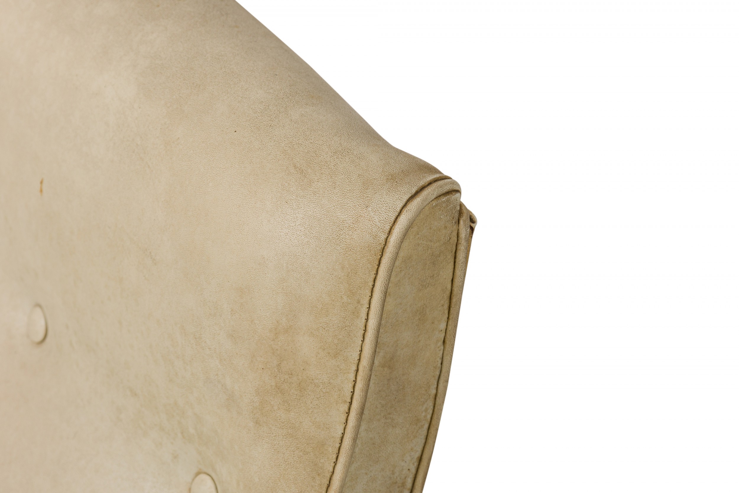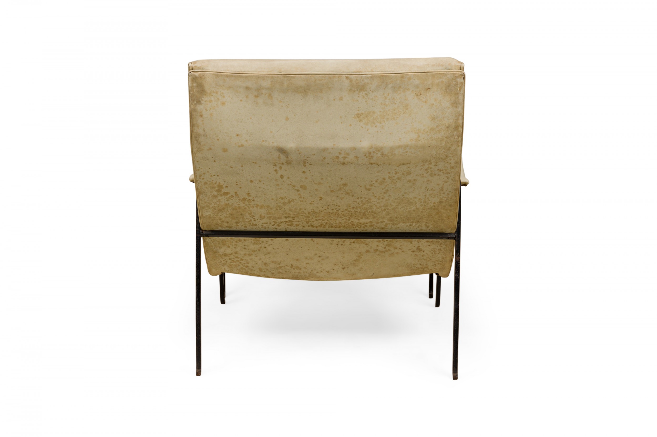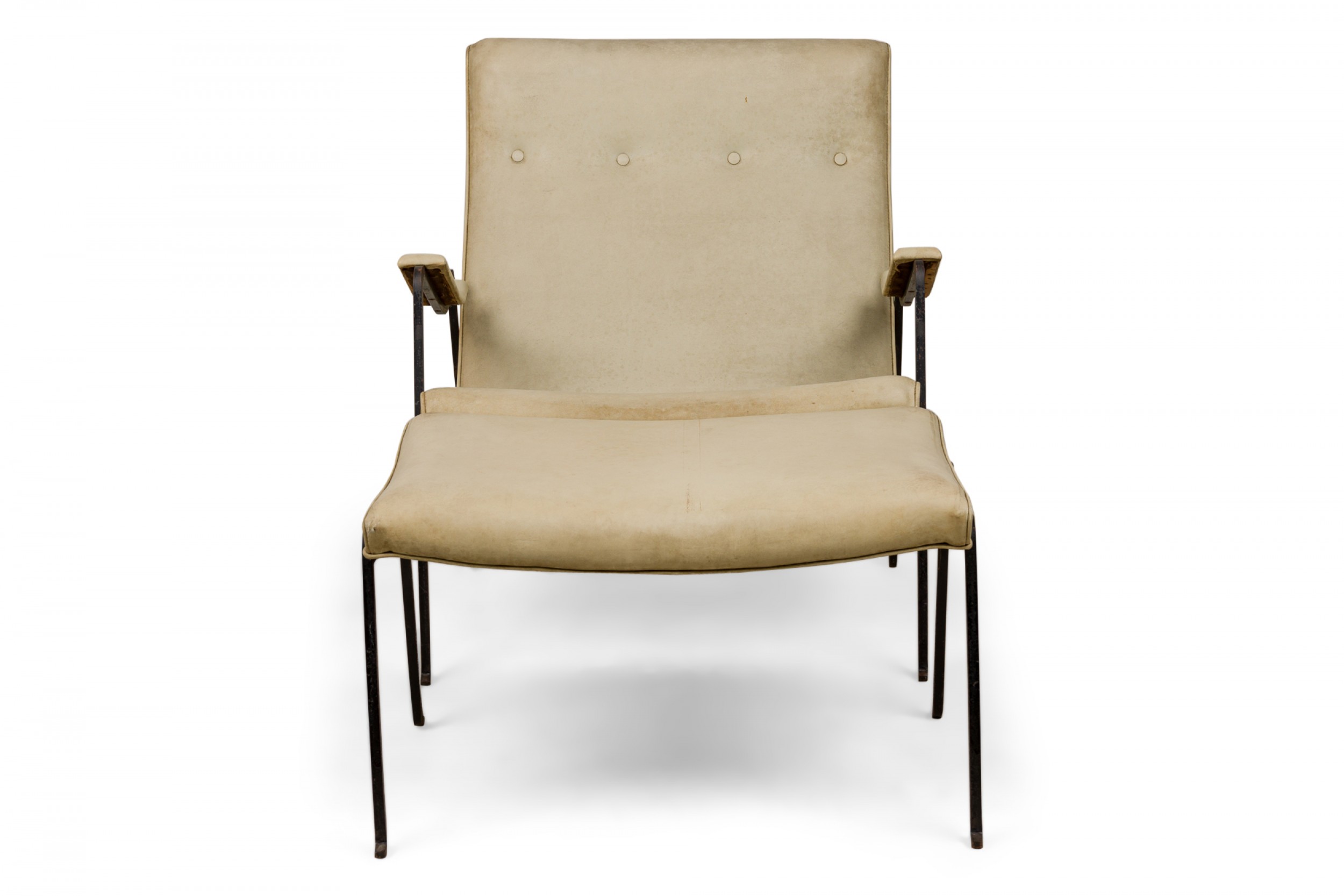American Mid-Century armchair and ottoman set with beige leather button tufted upholstered seats, backs, and arms, with black wrought iron frames ending in slightly curved feet. (MILO BAUGHMAN)(PRICED AS SET).