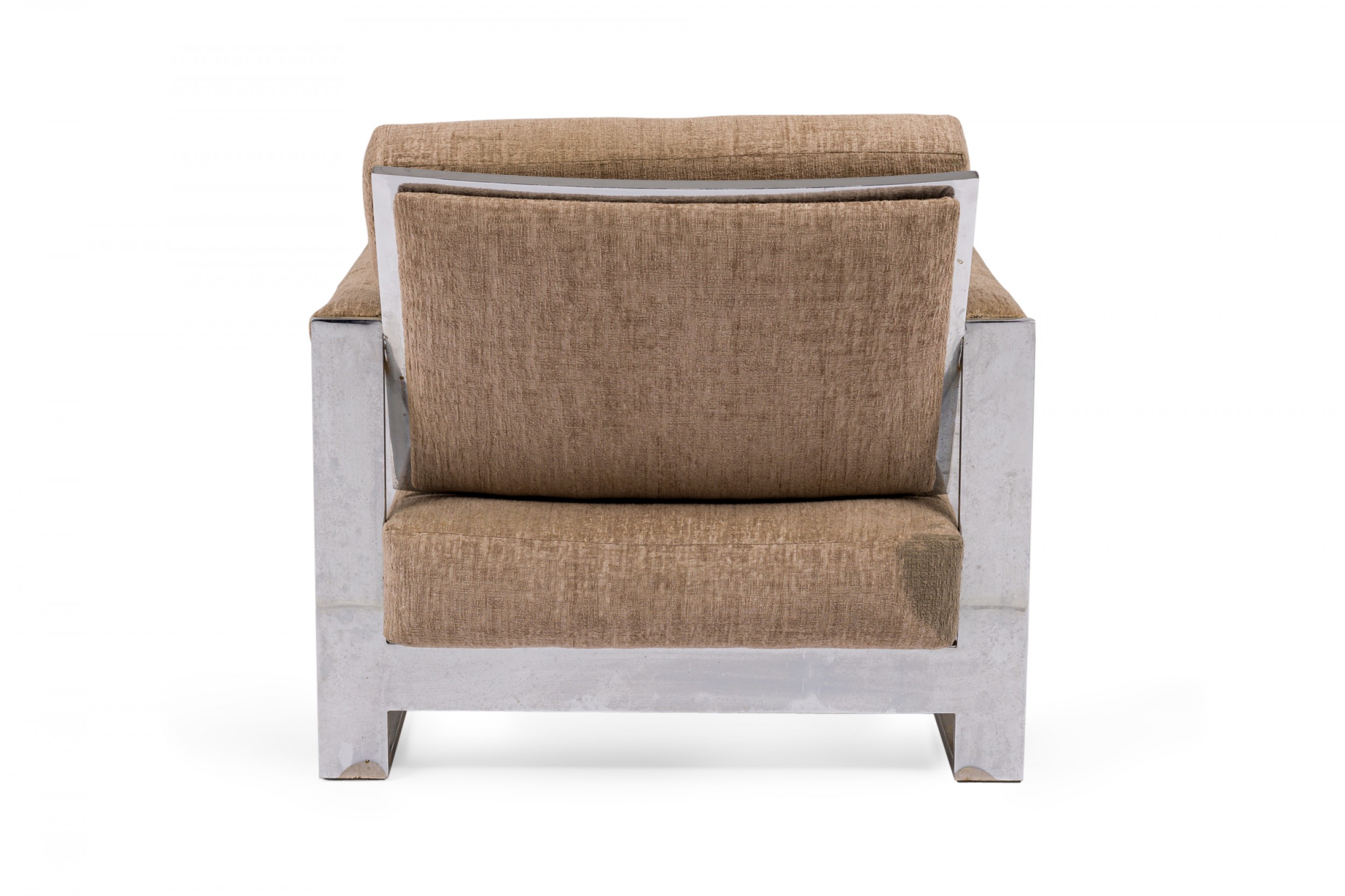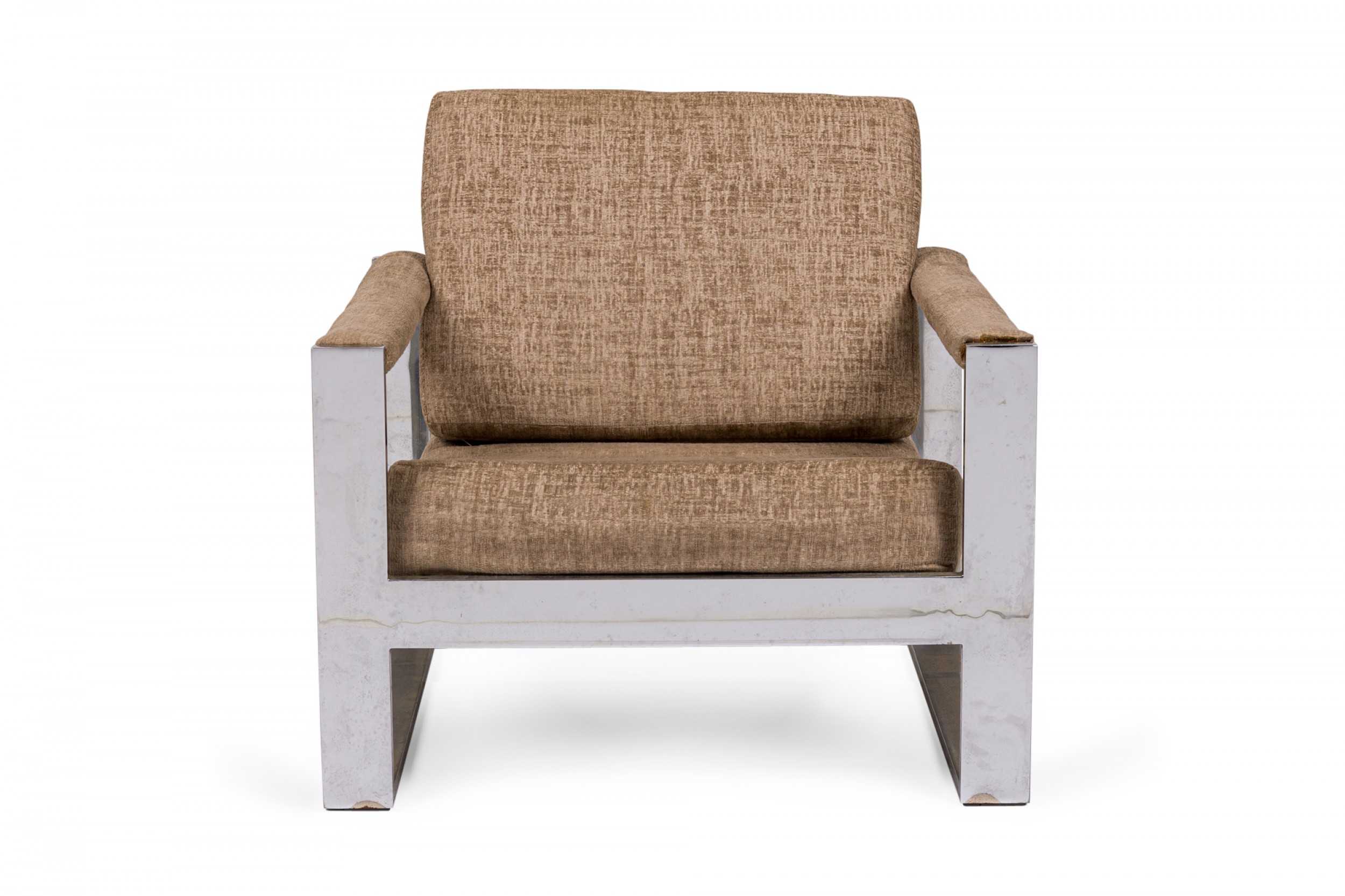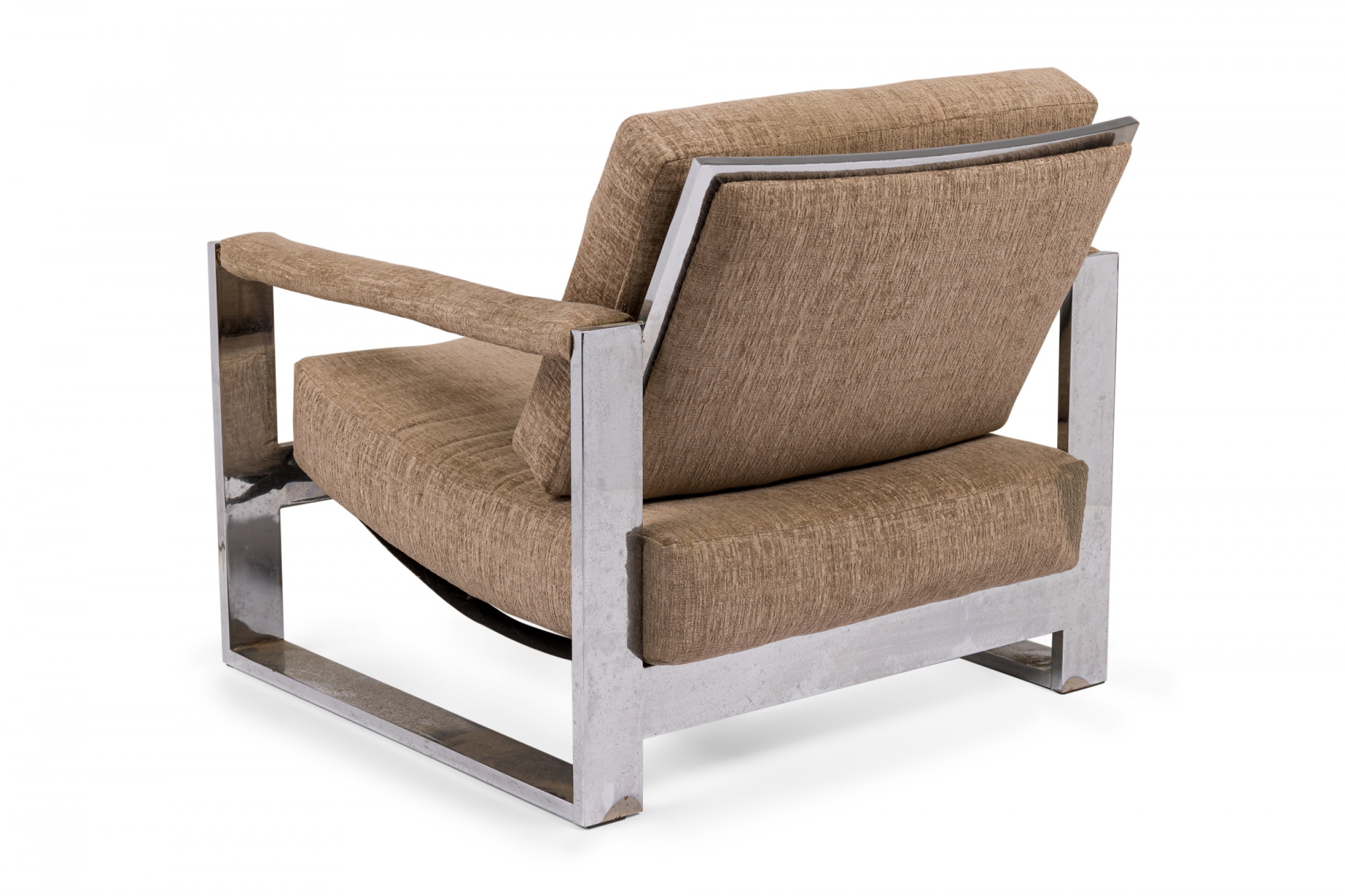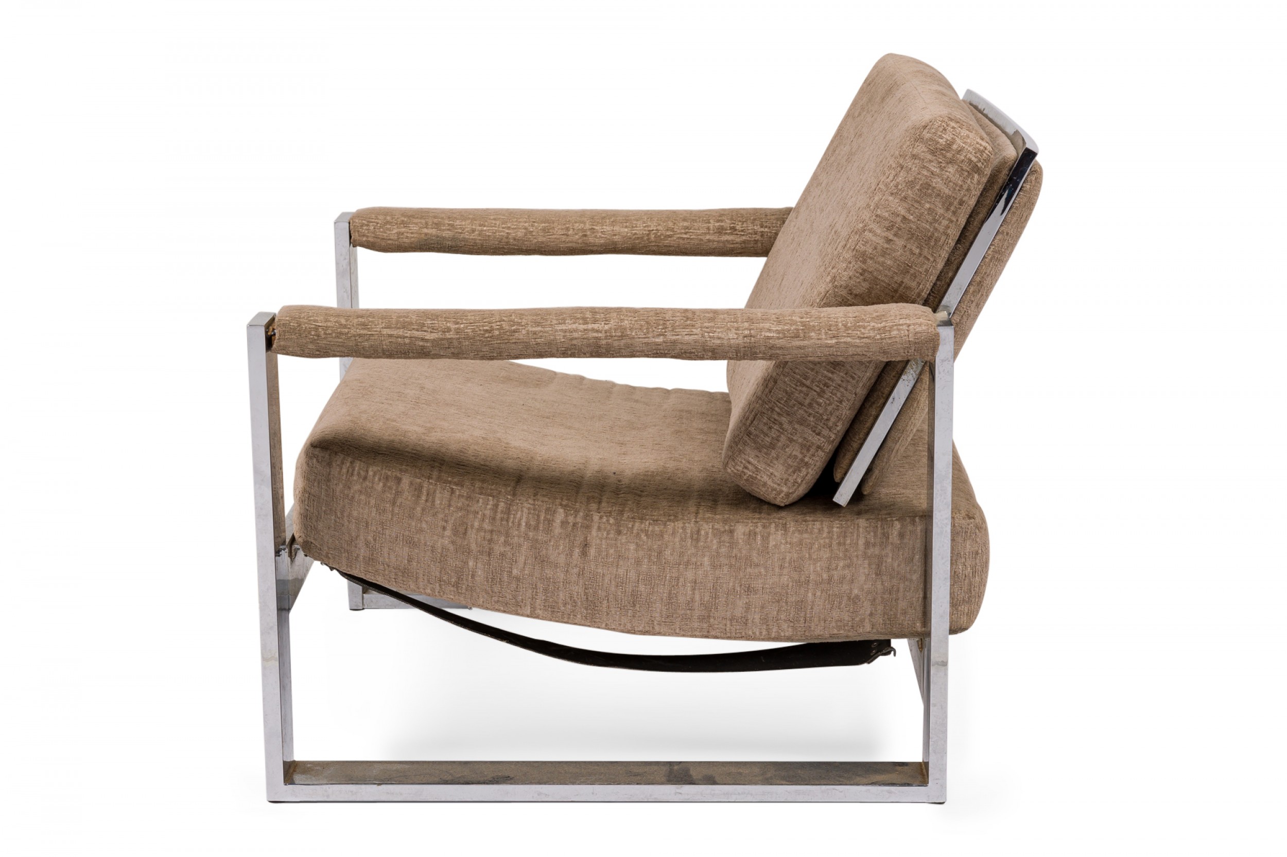 American Mid-Century 'Tank' form lounge / armchair with a flat bar polished chrome frame and textured light brown upholstered seat, back and arm covers. (MILO BAUGHMAN)(Similar piece: DUF0539, DUF0541).
