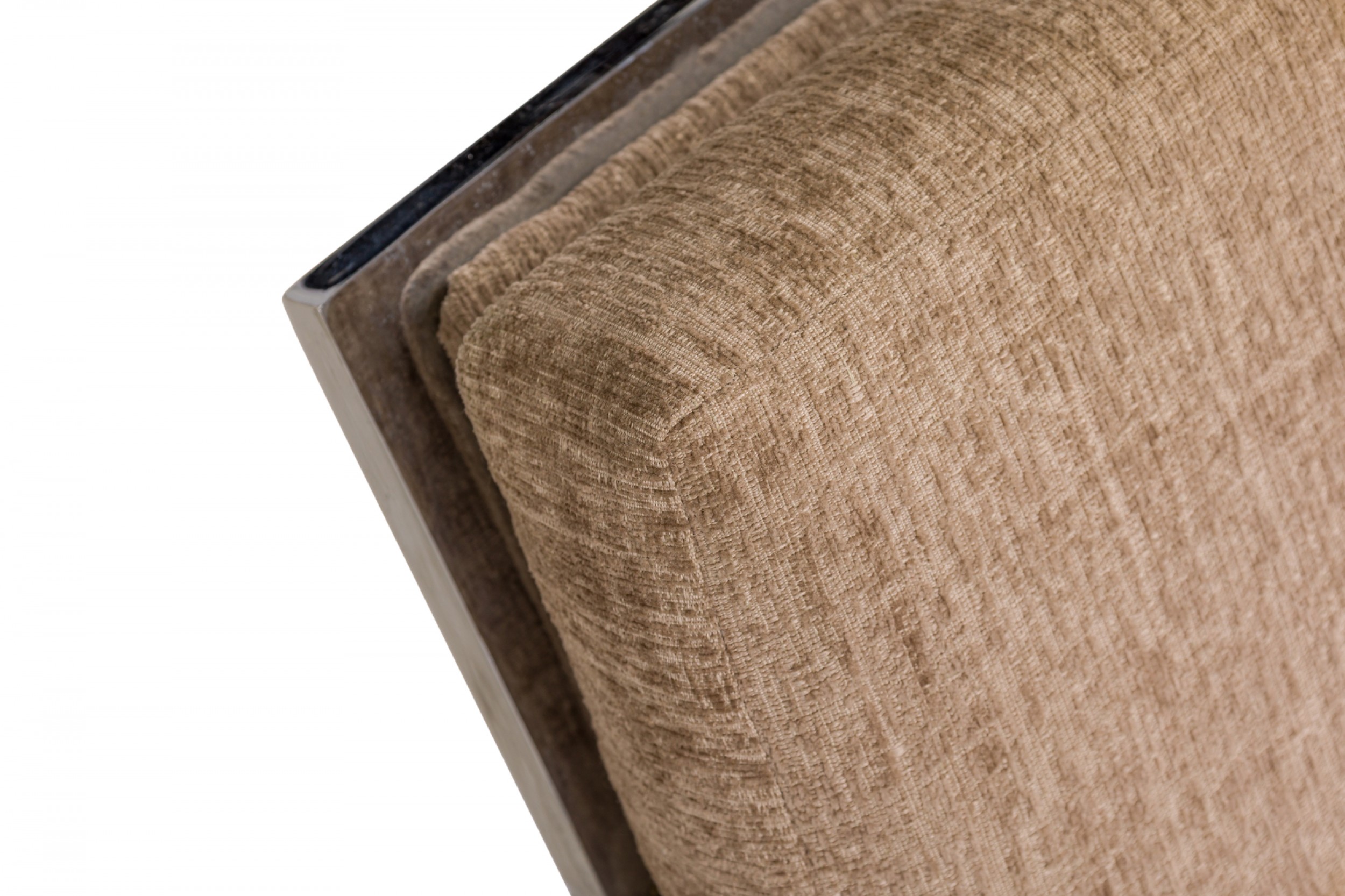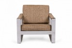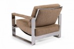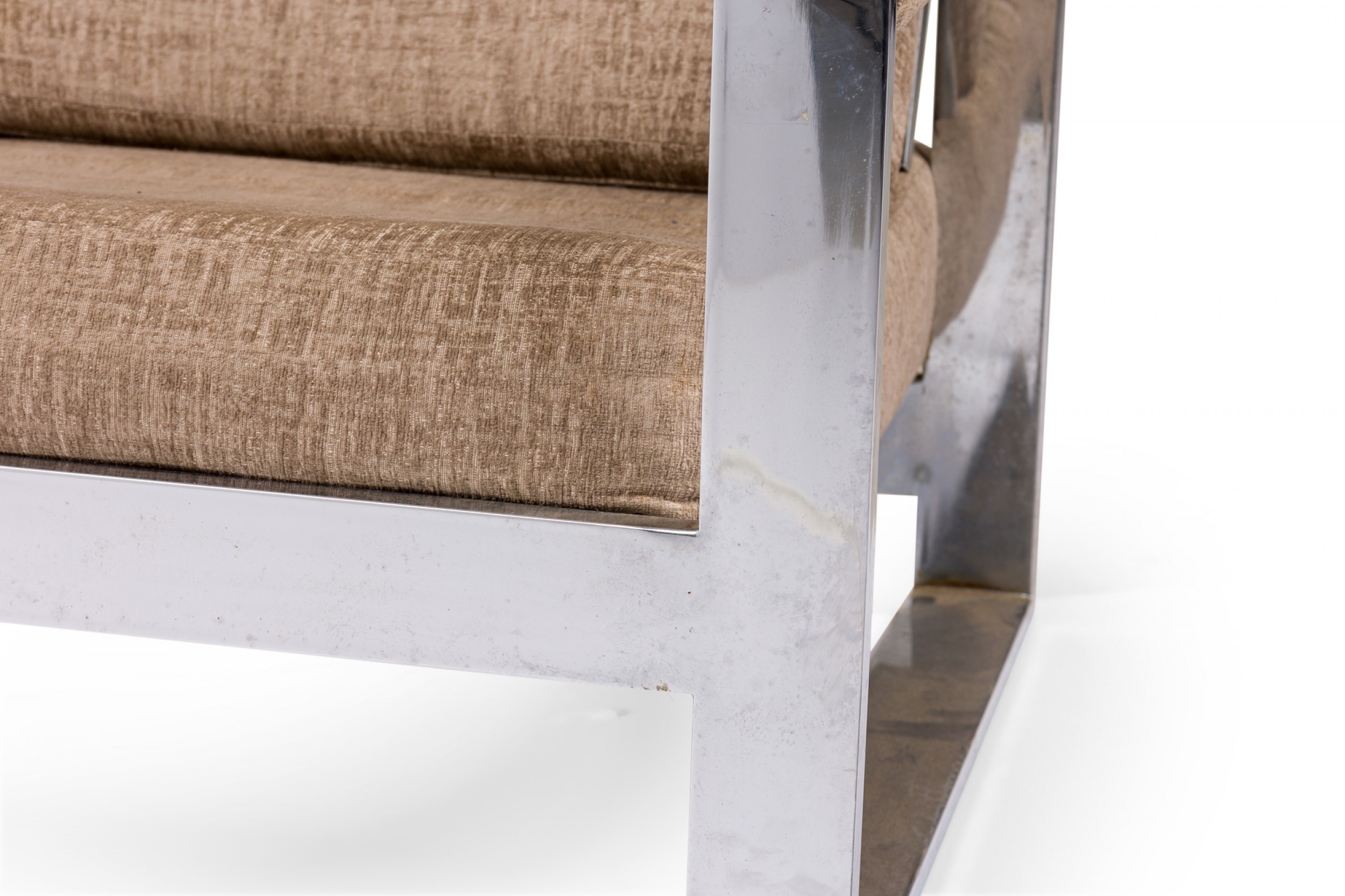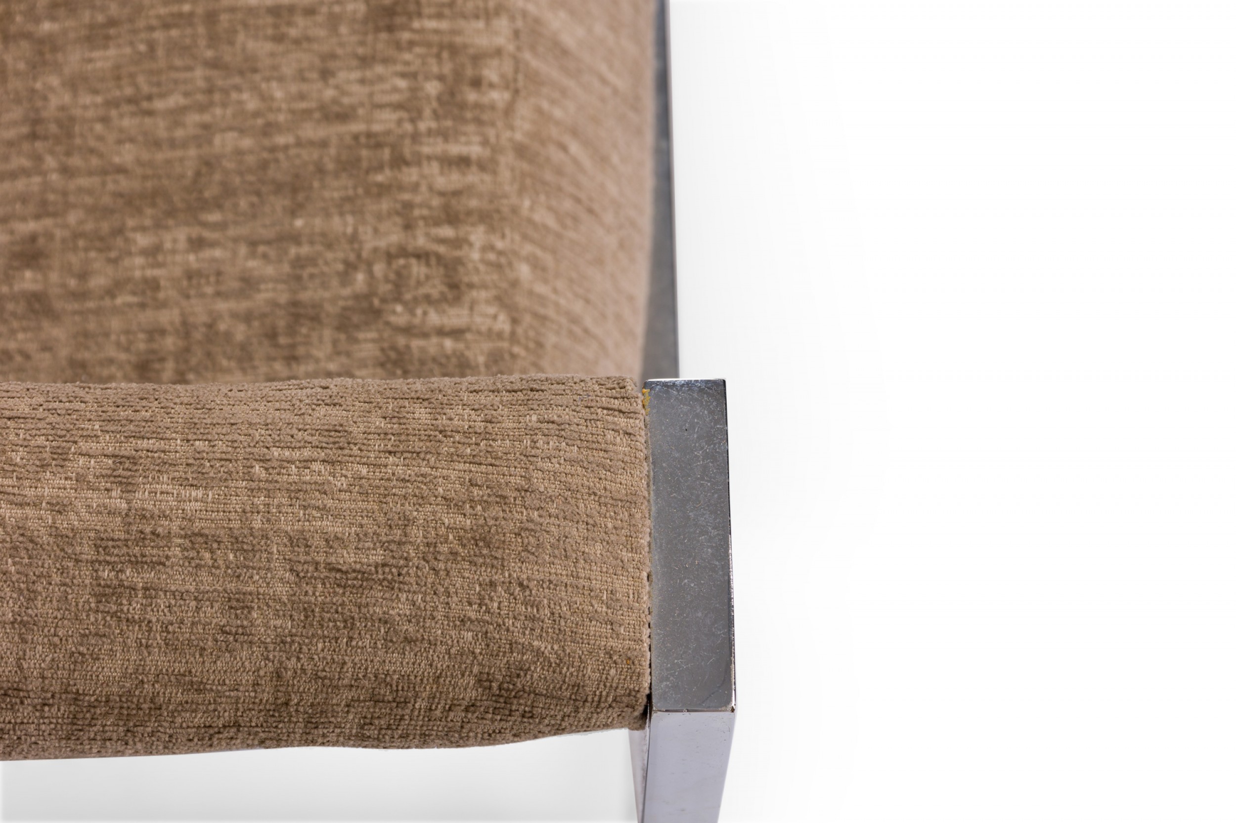 American Mid-Century 'Tank' form lounge / armchair with a flat bar polished chrome frame and textured light brown upholstered seat, back and arm covers. (MILO BAUGHMAN)(Similar piece: DUF0539, DUF0541).