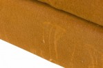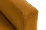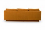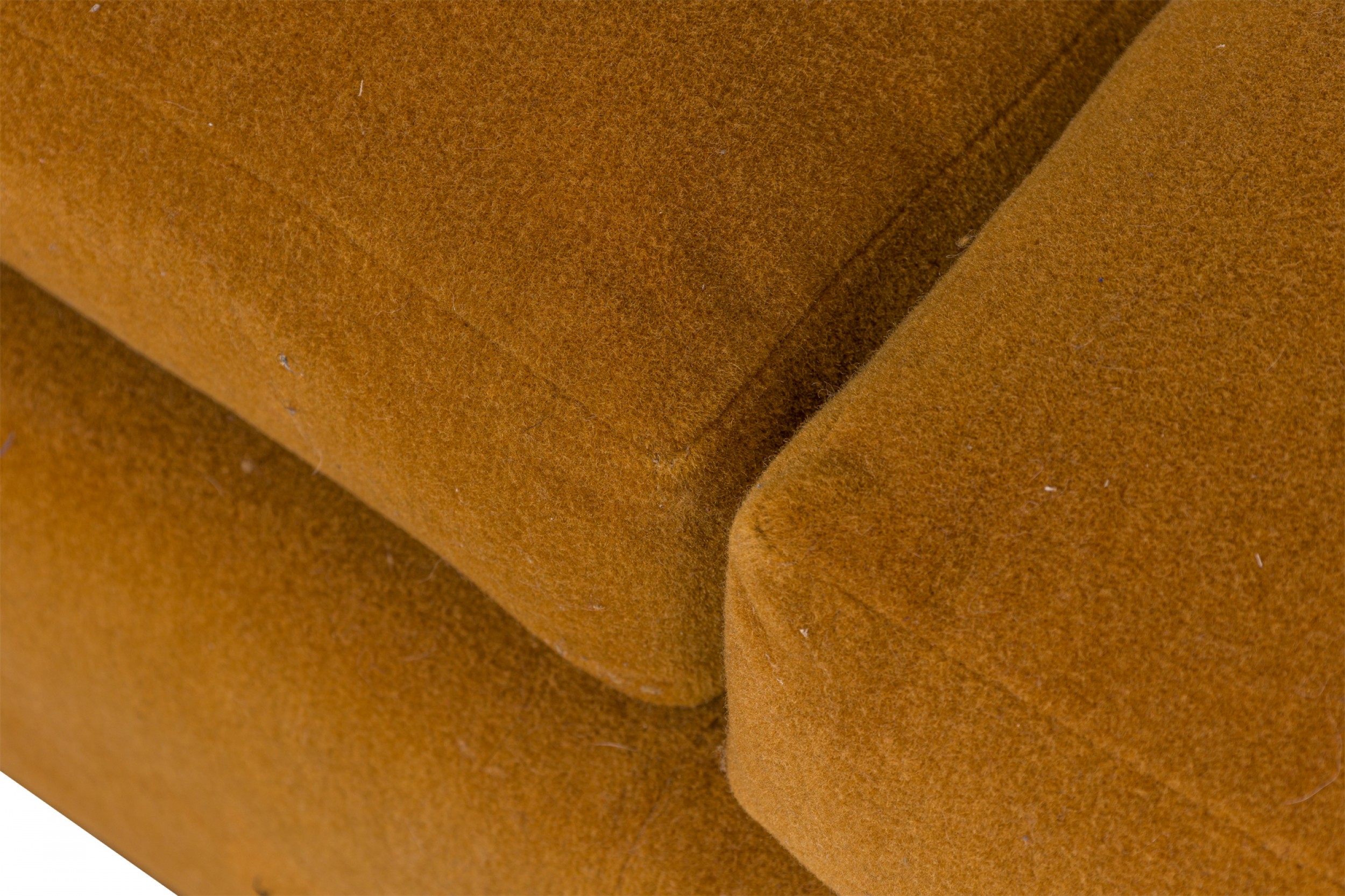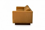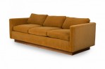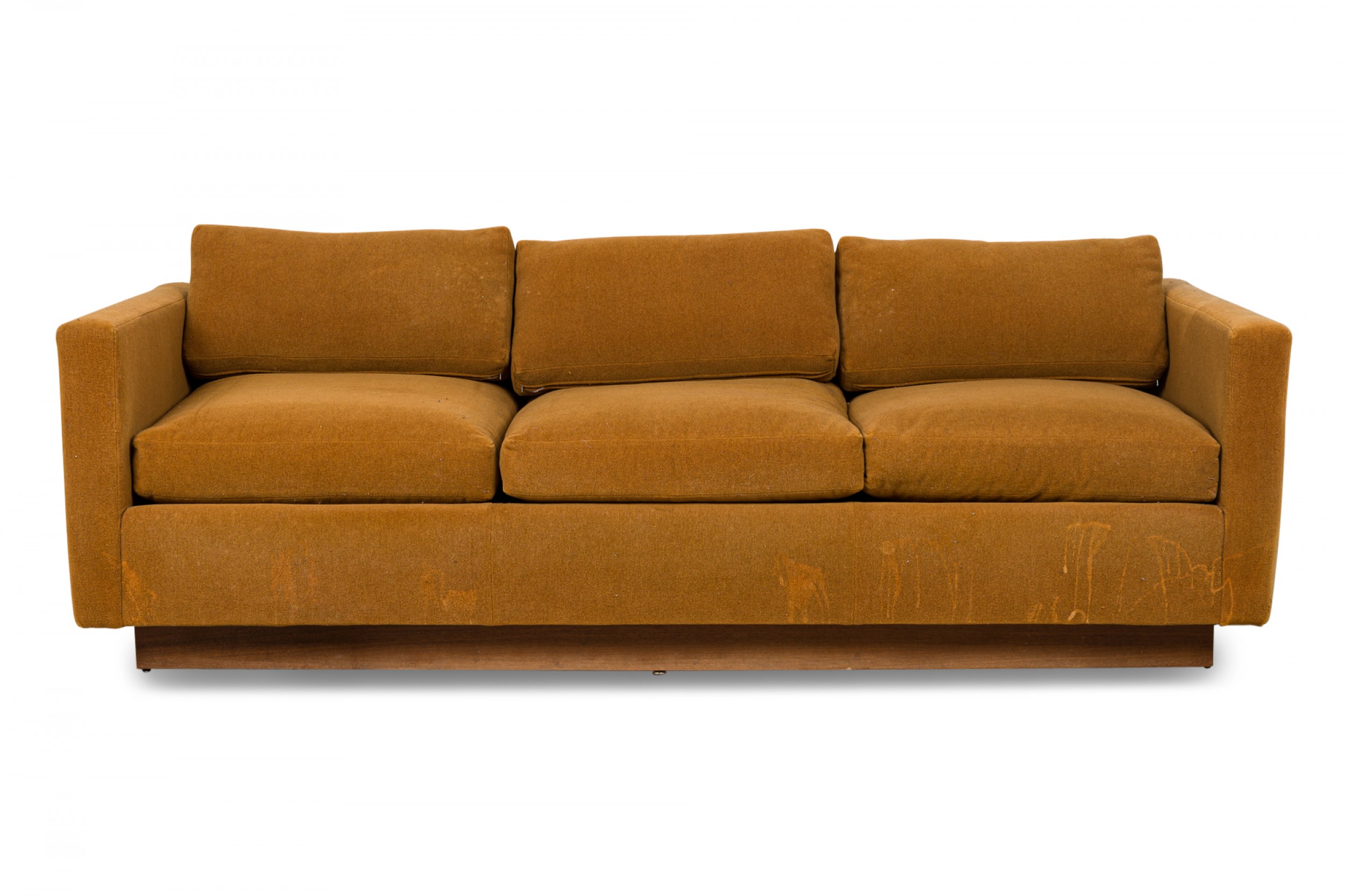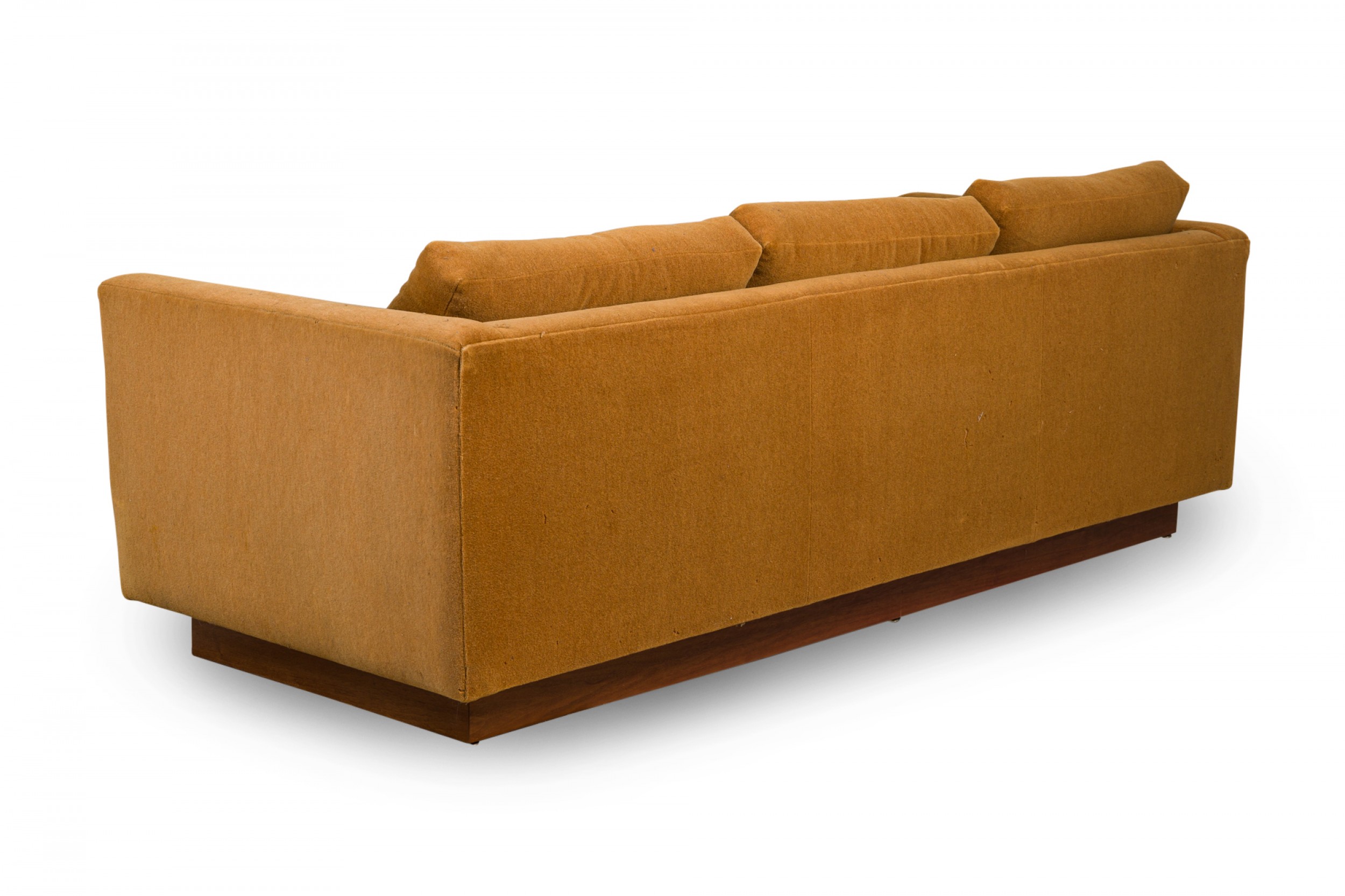American Mid-Century 'Tuxedo' form sofa in gold colored fabric upholstery resting on a wooden platform base. (MILO BAUGHMAN).