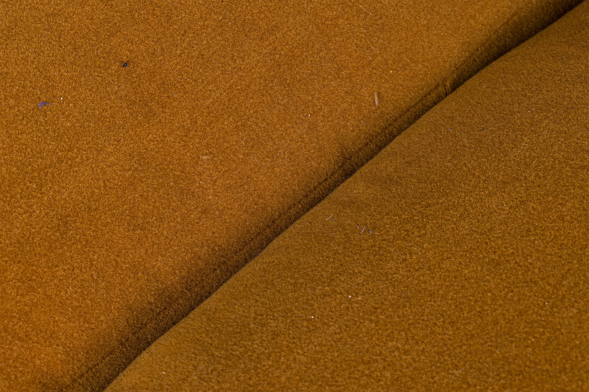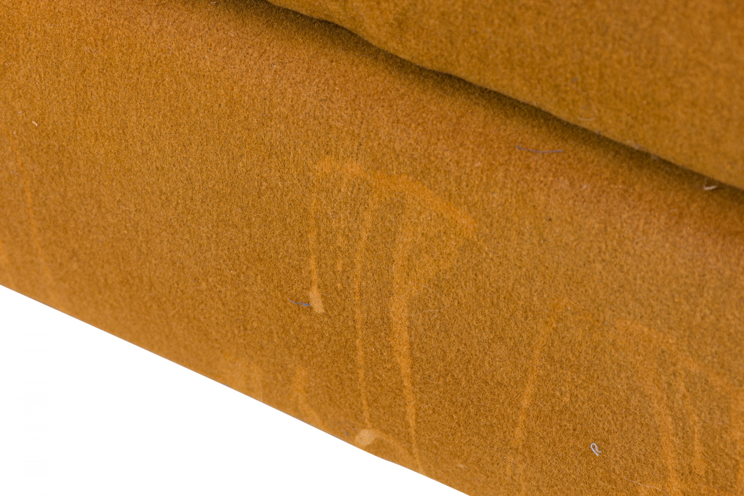 American Mid-Century 'Tuxedo' form sofa in gold colored fabric upholstery resting on a wooden platform base. (MILO BAUGHMAN)