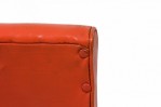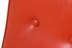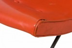 American Mid-Century slipper / side chair with orange vinyl button tufted upholstery, resting on four curved wrought iron legs ending in small circular feet. (MILO BAUGHMAN).