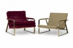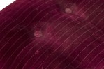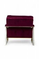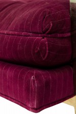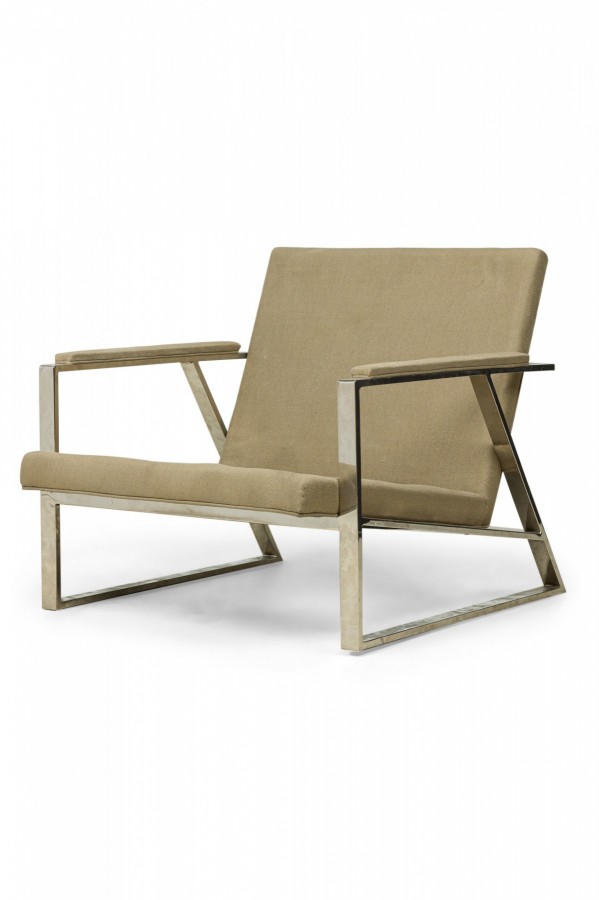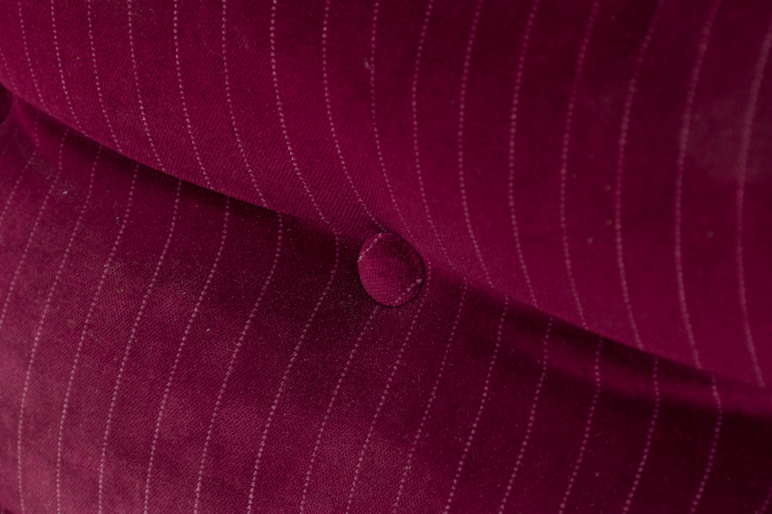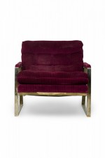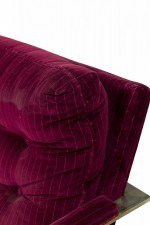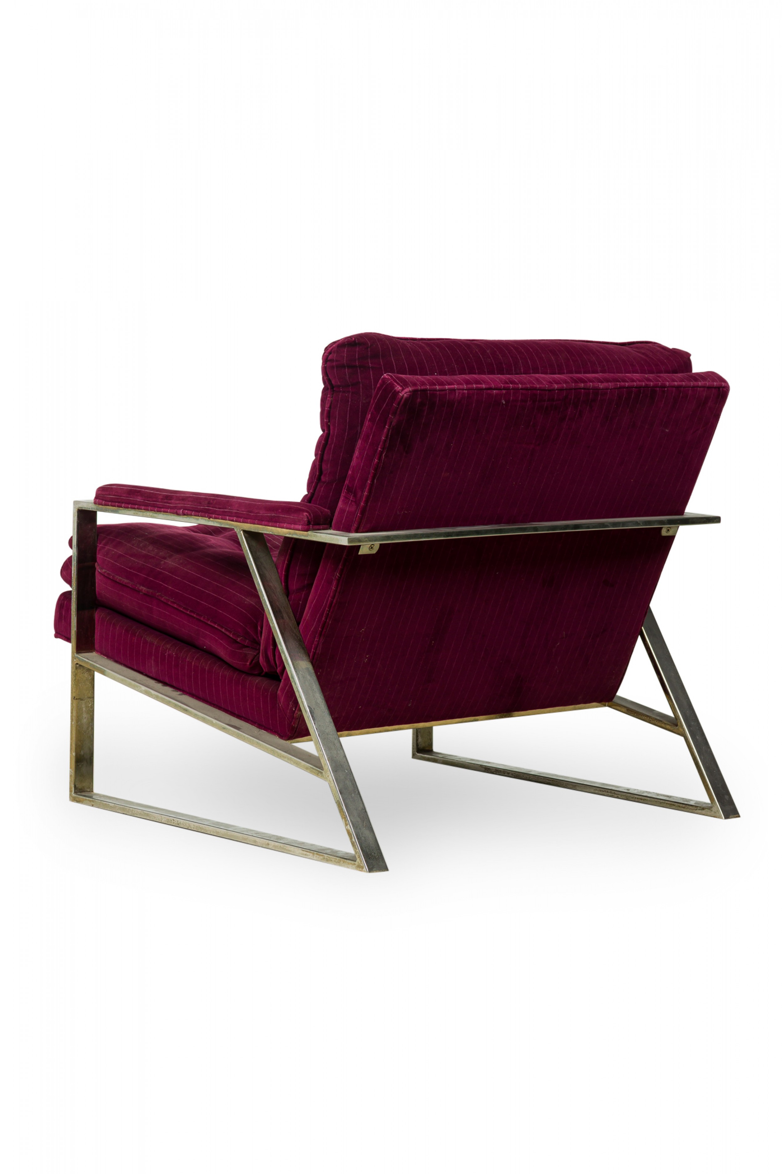 American Mid-Century lounge armchair with a polished chrome flat bar frame, upholstered in a pinstriped raspberry purple velour fabric and having a seat and back cushion (MILO BAUGHMAN)(Similar chair in beige / taupe upholstery without seat and back cushion: REG5102A)