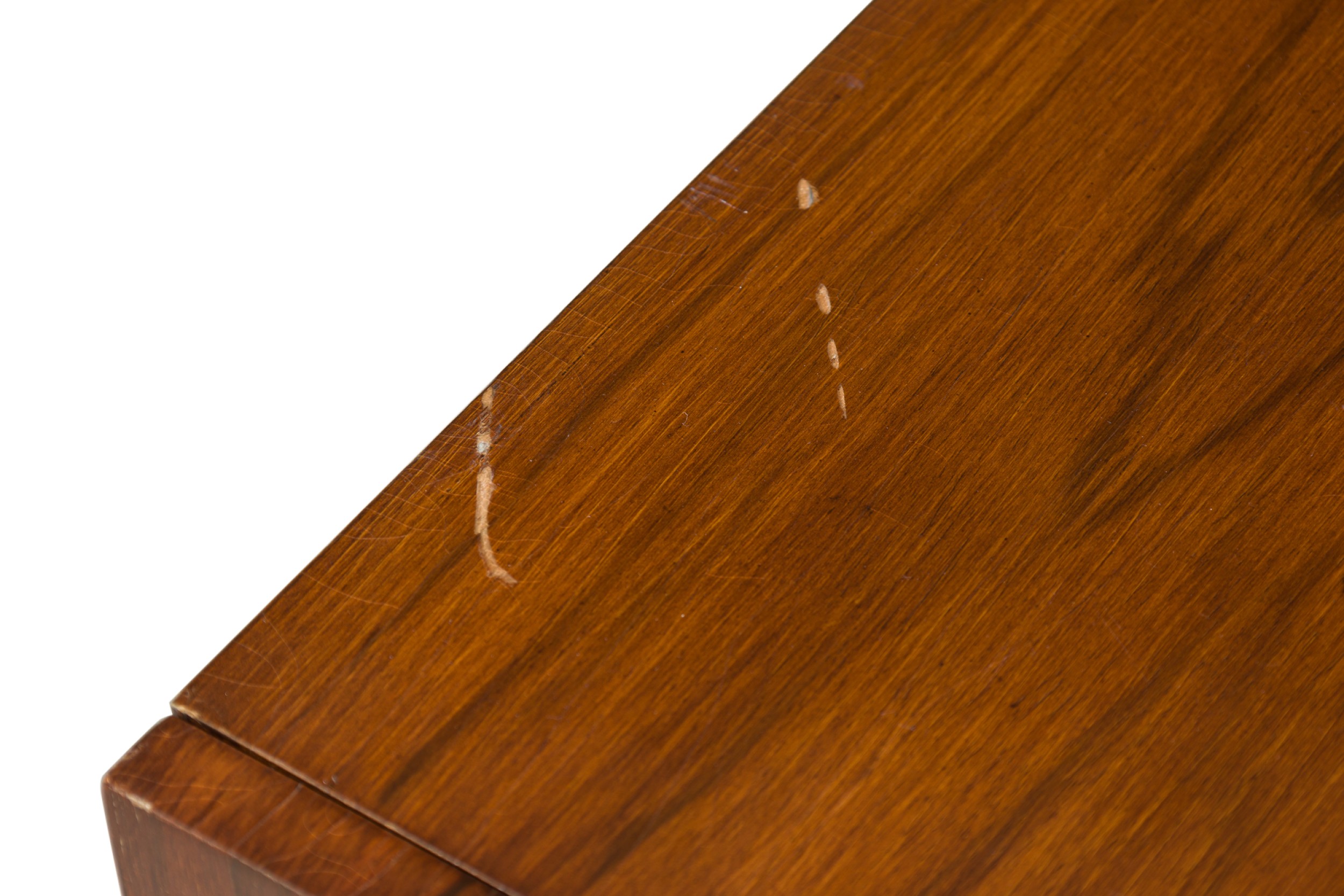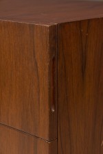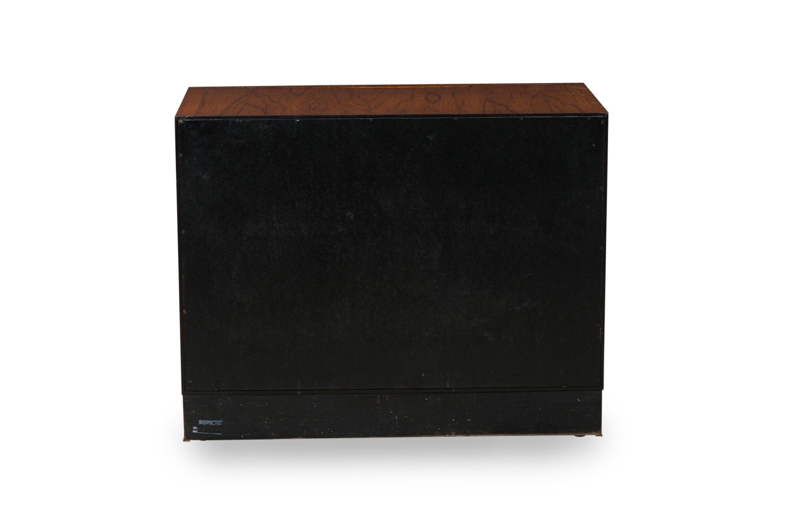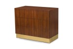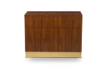 American Mid-Century 3-drawer commode / chest of drawers finished in rosewood veneer and a brass veneer band around the base. (MILO BAUGHMAN).