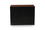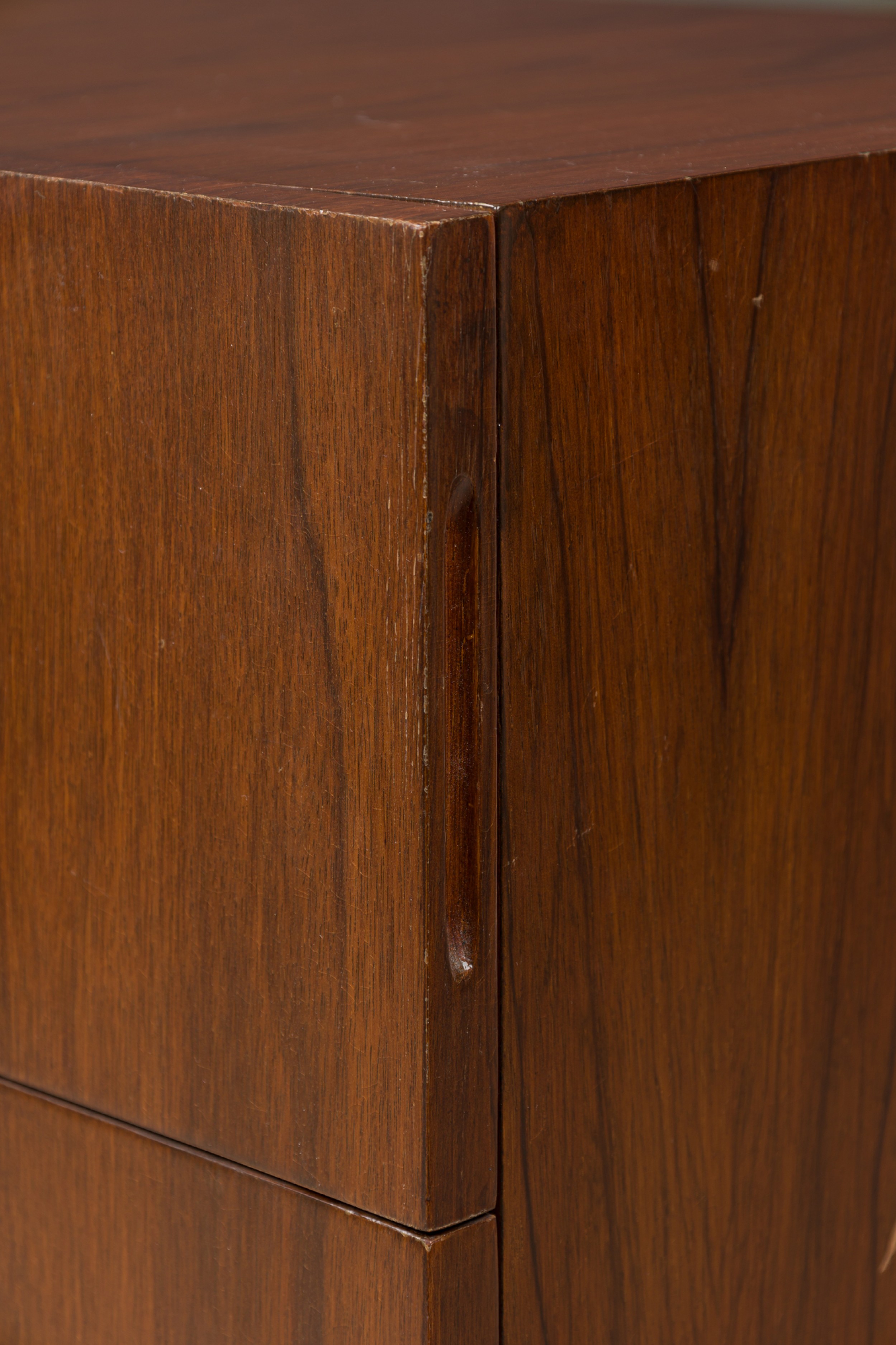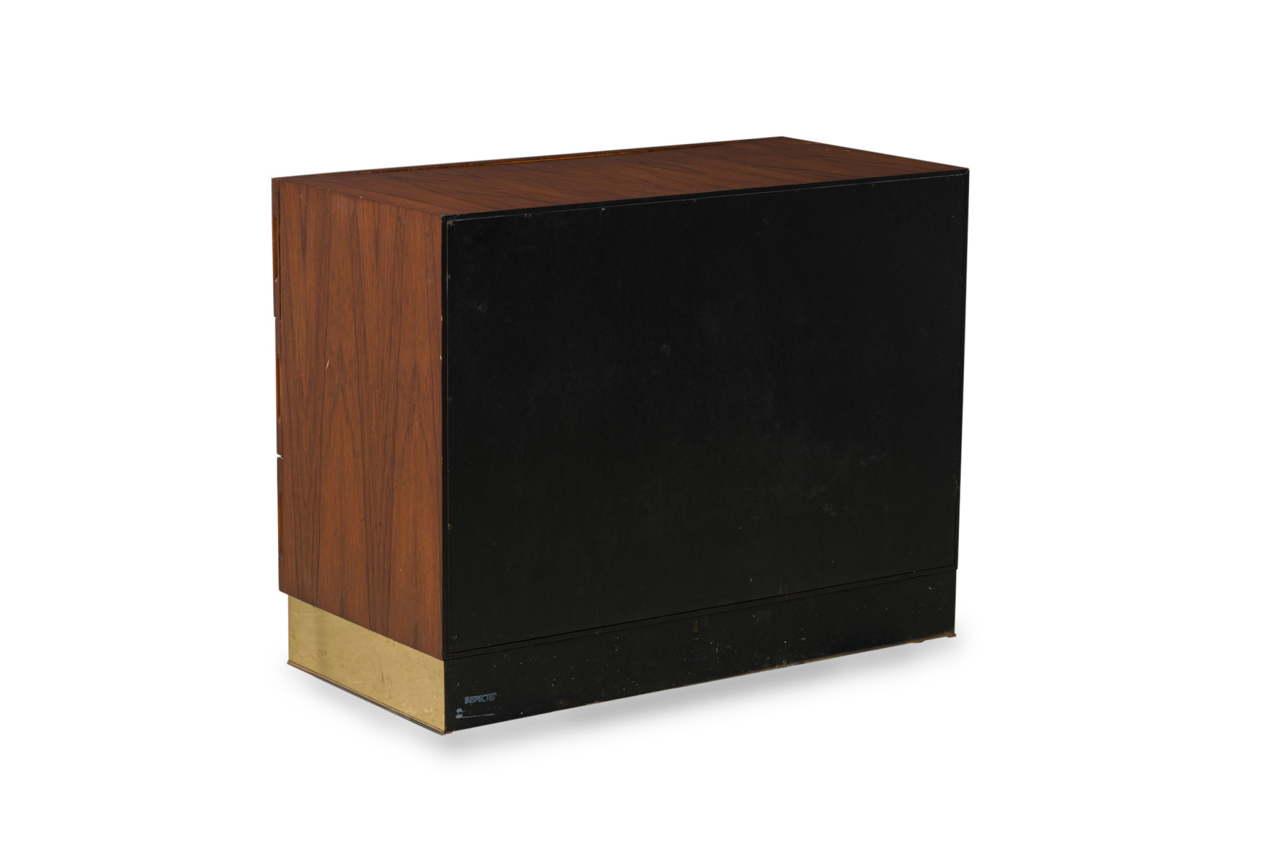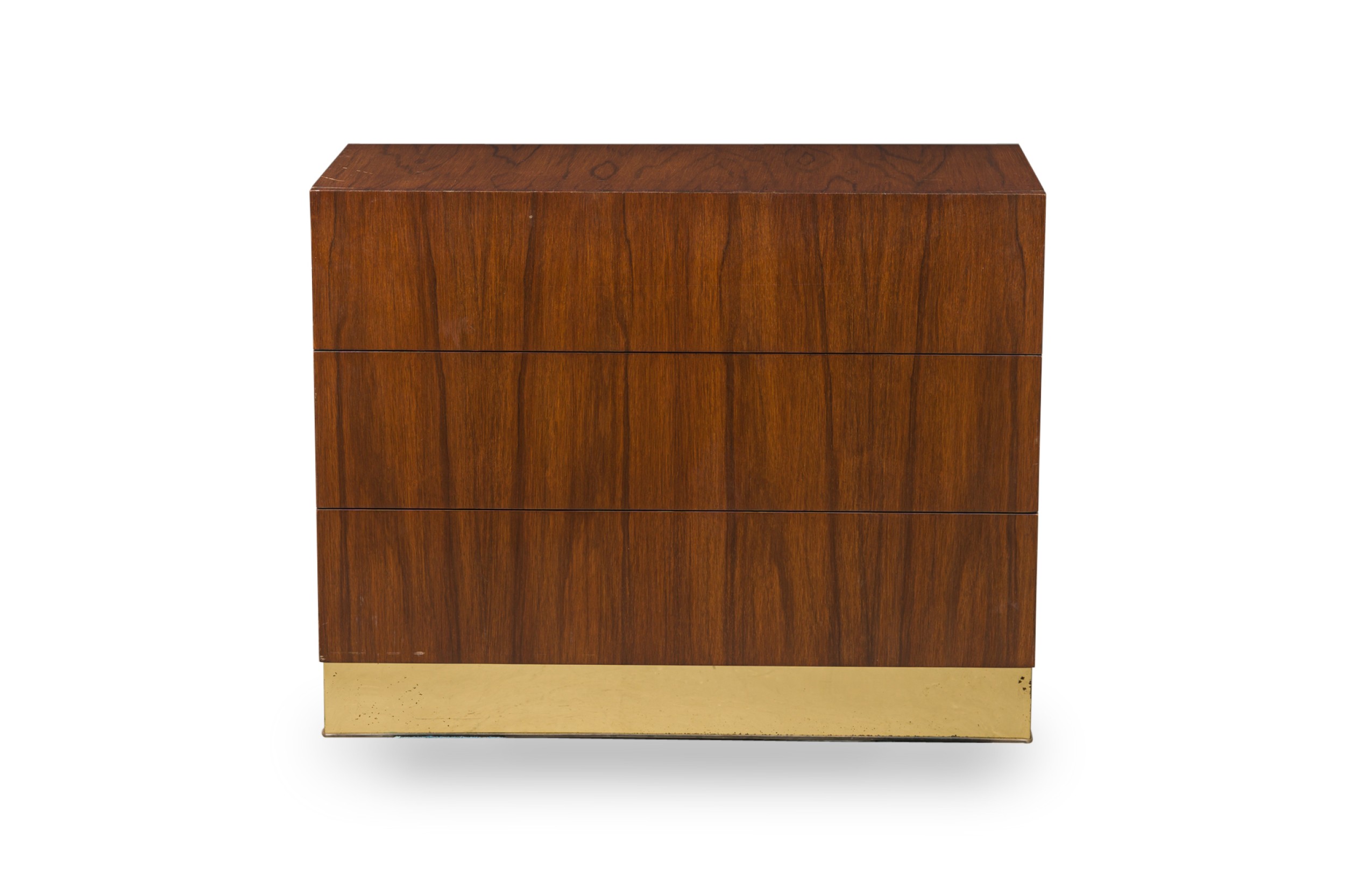American Mid-Century 3-drawer commode / chest of drawers finished in rosewood veneer and a brass veneer band around the base. (MILO BAUGHMAN)