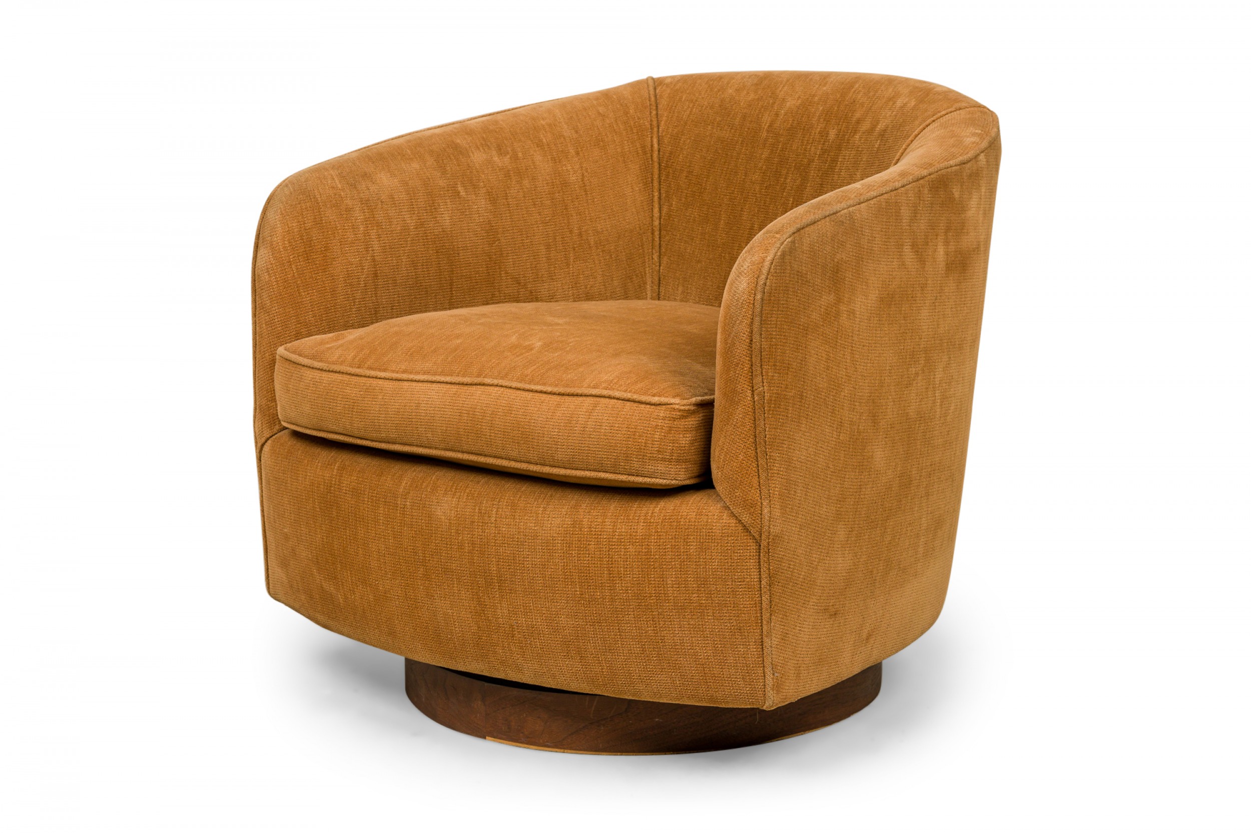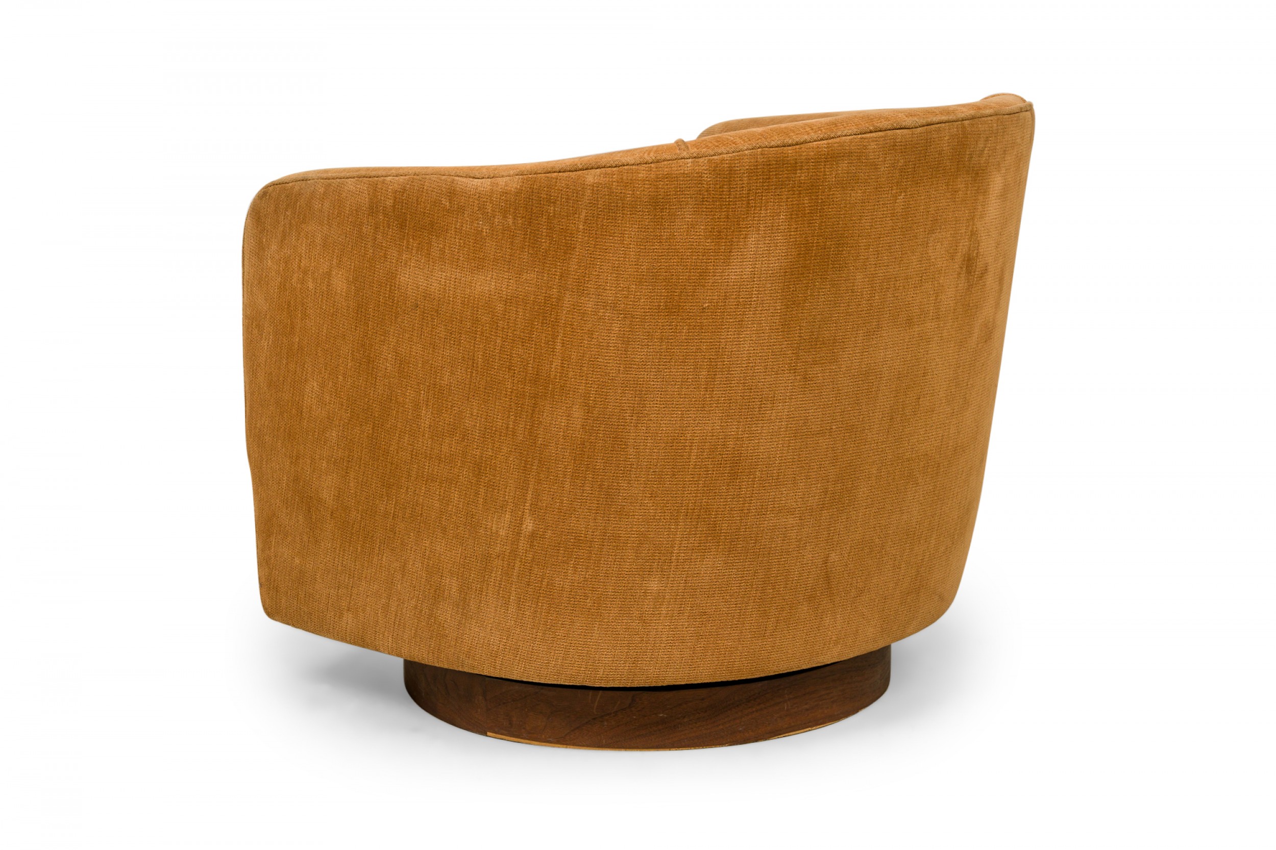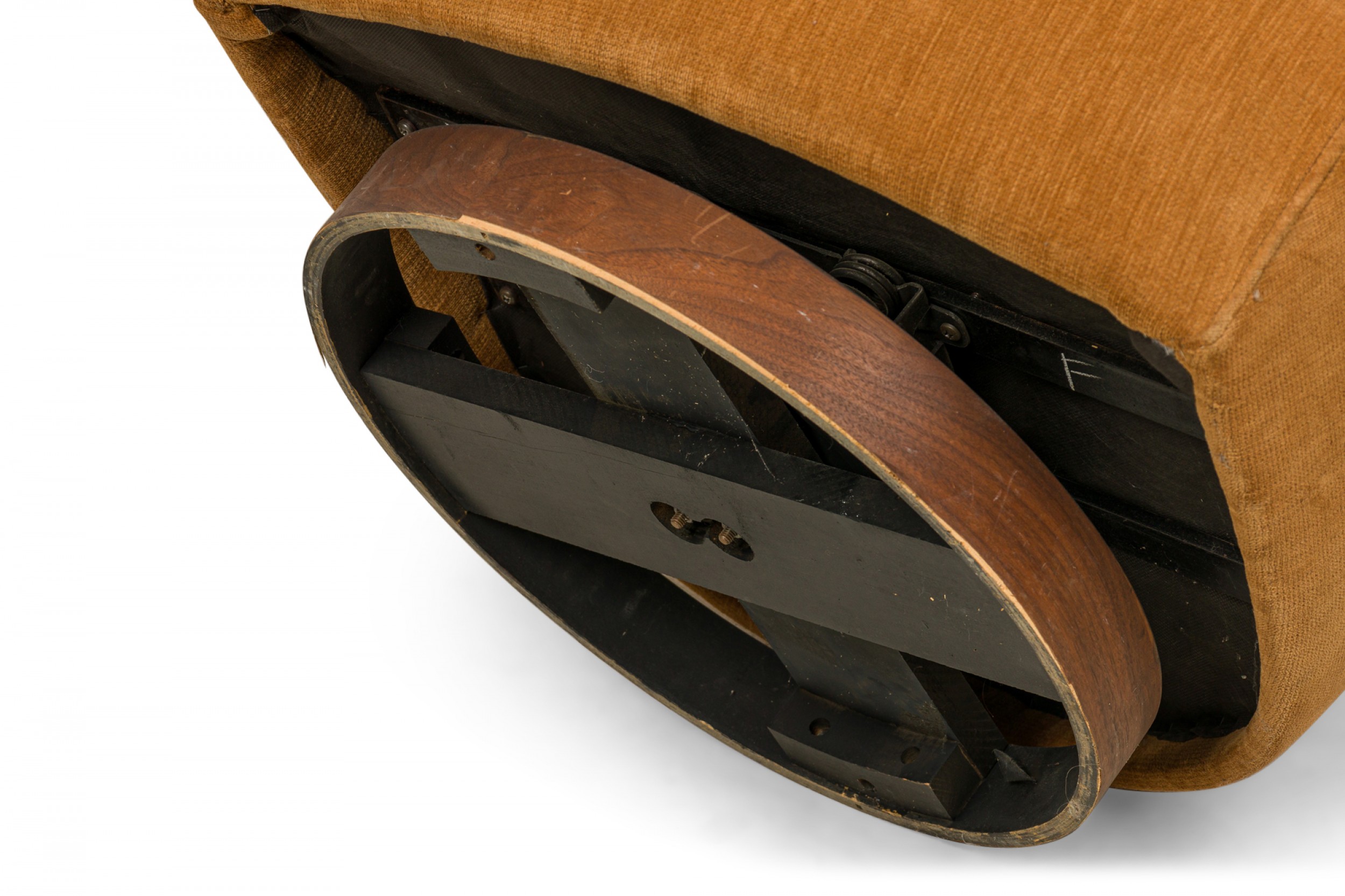American Mid-Century horseshoe-form lounge / armchair upholstered in light brown velour, resting on a circular wood veneer plinth base. (MILO BAUGHMAN FOR THAYER COGGIN)(Similar pieces: DUF0615,DUF0617)