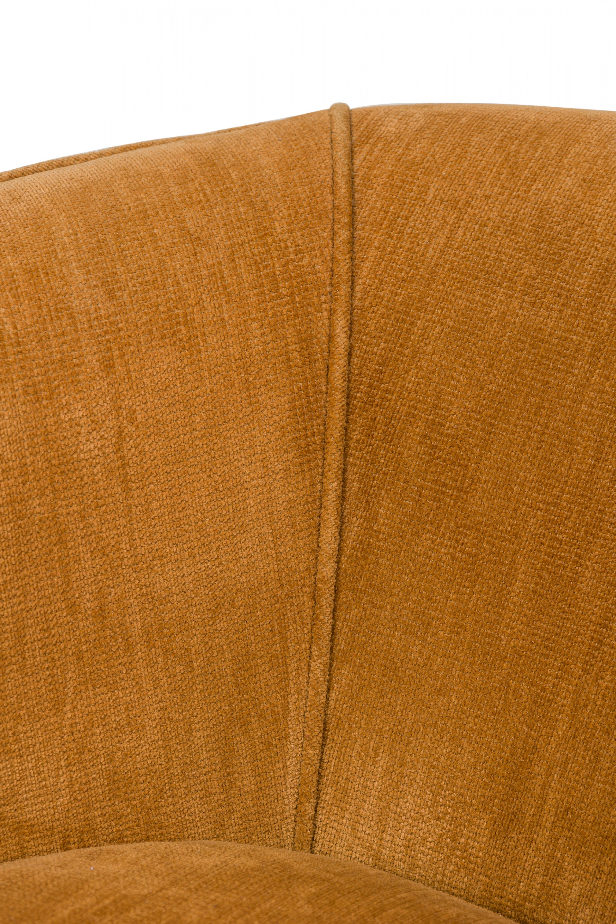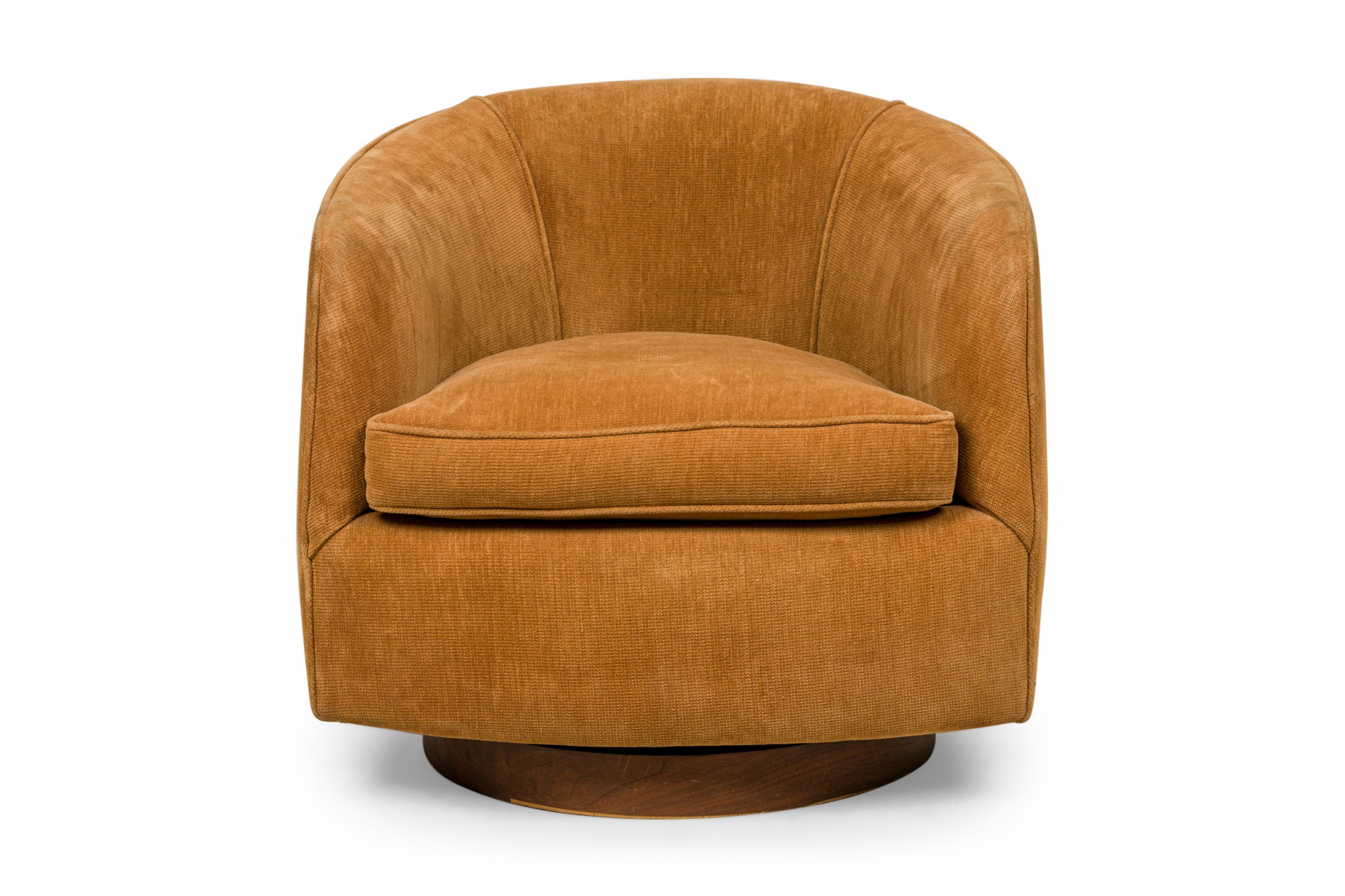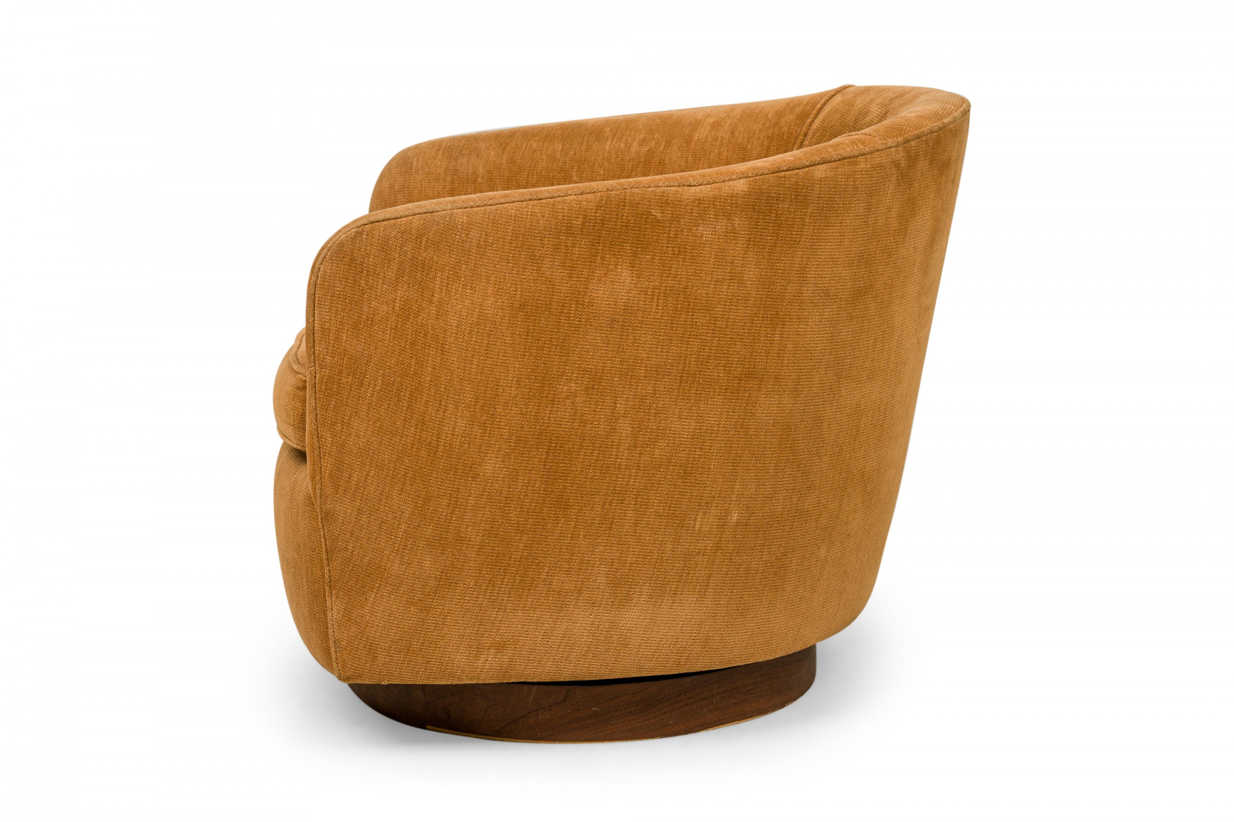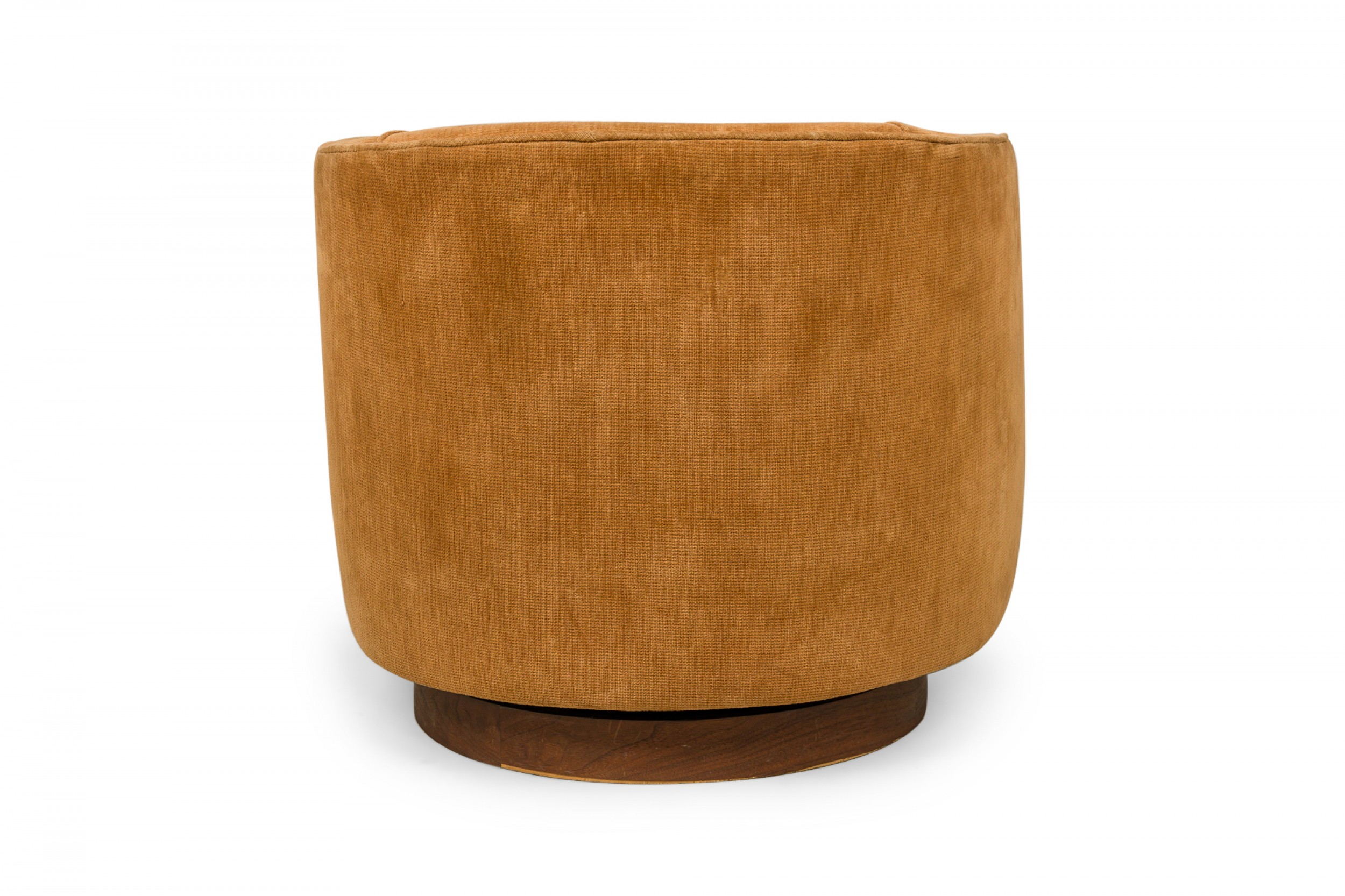 American Mid-Century horseshoe-form lounge / armchair upholstered in light brown velour, resting on a circular wood veneer plinth base. (MILO BAUGHMAN FOR THAYER COGGIN)(Similar pieces: DUF0615,DUF0617)