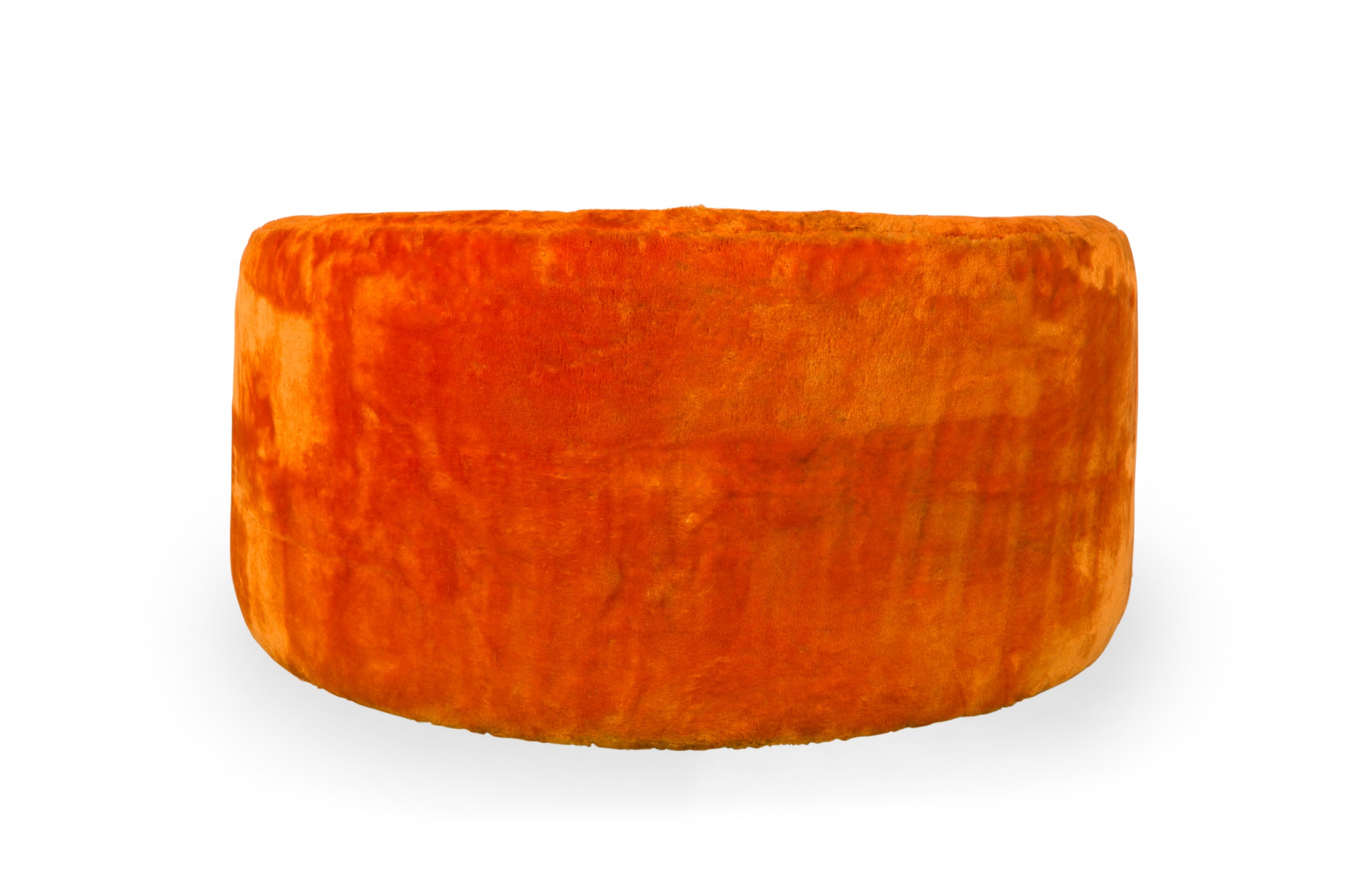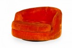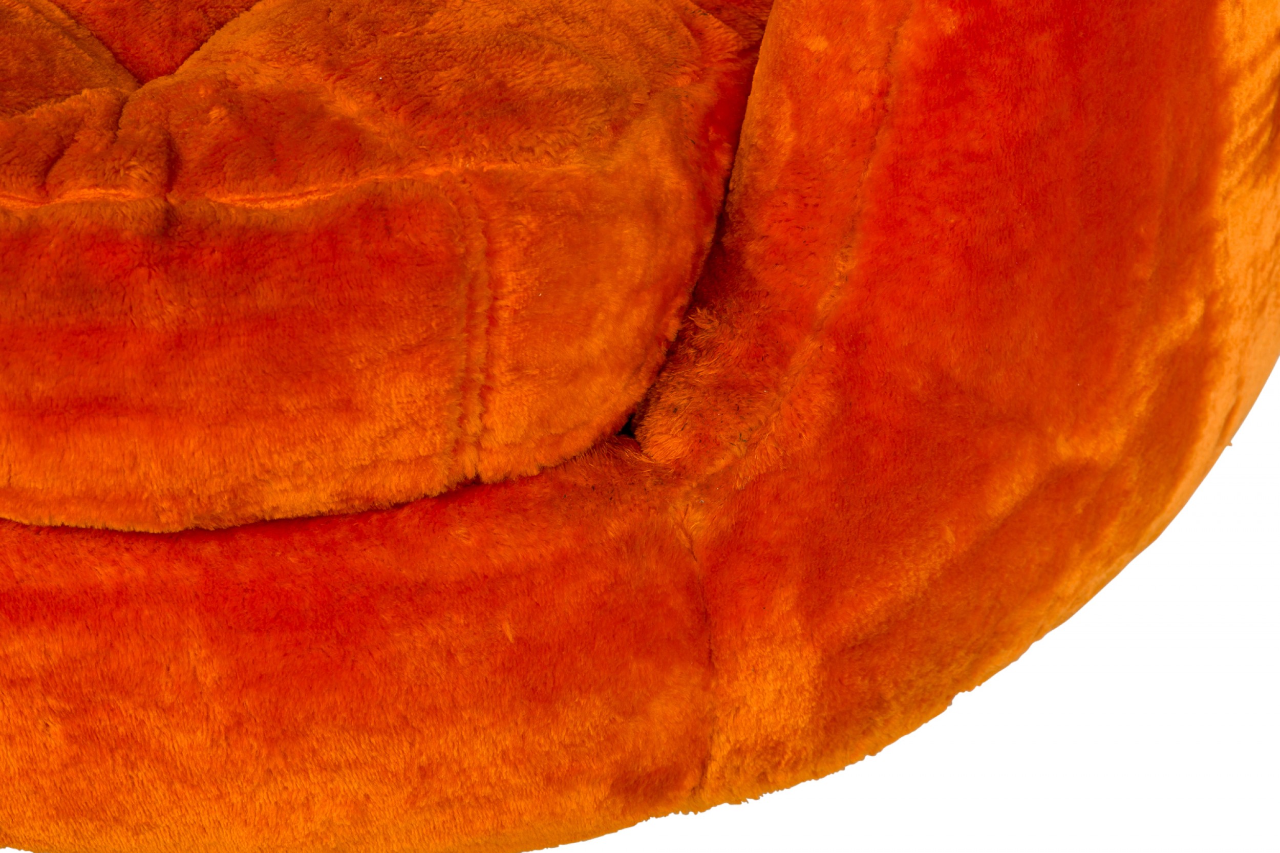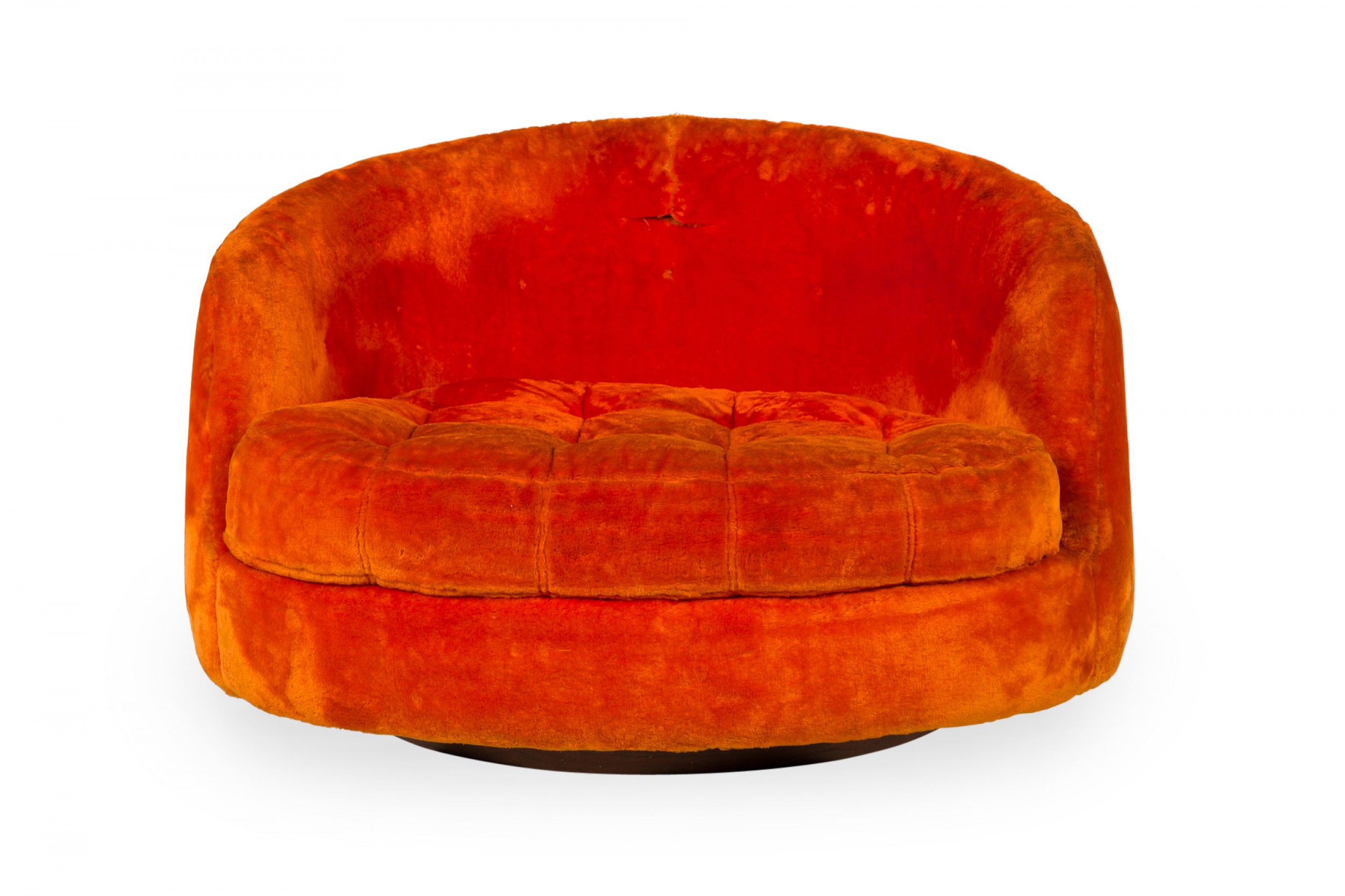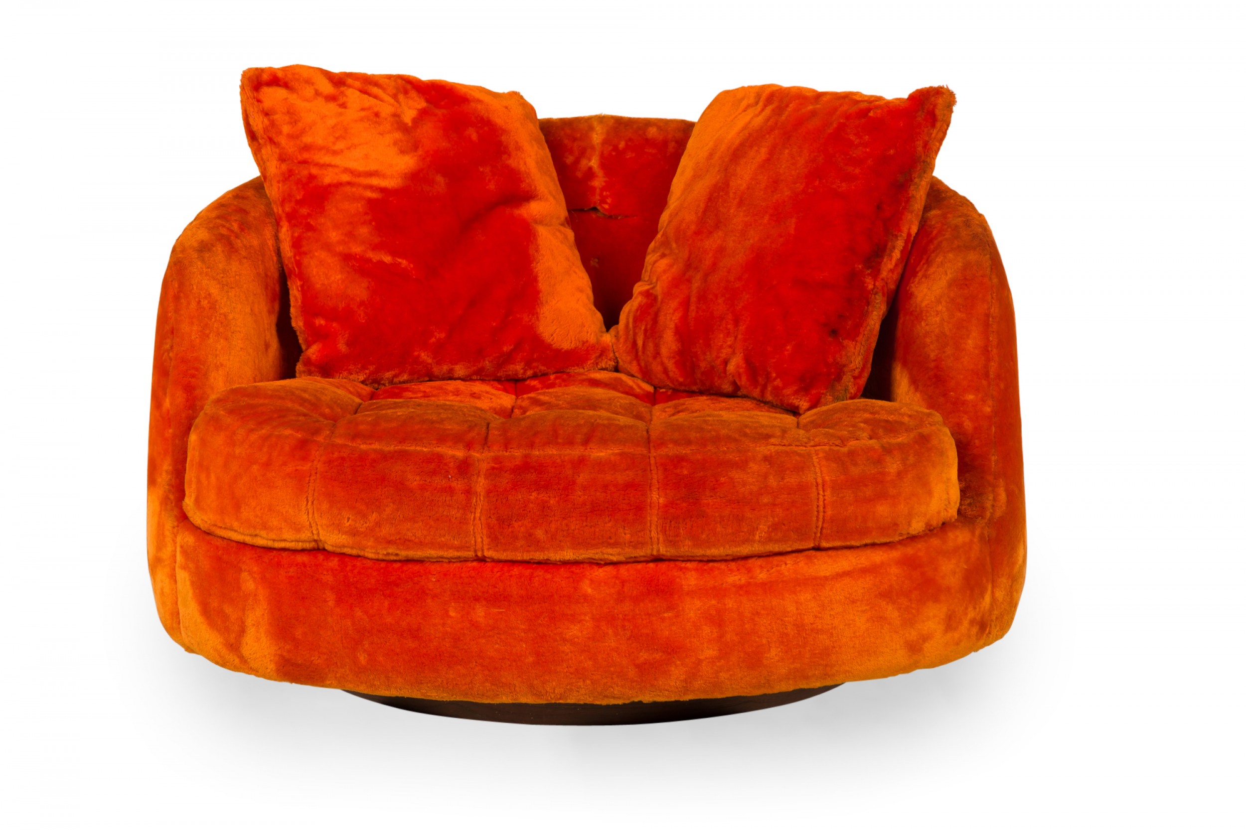 American Mid-Century 'Satellite' swiveling lounge / armchair with a circular form, curved back, and oversized seat, upholstered in bright orange faux fur upholstered with a removable button tufted seat cushion and two matching throw pillows. (MILO BAUGHMAN FOR THAYER COGGIN)