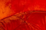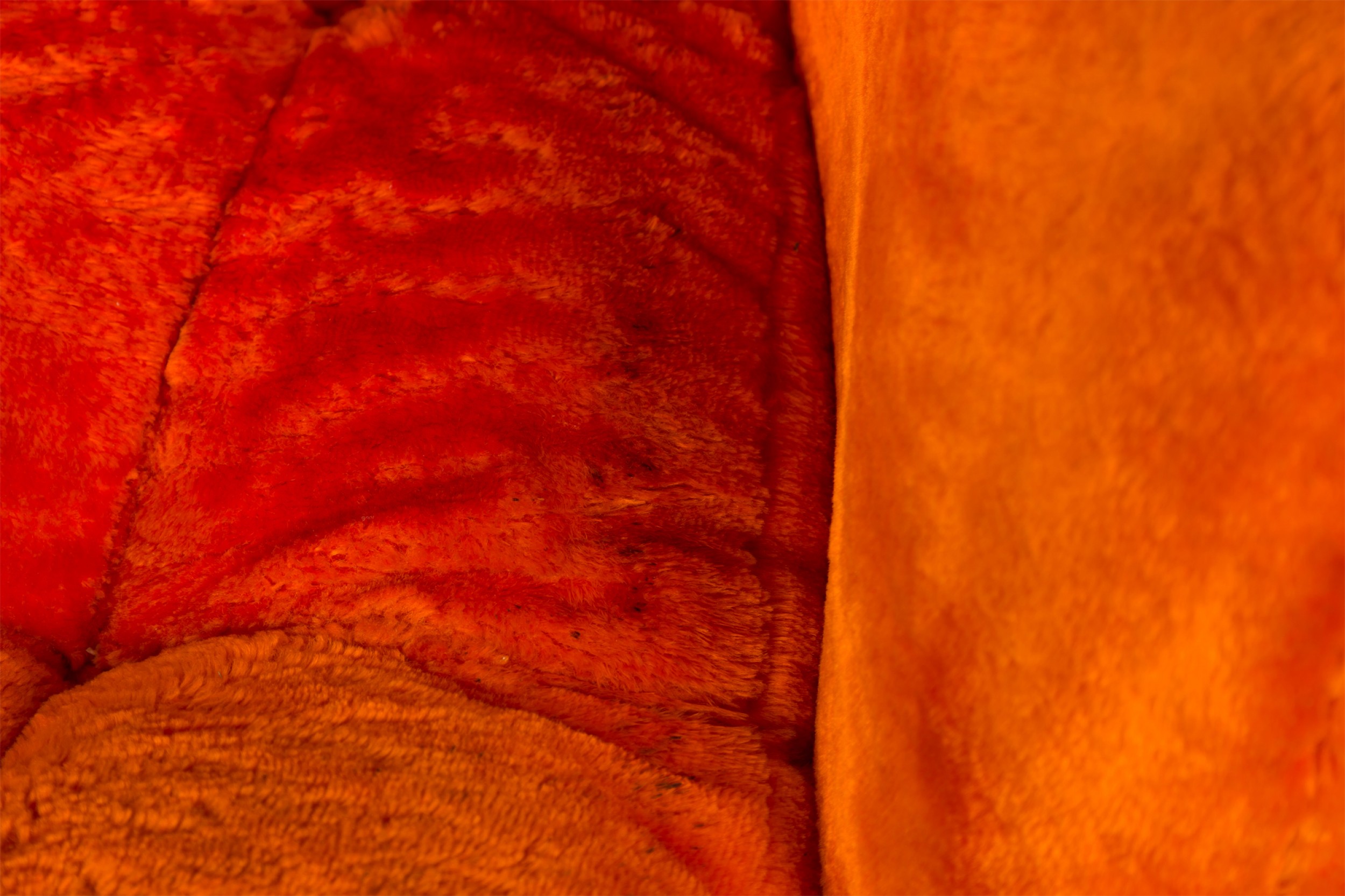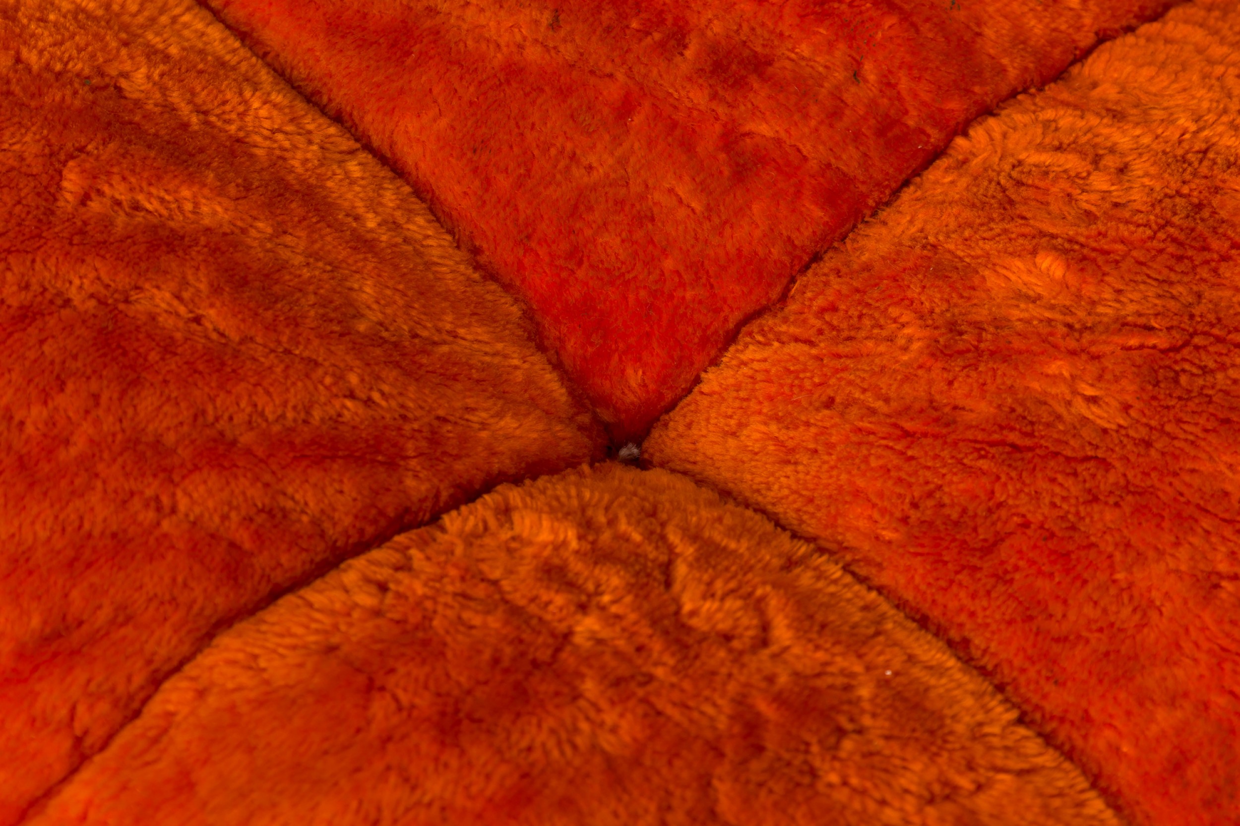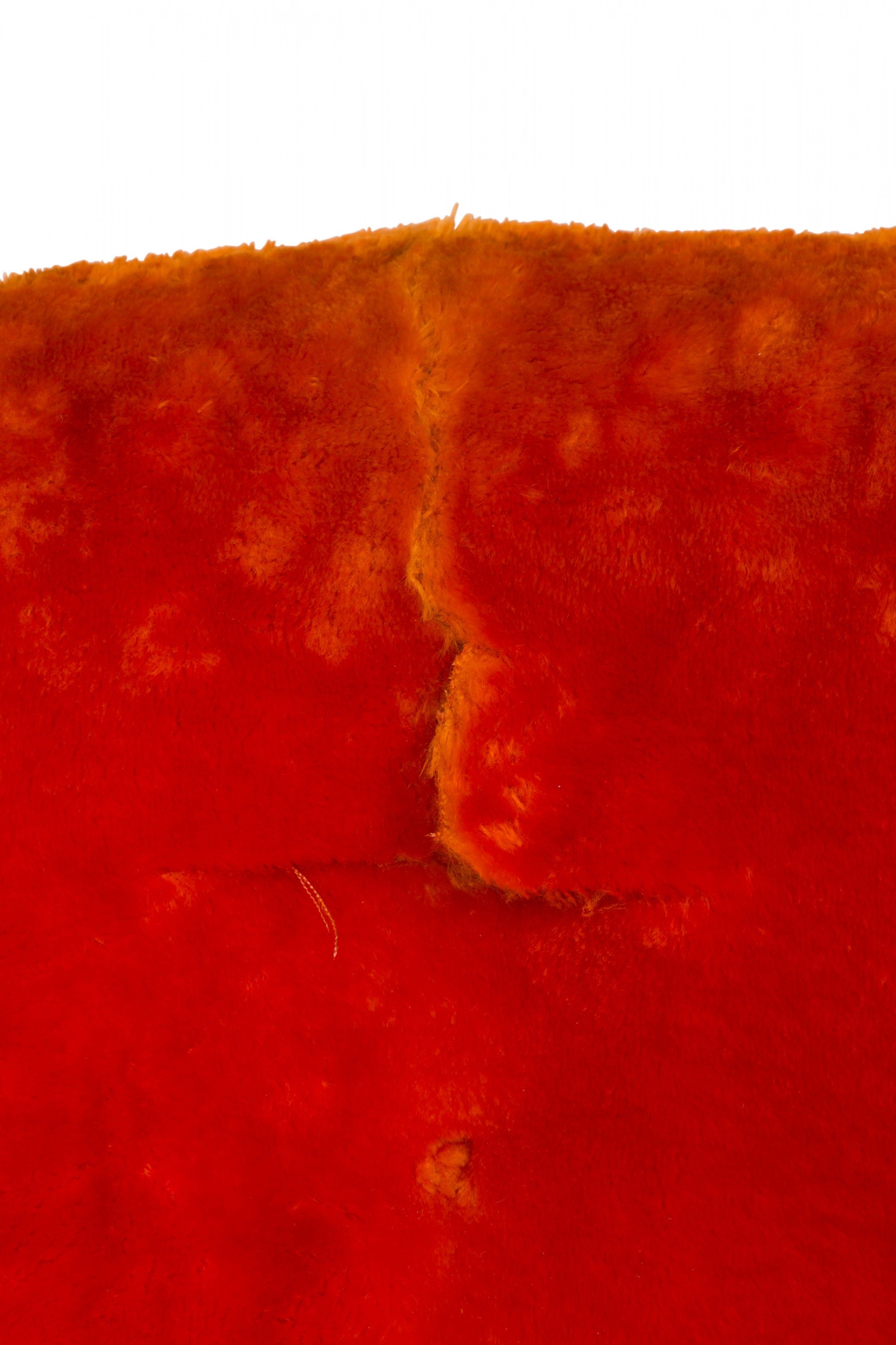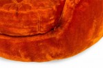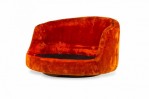 American Mid-Century 'Satellite' swiveling lounge / armchair with a circular form, curved back, and oversized seat, upholstered in bright orange faux fur upholstered with a removable button tufted seat cushion and two matching throw pillows. (MILO BAUGHMAN FOR THAYER COGGIN)