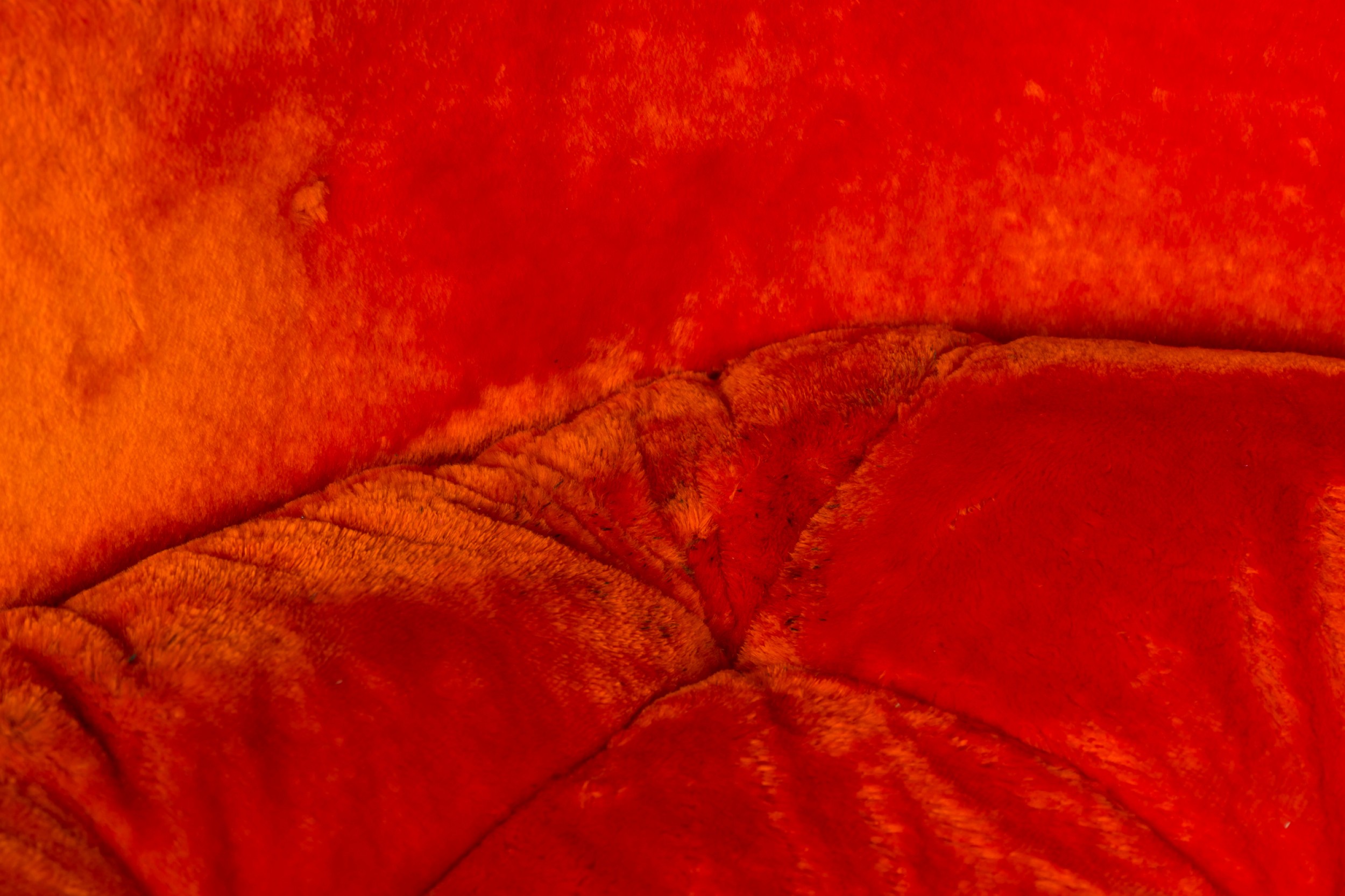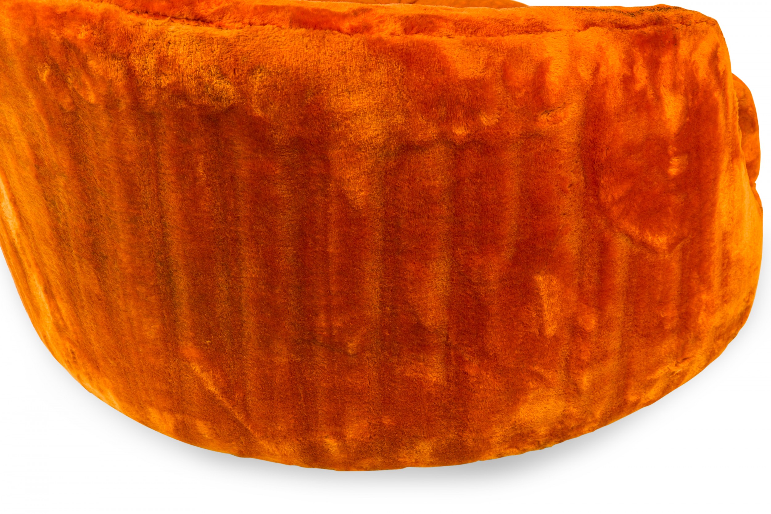 American Mid-Century 'Satellite' swiveling lounge / armchair with a circular form, curved back, and oversized seat, upholstered in bright orange faux fur upholstered with a removable button tufted seat cushion and two matching throw pillows. (MILO BAUGHMAN FOR THAYER COGGIN).