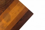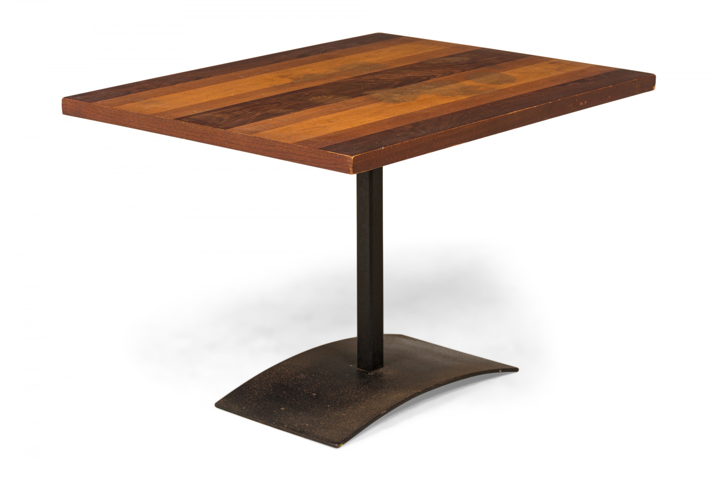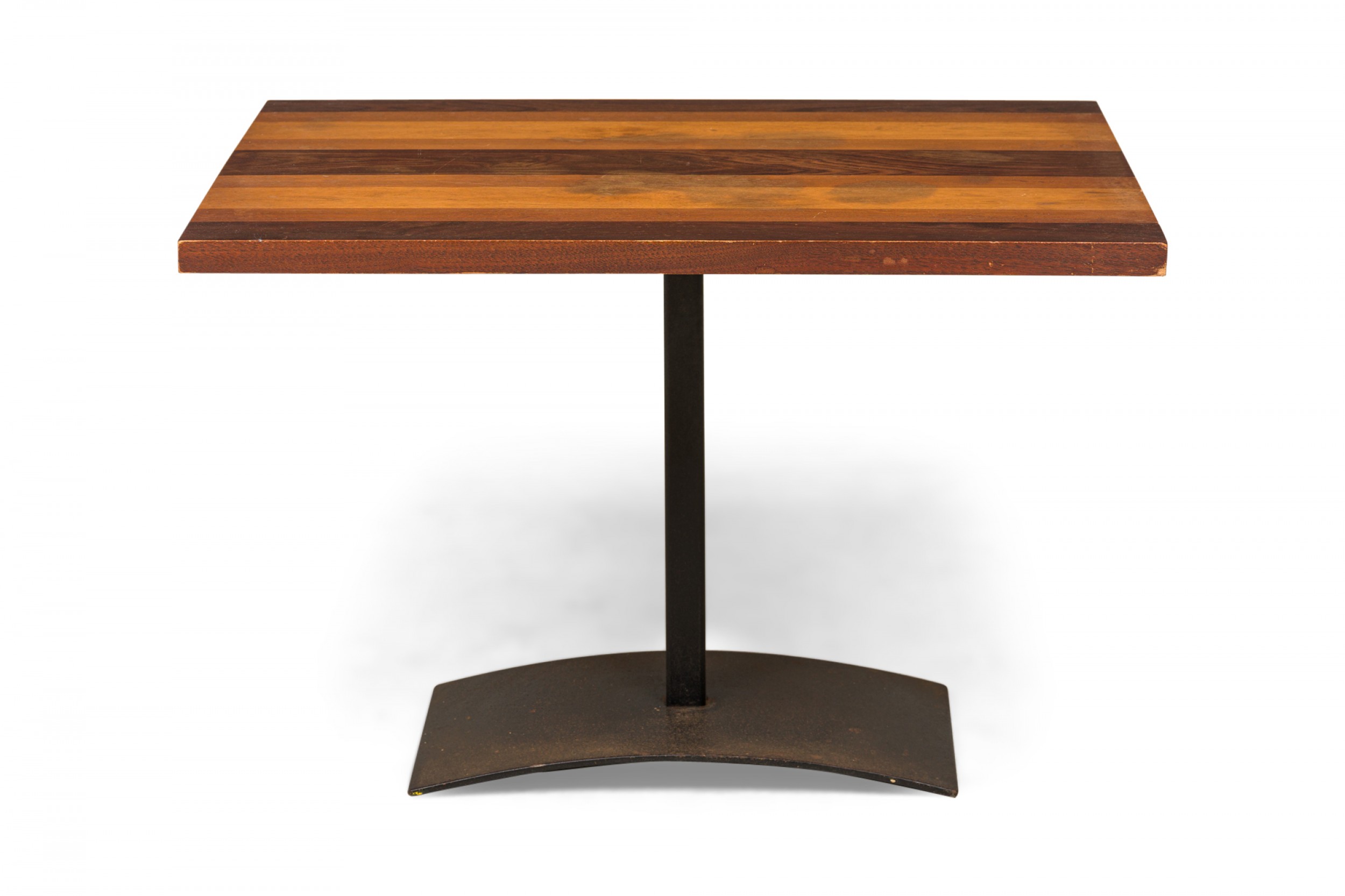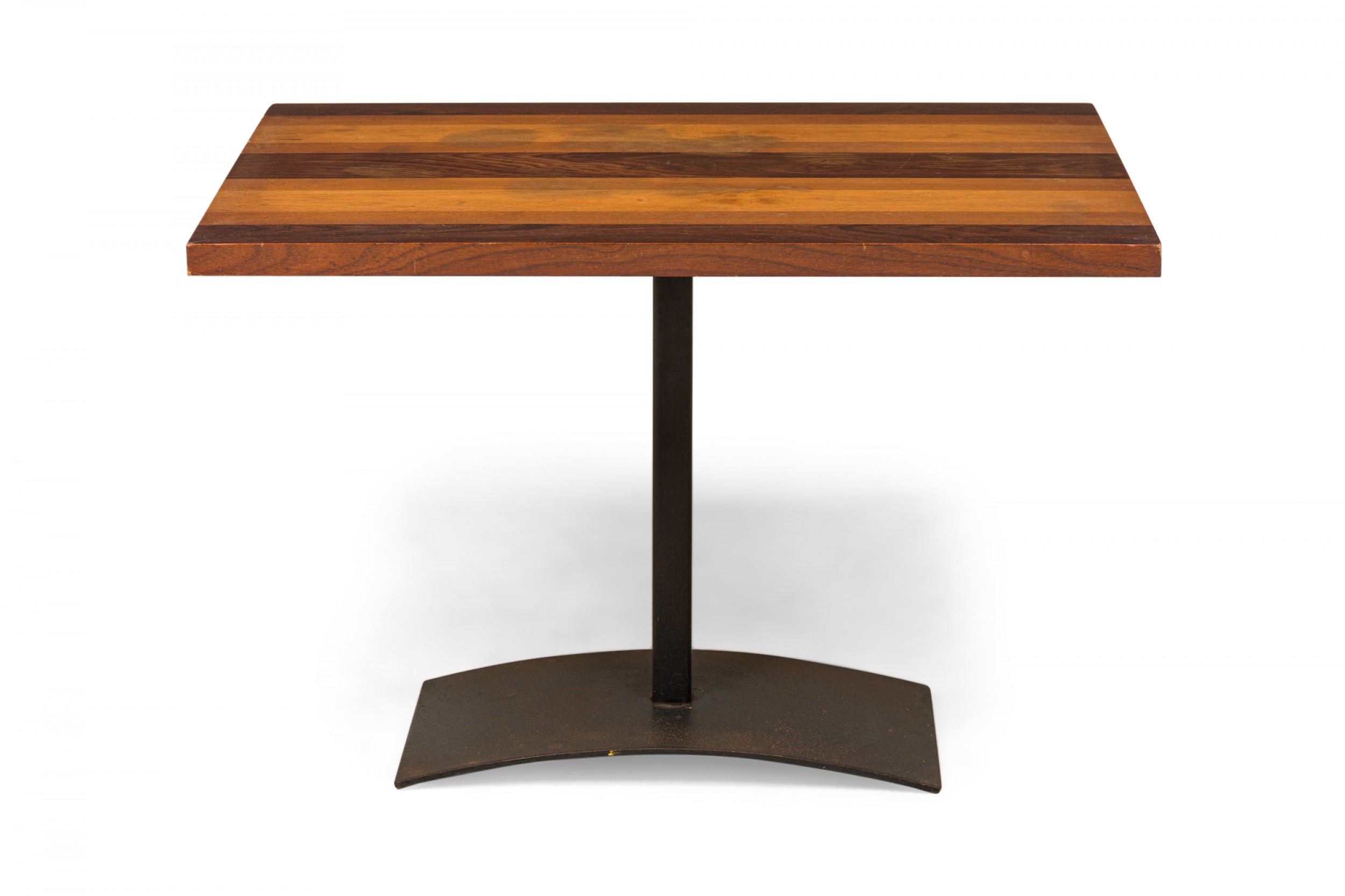 American Mid-Century rectangular end / side table with a tri-tone rectangular wooden top resting on an iron pedestal base with a domed rectangular foot. (MILO BAUGHMAN FOR THAYER COGGIN)