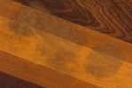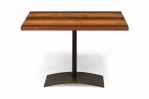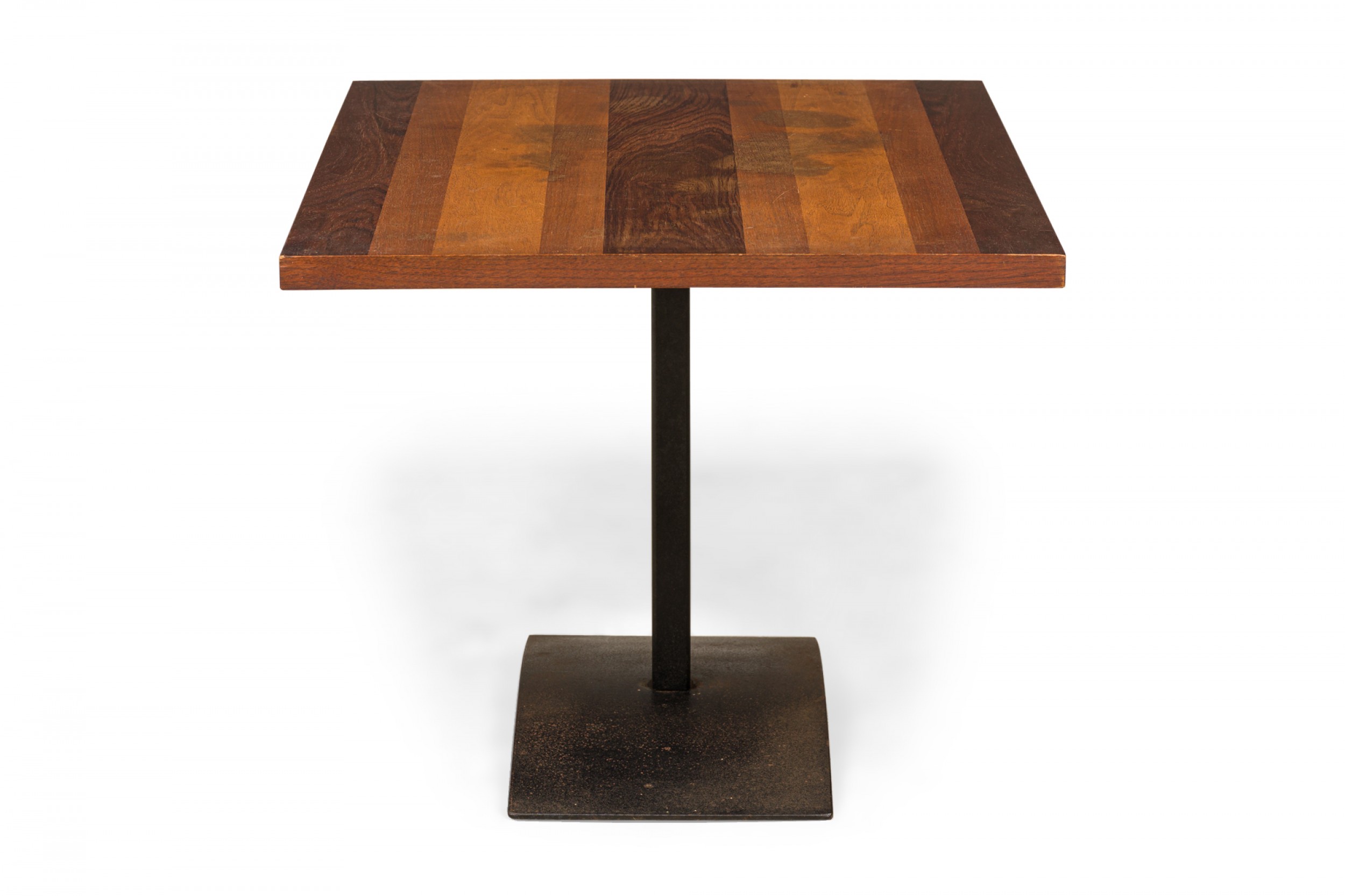 American Mid-Century rectangular end / side table with a tri-tone rectangular wooden top resting on an iron pedestal base with a domed rectangular foot. (MILO BAUGHMAN FOR THAYER COGGIN).